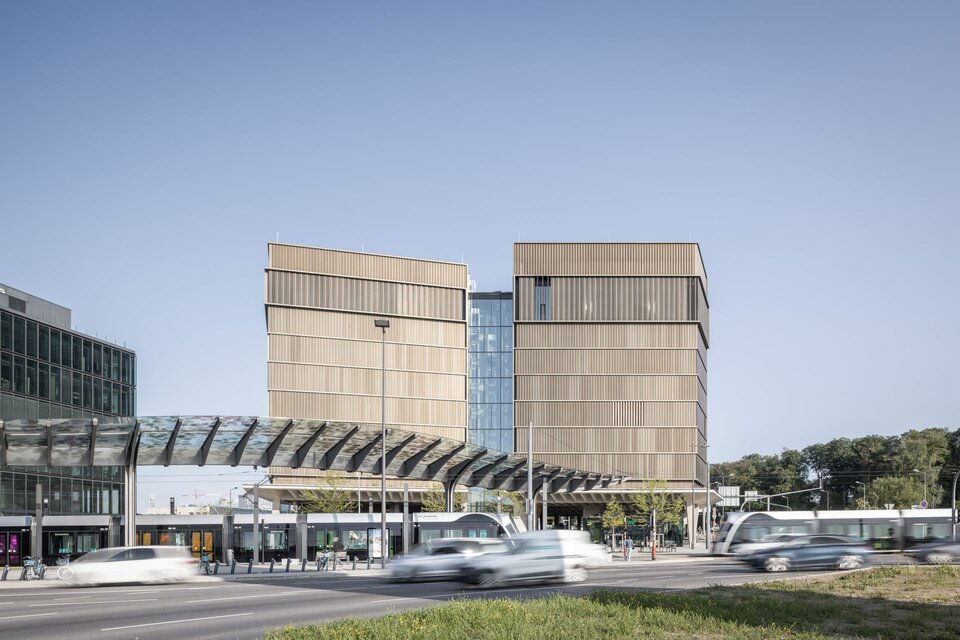 The Pôle d`Échange Serra is located directly opposite the Luxexpo exhibition and congress centre in Kirchberg, Luxembourg. The area combines a new bus terminal for regional buses and city buses, a Park & Ride car park with around 600 parking spaces and two office buildings with a total area of approx. 8,000 m². With the help of charging points for electric cars, a small kiosk and high security measures at the bus station, the project aims to make the switch from car to public transport more attractive.
