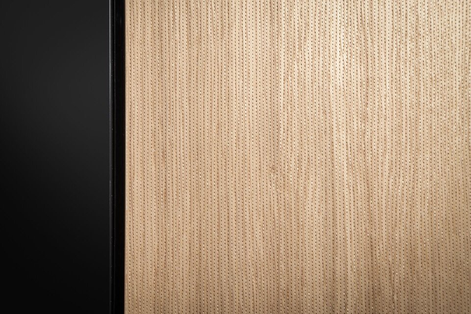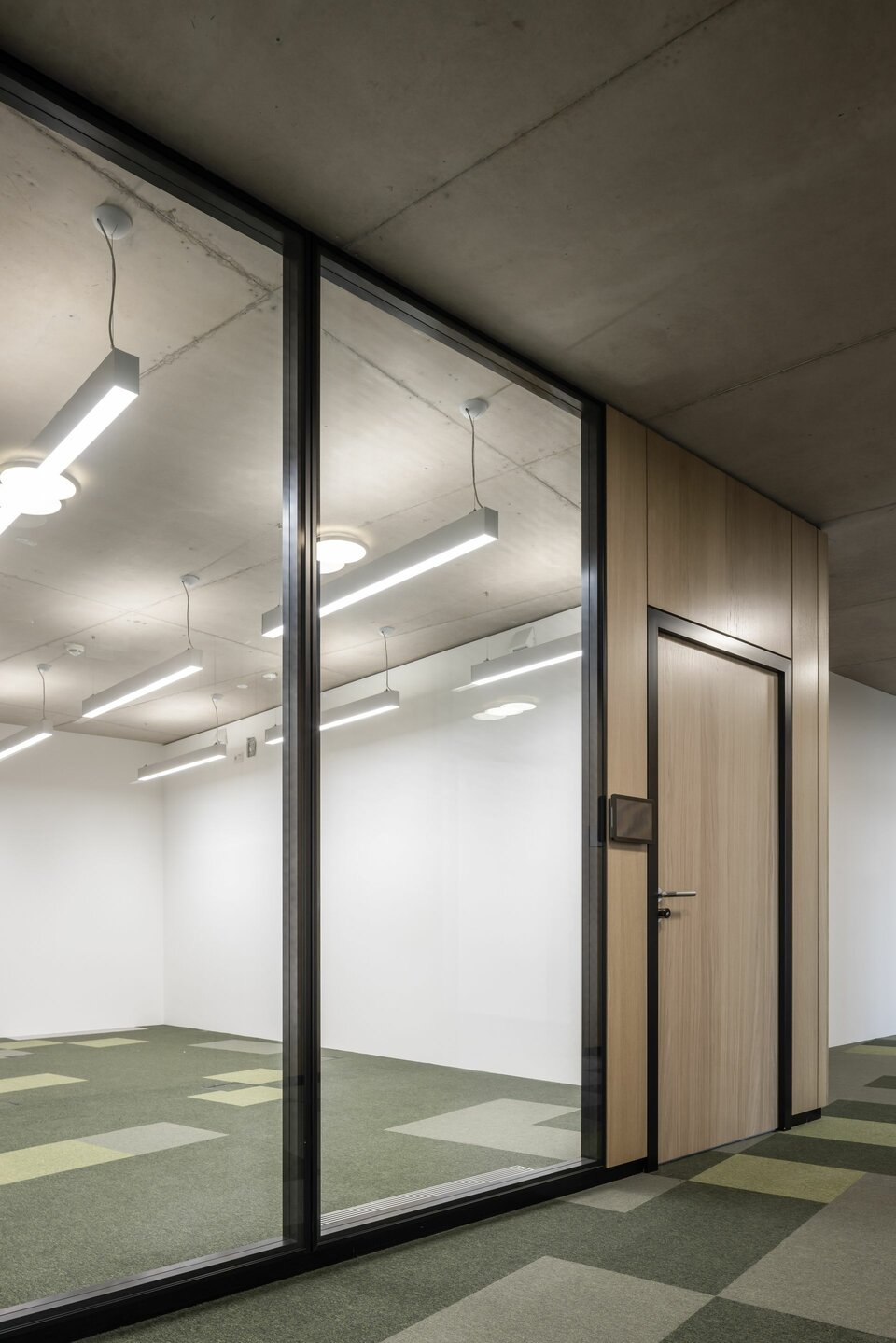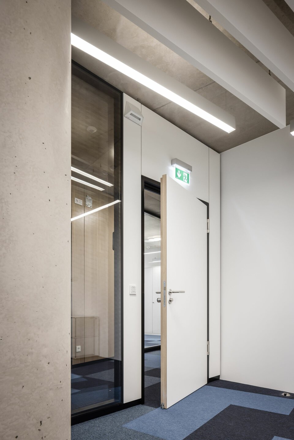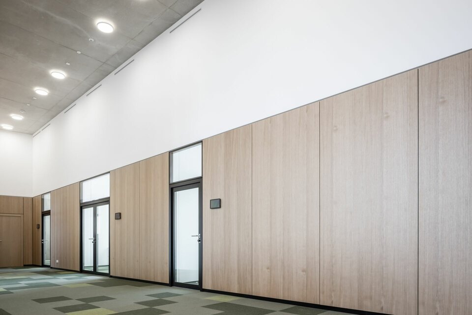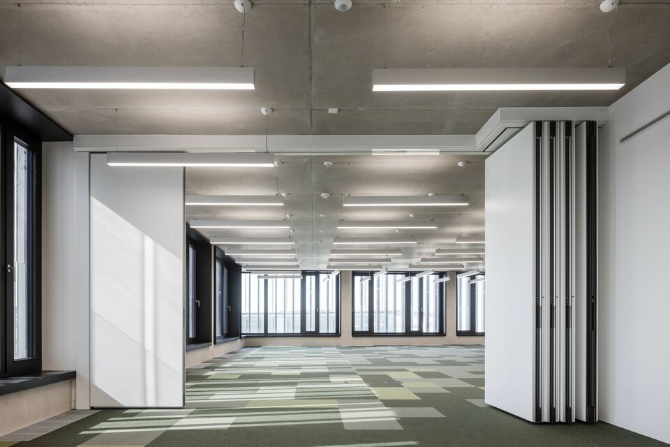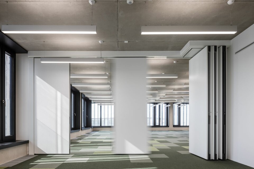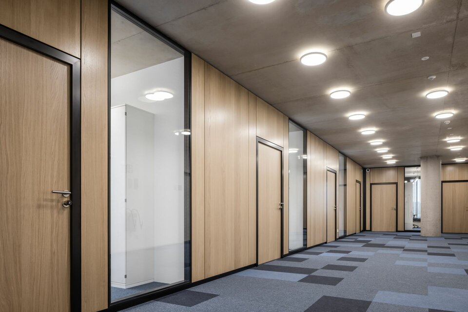 Lindner Group was involved in the development of the office space. The original contract covered the floor and partition trades, including the installation of the NORTEC raised floor with fitted carpet and the use of timber and glass partitions. These were complemented by matching door systems and wooden wall claddings. Due to the customer's high level of satisfaction with Lindner's services, the order was quickly extended during the interior fit-out work: As a result, Lindner realised impressive Ecophon acoustic baffles for the meeting rooms. In addition, mobile partition walls should now find their way into the 4th and 7th floors. The room height of over 5 m on the 7th floor made the installation challenging: However, thanks to the static design and subsequent execution of a steel construction clad with plaster, the connection of the 4 m high partition wall could be carried out without any problems. Another highlight of the interior fit-out are the wall absorbers in the meeting rooms, which also serve as acoustic pictures. The perforated CPL panel was created in cooperation with Topakustik using a new production method. The perforation pattern corresponds to a Morse code, which stands for the Luxembourg national anthem.
