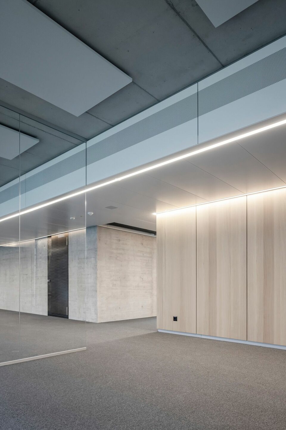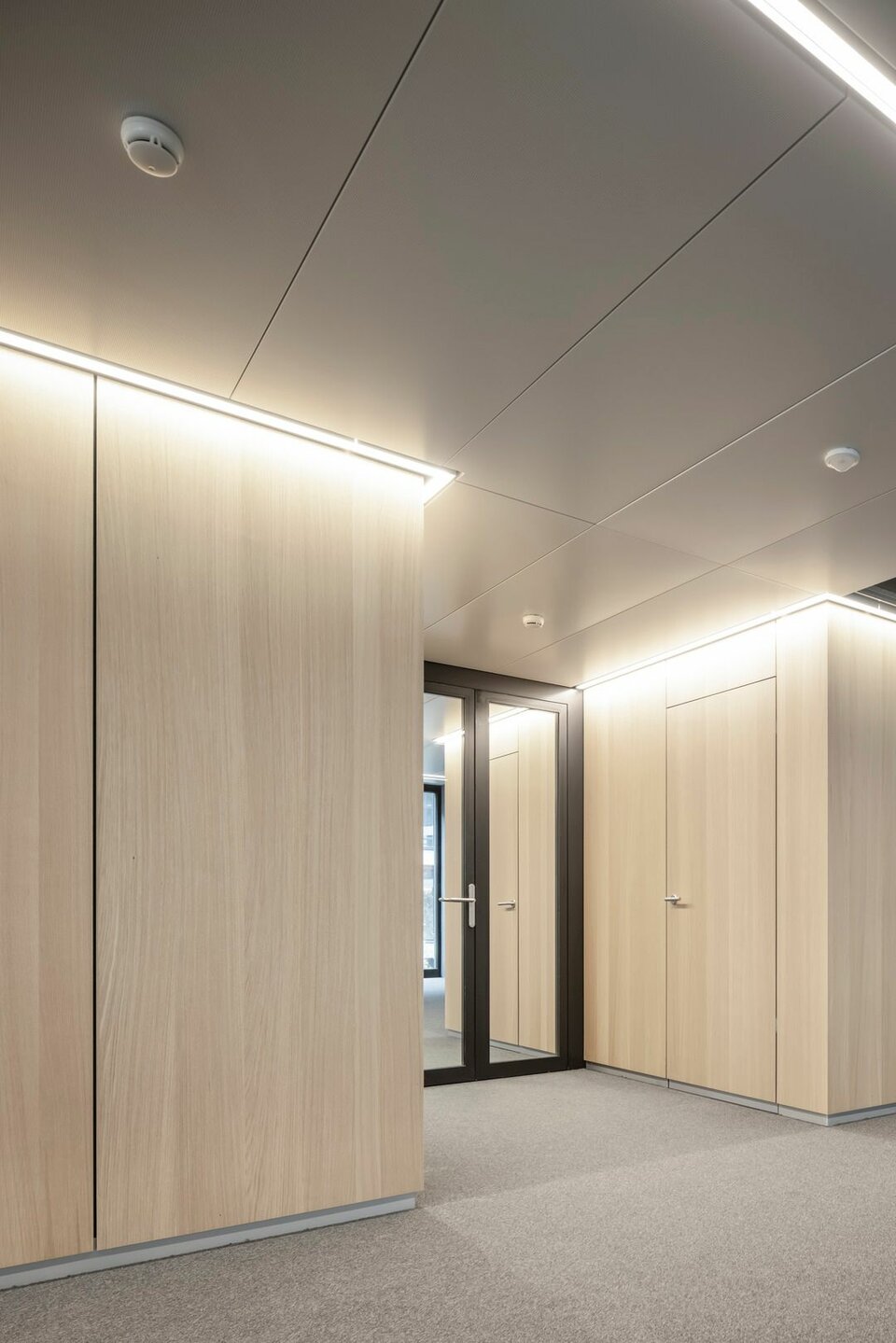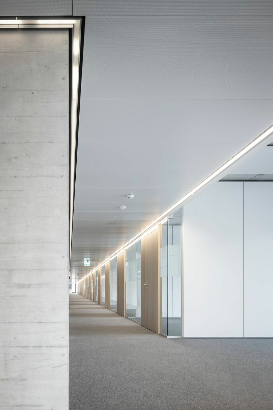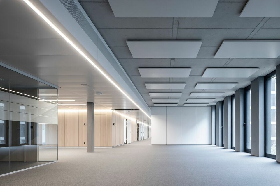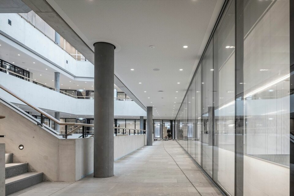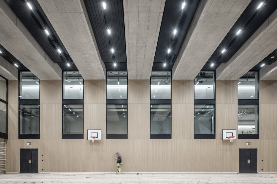 Lindner SE, with its regional office in Opfikon, was involved in the PJZ with an extensive interior fit-out of glass and wood walls, wall absorbers and door elements, and produced numerous special solutions. For example, Lindner glass partitions and aluminium-glass doors were used to create separate meeting and working areas in the otherwise open-plan offices, complemented by light wooden wall panels, matching wooden doors and acoustically effective metal wall panels. The structural highlight of the building is the two-storey internal façade facing the gymnasium, which not only meets the strict requirements for earthquake, fall and fire safety, but is also an impressive architectural detail. The oversized windows were prefabricated at the Lindner factory and then installed on site by crane.