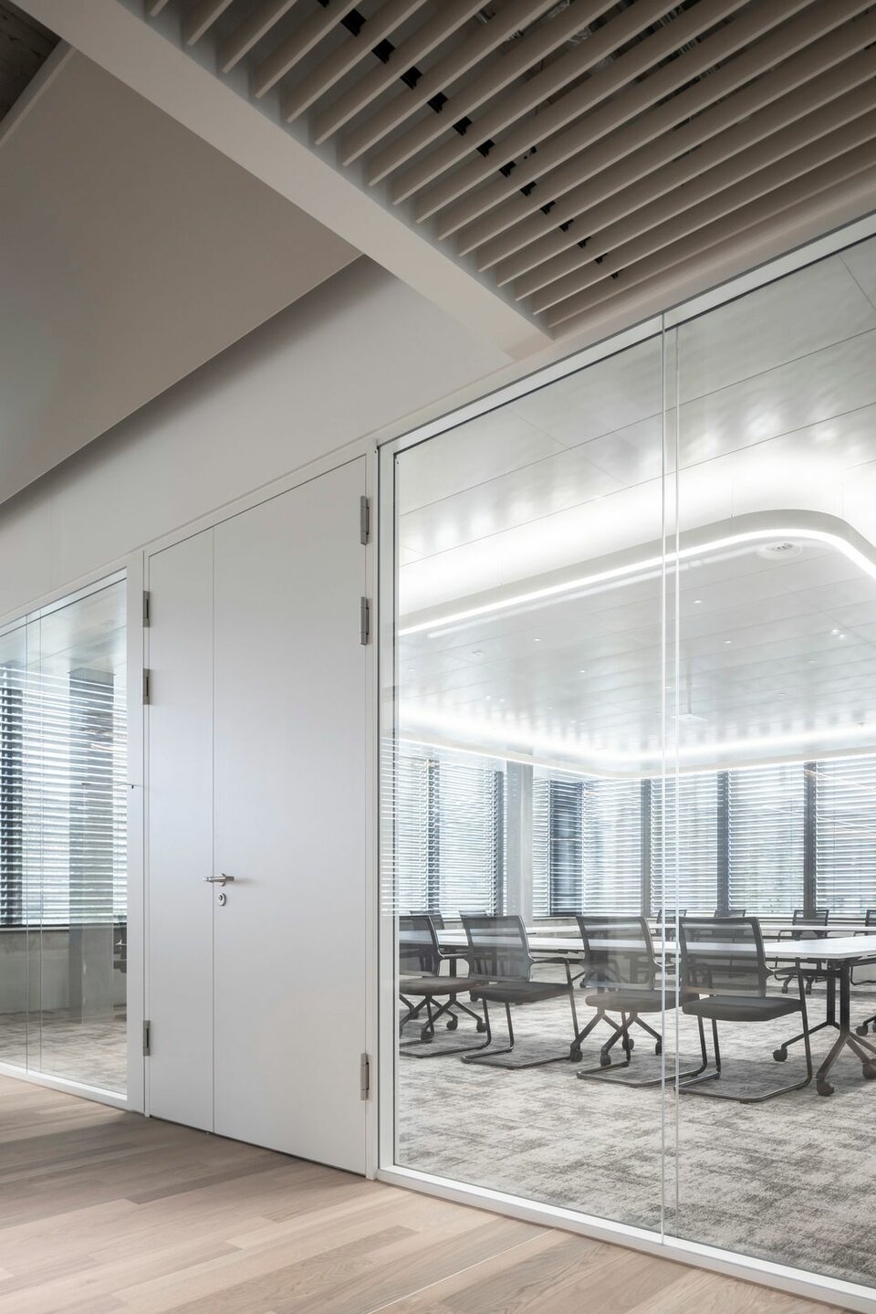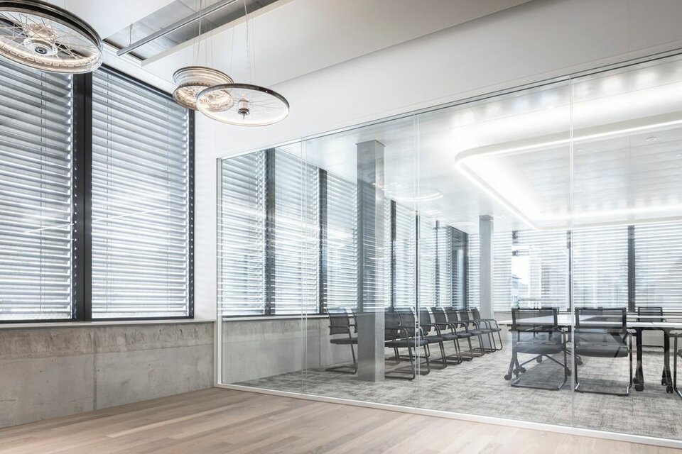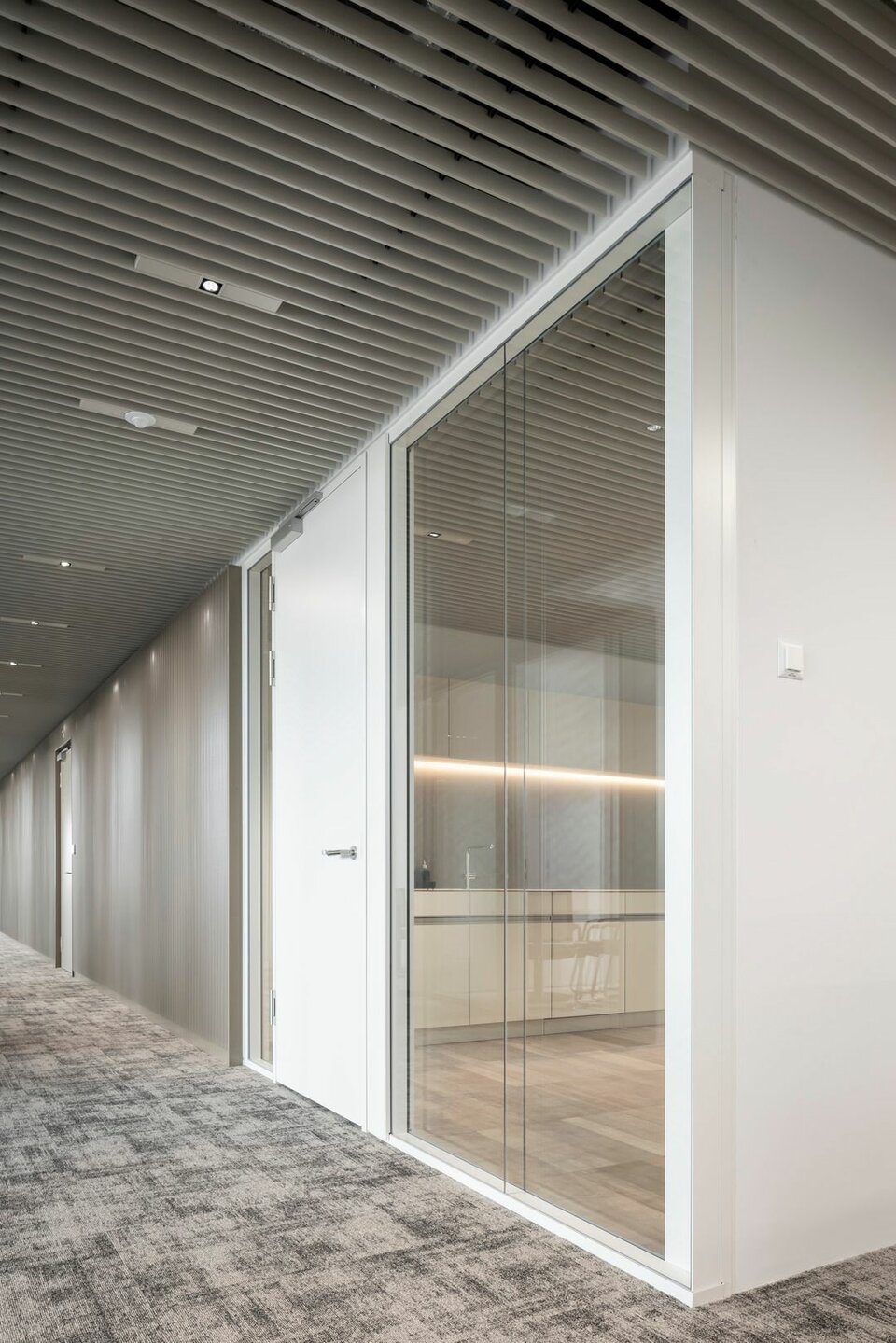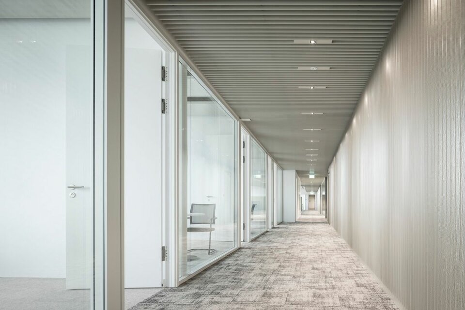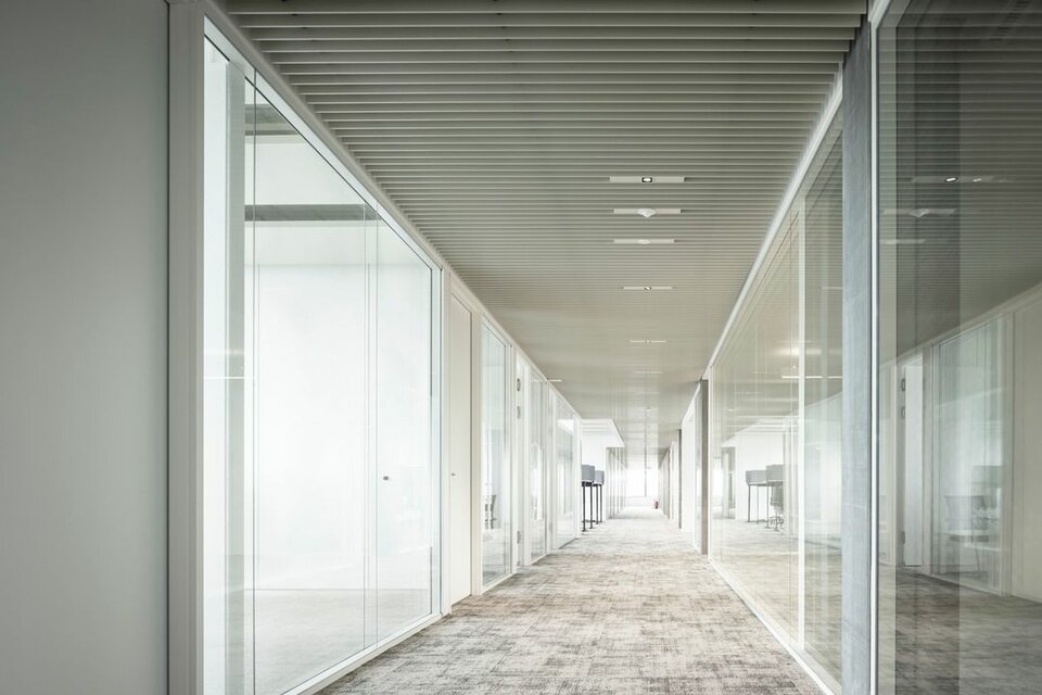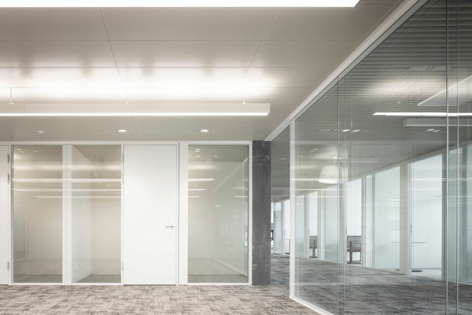The Lindner Life Clear was chosen for the spatial separation of individual offices and meeting rooms. Lindner actually developed the fully glazed without any uprights and narrow aluminium profiles for the Zurich Police and Justice Center. Since this was also a project in Switzerland, the Life Clear already met the strict local requirements in terms of fire protection, earthquake safety and acoustics. To match the fully glazed partition system, the Lindner door factory in Ostrov produced floor-to-ceiling wooden doors in white HPL decor. Additionally, revisable switch panels were installed. In some cases, wooden partitions or classic dry lining were also used between the individual rooms, supplemented by a number of special wall closures that were concealed in the partition system. In the entrance areas with increased fire protection requirements, Lindner installed glass partition elements of the Lindner Life Stereo 125 type and wooden doors with a thickness of 49 mm and EI 30 approval. In addition, Lindner floor bulkheads were used, which ensured both increased fire protection and improved the Rw value to 44 dB.