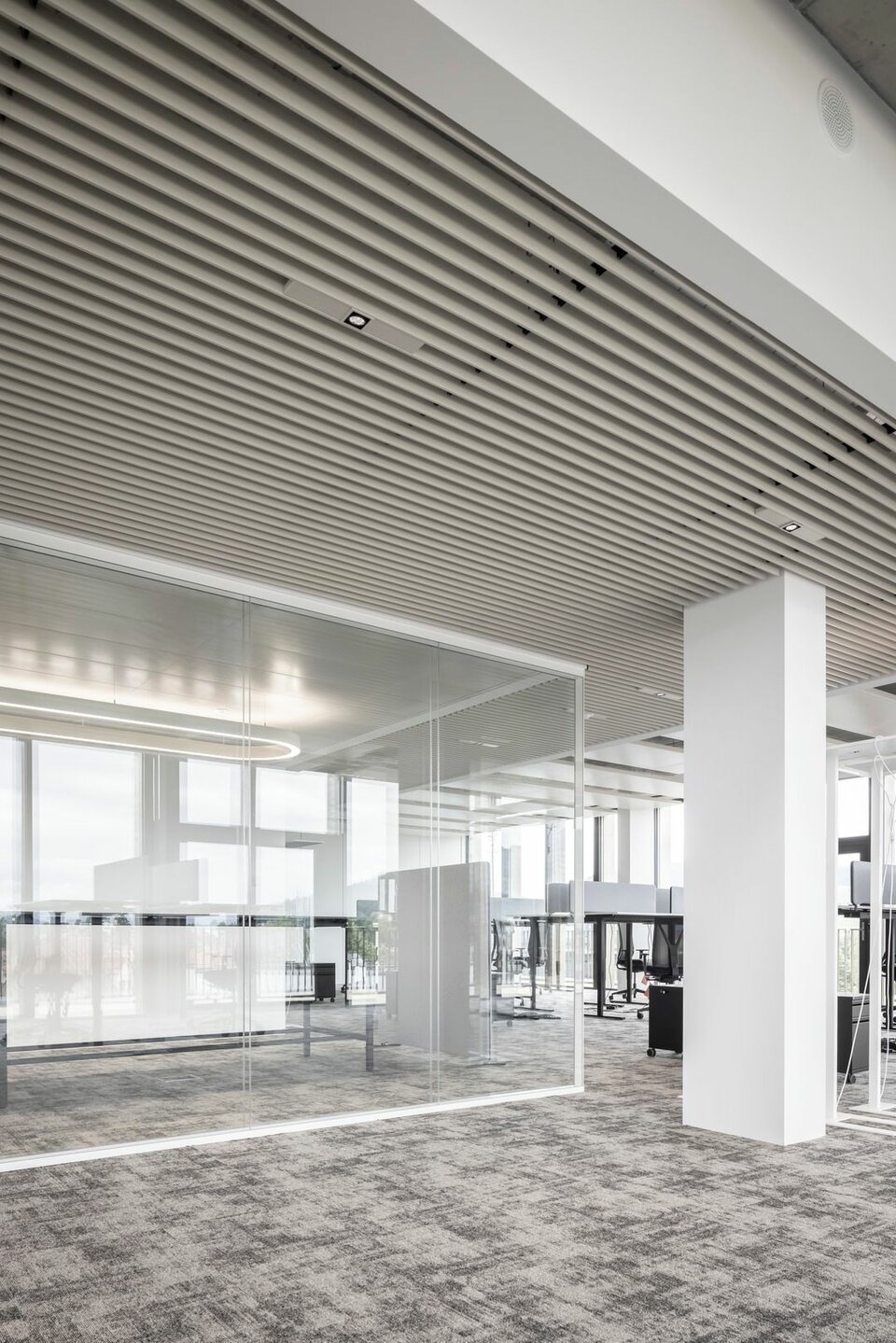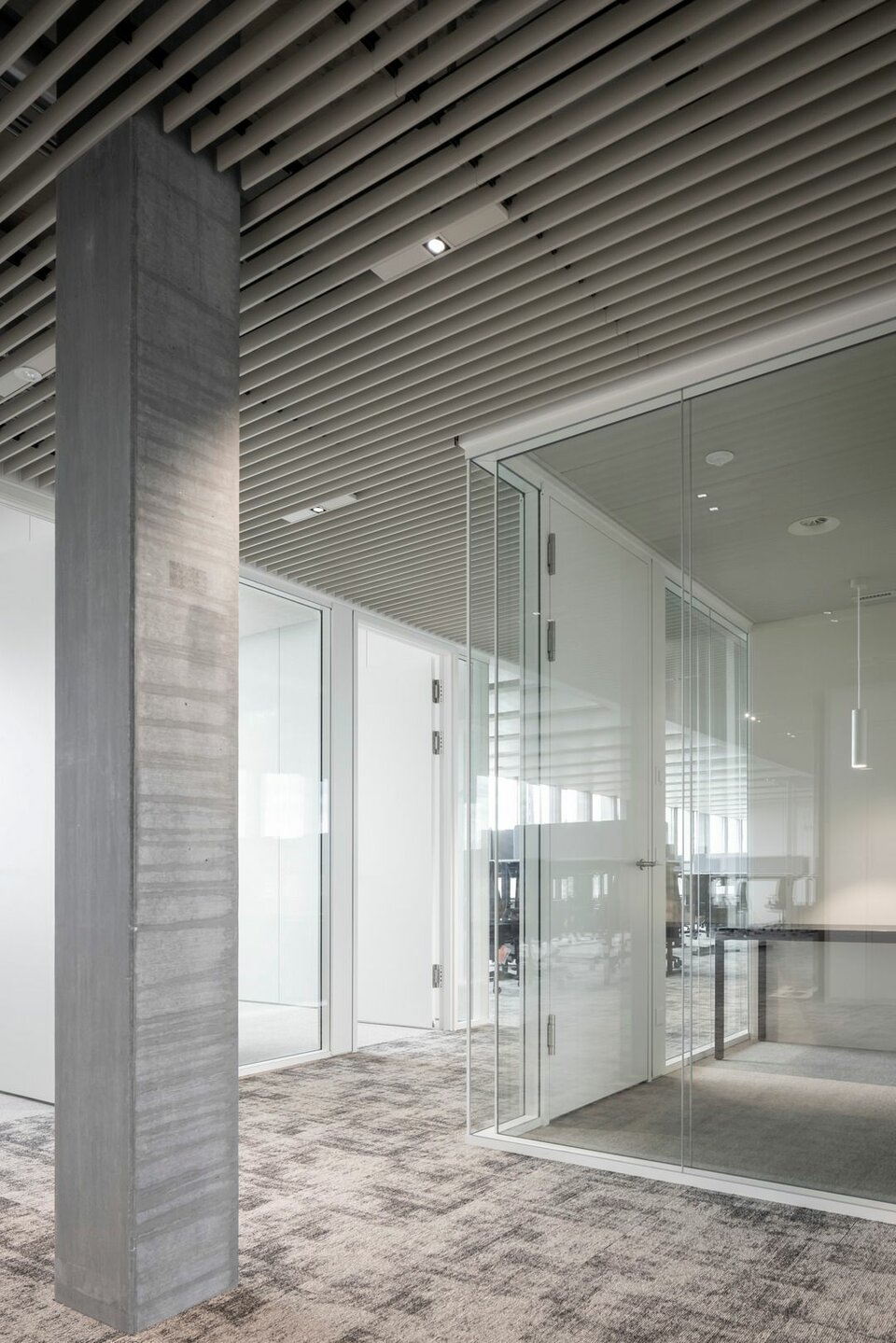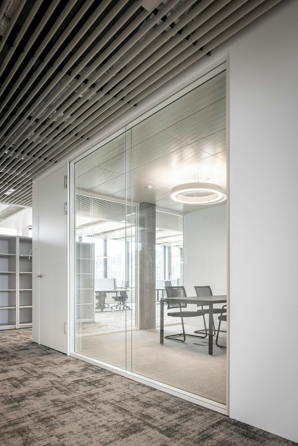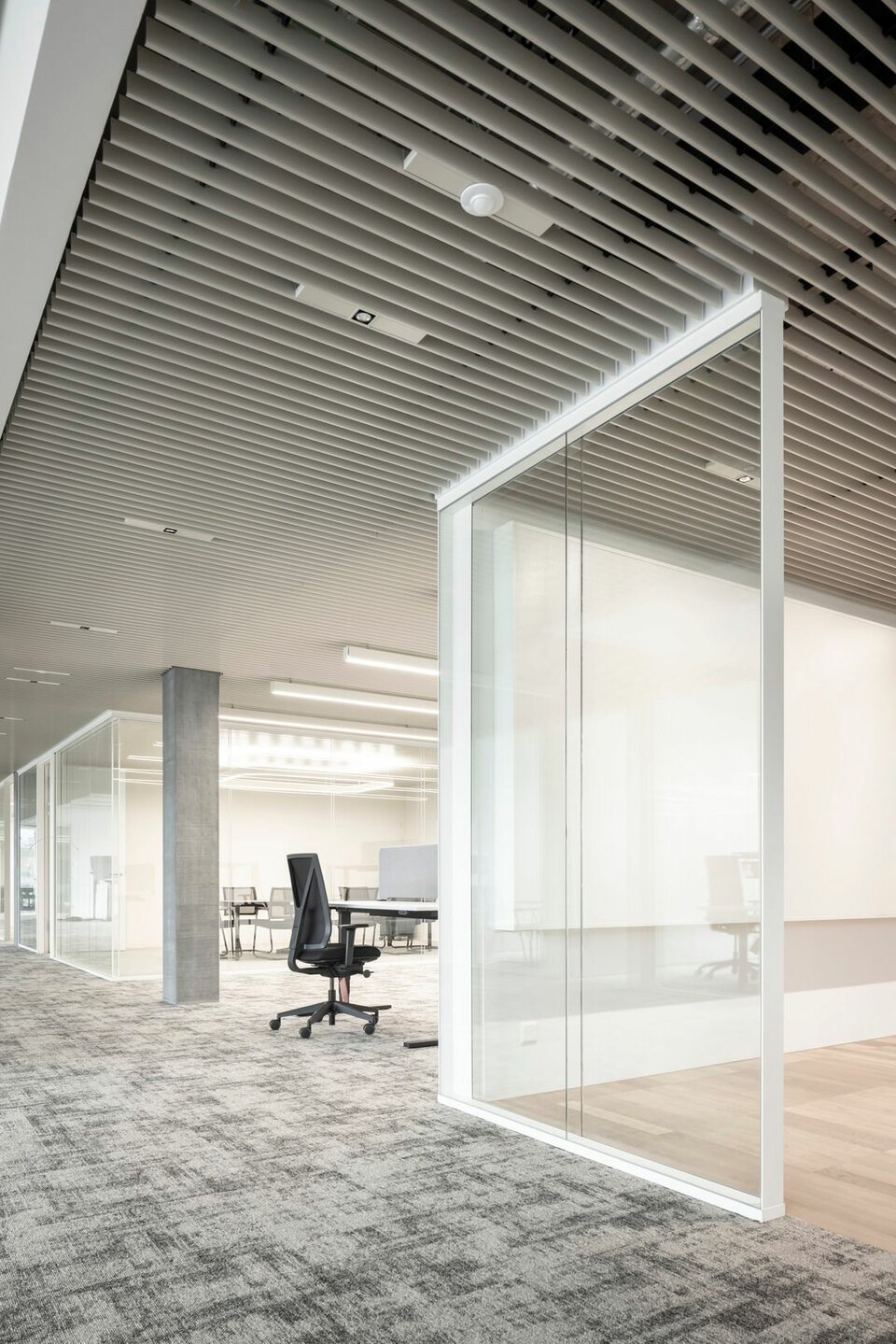 The Lindner Life Clear was chosen for the spatial separation of individual offices and meeting rooms. Lindner actually developed the fully glazed without any uprights and narrow aluminium profiles for the Zurich Police and Justice Center. Since this was also a project in Switzerland, the Life Clear already met the strict local requirements in terms of fire protection, earthquake safety and acoustics. To match the fully glazed partition system, the Lindner door factory in Ostrov produced floor-to-ceiling wooden doors in white HPL decor. Additionally, revisable switch panels were installed. In some cases, wooden partitions or classic dry lining were also used between the individual rooms, supplemented by a number of special wall closures that were concealed in the partition system. In the entrance areas with increased fire protection requirements, Lindner installed glass partition elements of the Lindner Life Stereo 125 type and wooden doors with a thickness of 49 mm and EI 30 approval. In addition, Lindner floor bulkheads were used, which ensured both increased fire protection and improved the Rw value to 44 dB.