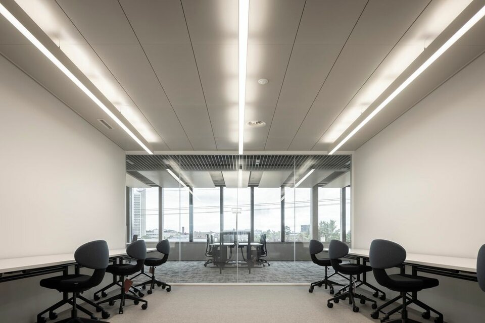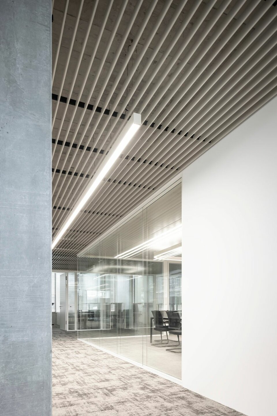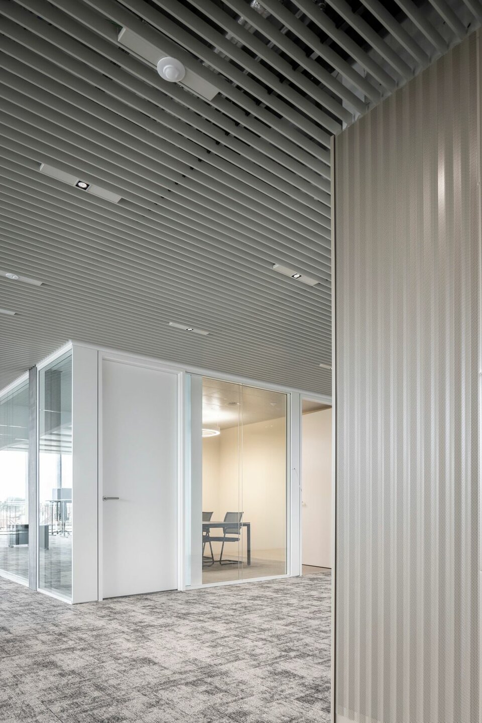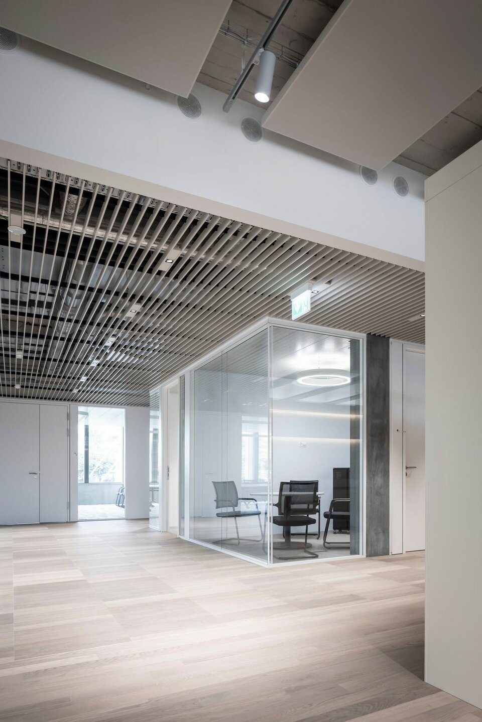 The Lindner Life Clear was chosen for the spatial separation of individual offices and meeting rooms. Lindner actually developed the fully glazed without any uprights and narrow aluminium profiles for the Zurich Police and Justice Center. Since this was also a project in Switzerland, the Life Clear already met the strict local requirements in terms of fire protection, earthquake safety and acoustics. To match the fully glazed partition system, the Lindner door factory in Ostrov produced floor-to-ceiling wooden doors in white HPL decor. Additionally, revisable switch panels were installed. In some cases, wooden partitions or classic dry lining were also used between the individual rooms, supplemented by a number of special wall closures that were concealed in the partition system. In the entrance areas with increased fire protection requirements, Lindner installed glass partition elements of the Lindner Life Stereo 125 type and wooden doors with a thickness of 49 mm and EI 30 approval. In addition, Lindner floor bulkheads were used, which ensured both increased fire protection and improved the Rw value to 44 dB.