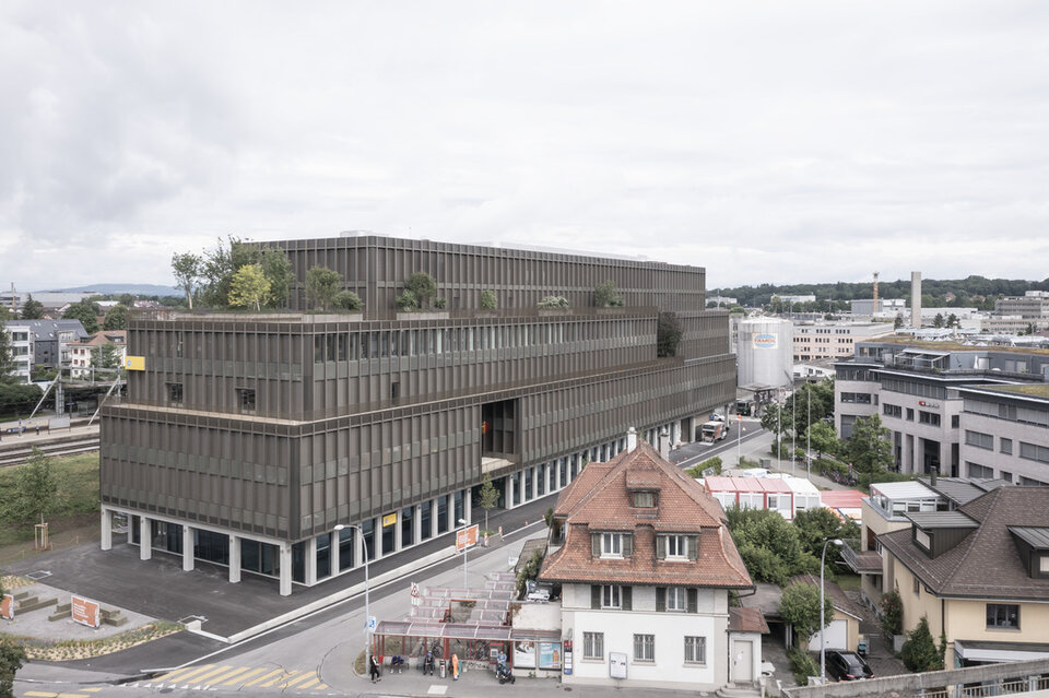 The former industrial area of the "Acifer-Halle" is directly adjacent to the Ostermundigen railway station. For reasons of noise protection, it was shut down years ago and the site has been fallow since then. Thanks to the takeover by the project developer HRS Real Estate AG, more movement returend to the area. A suitable place for the Touring Club Switzerland (TCS), which is now bundling its German-speaking Swiss administrative locations here as a long-term tenant. A total of 650 new jobs as well as retail and commercial space on the ground floor were created on a usable area of over 18,000 m². With a brown color scheme, the facade refers to the former industrial use. The terraces on every floor and roof greening ensure a dynamic exterior architecture. Inside, however, the focus was on a bright and calm design with lots of white, light wood tones and grey-patterned carpets.