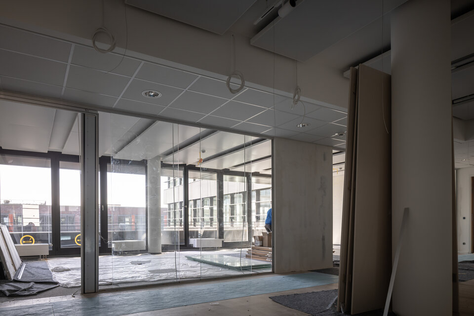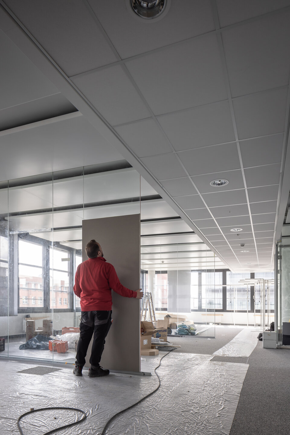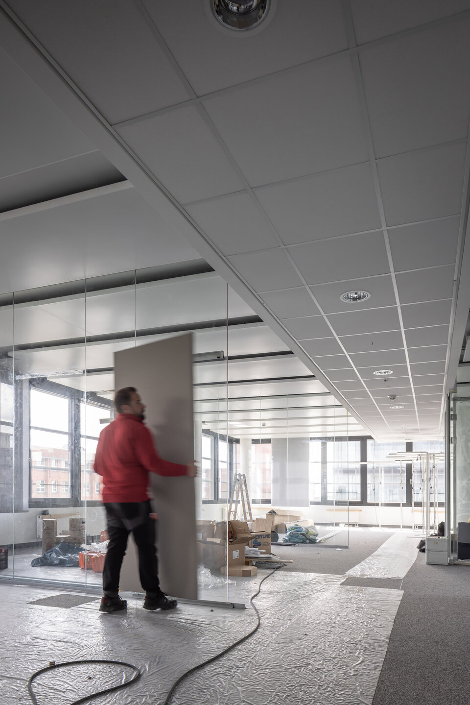 In addition to the absorbers glass partition systems are also set to be reused. Thanks to their modular design, the elements can be flexibly integrated into the new room layouts without any loss of quality.