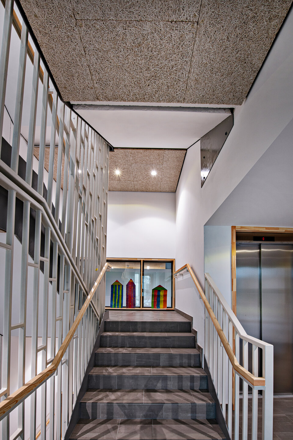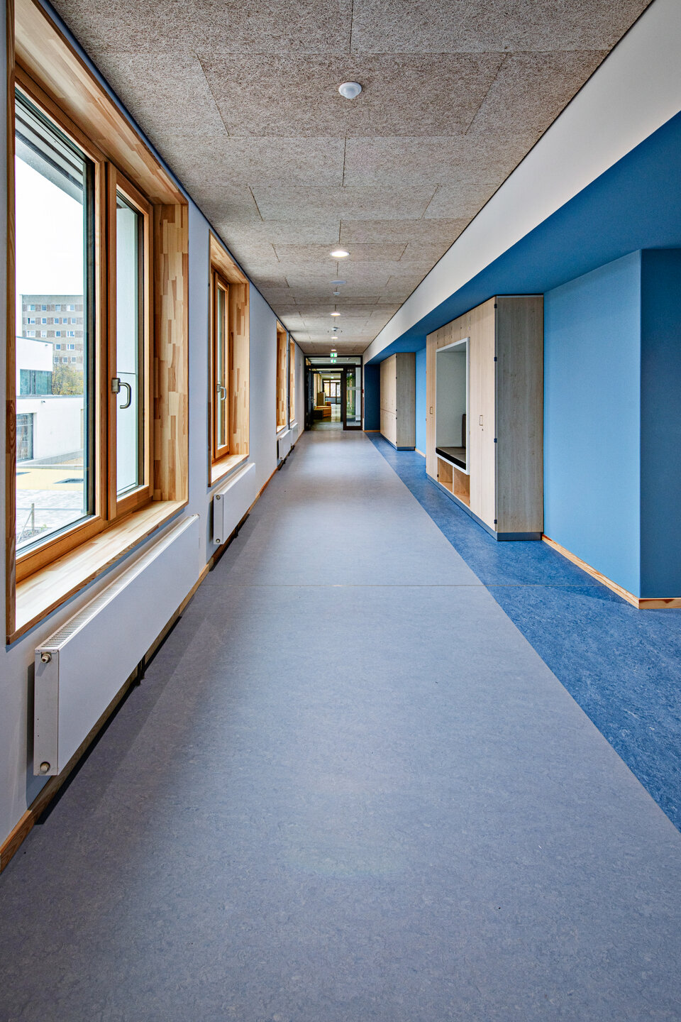 The completed acoustic construction work ensures balanced room acoustics in the classrooms, corridors, and common areas.