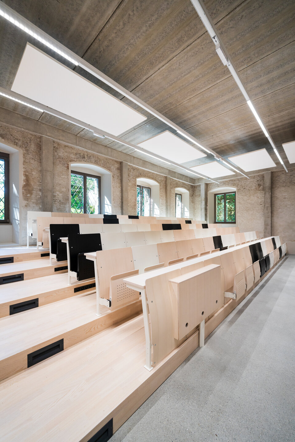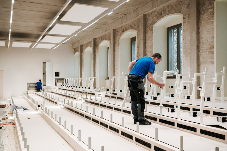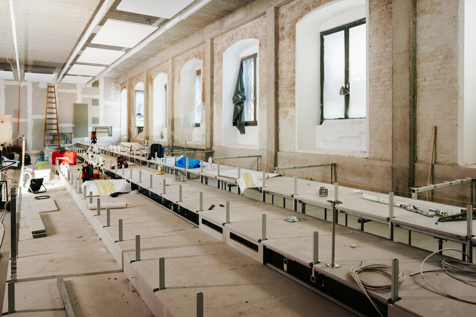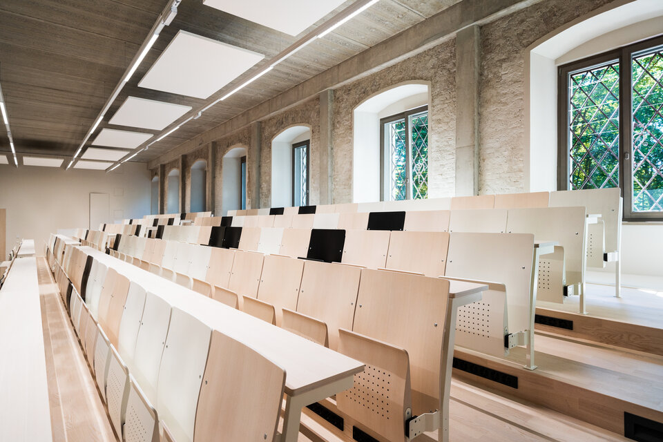 Lindner GmbH was involved in the redesign of the lecture theatre, focusing on the construction of a tiered seating area, fully built using the FLOOR and more® arena hollow-floor system. The high level of prefabrication allows the floor system to be assembled quickly. Both the tiered seating structure and the panels laid on it are made from these floor elements, which provide not only stability but also enhanced fire safety. The seating area is further enhanced by integrated step swirl diffusers, creating a pleasant ambience.