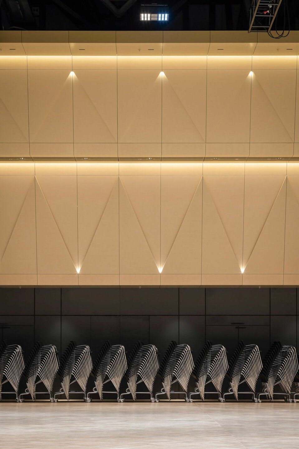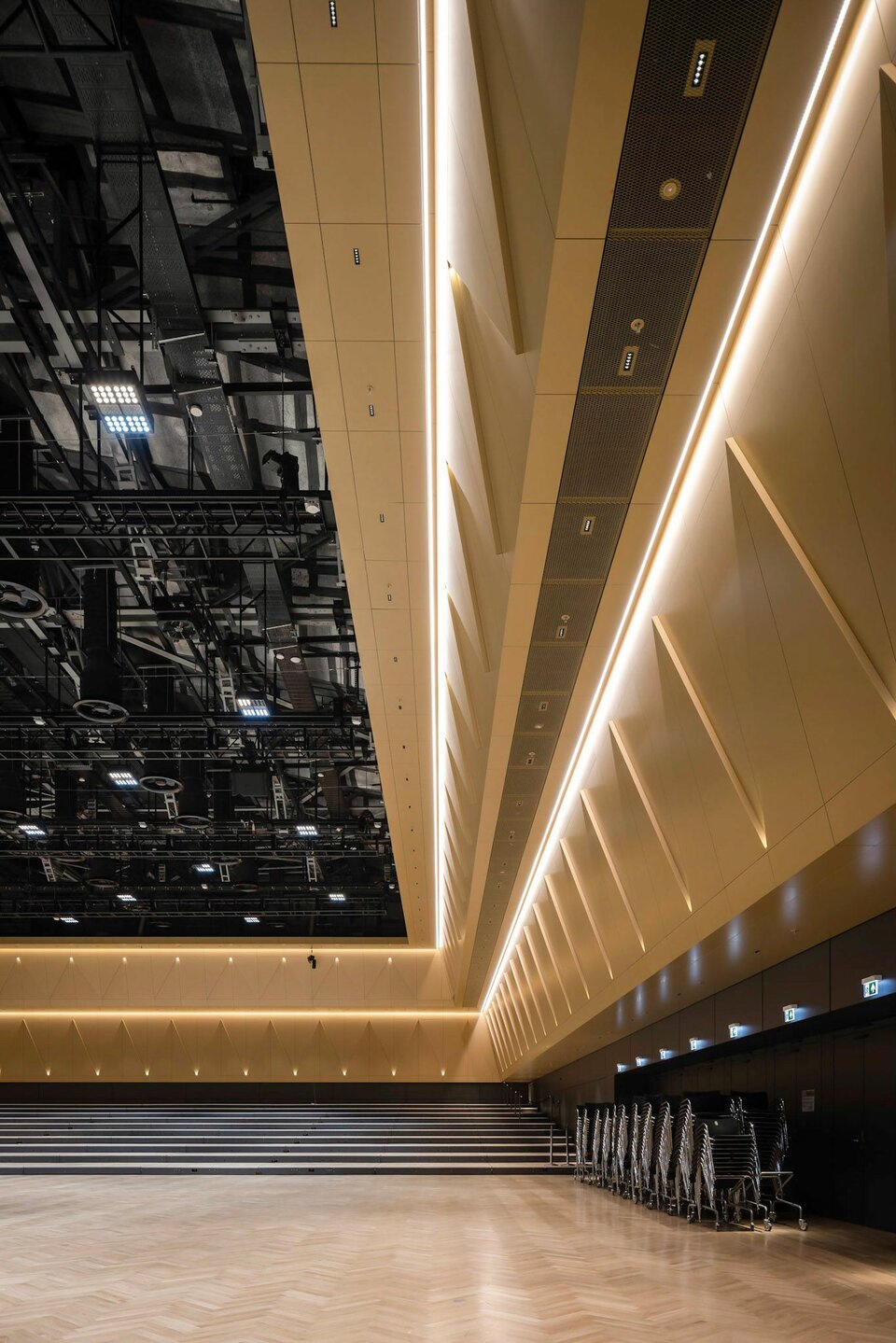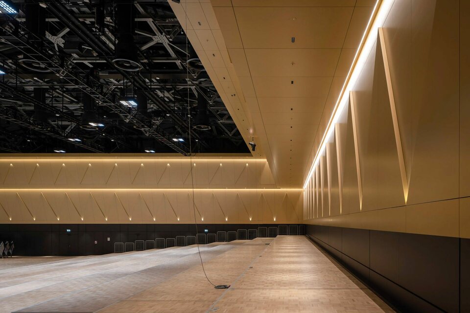 Lindner's contribution to the conversion of the event venue on the banks of the Rhine included wall and ceiling cladding as well as doors. The congress hall is now fitted with flame-retardant acoustic wall cladding with integrated T30 RS doors and integrated folding sliding doors up to a height of 3.30 metres. From a height of 3.30 metres, non-combustible COMPlacq acoustic wall cladding was installed, which is also the visual highlight of the building. The wall cladding in gold and anthracite, made of wood and aluminium, refers to the name of the Rheingoldhalle with diamond-shaped reliefs and golden mosaics. The ten-storey retractable grandstand and the open ceiling area complete the conversion work.
