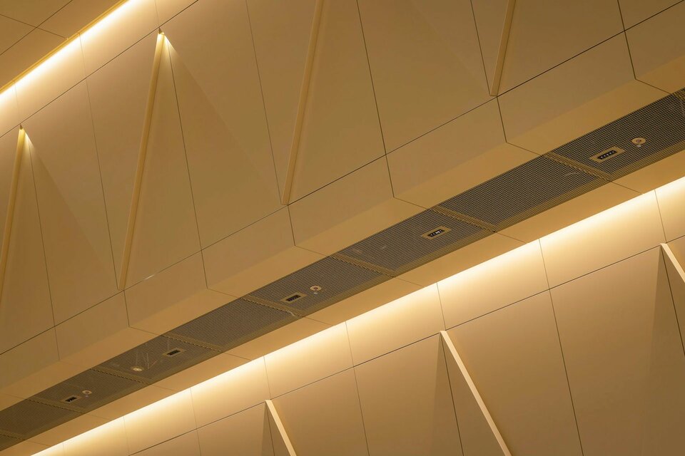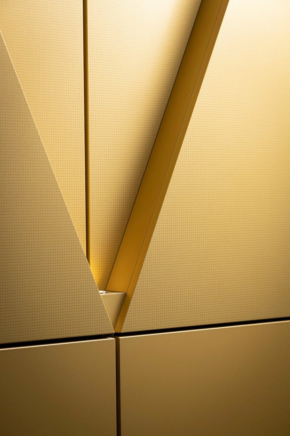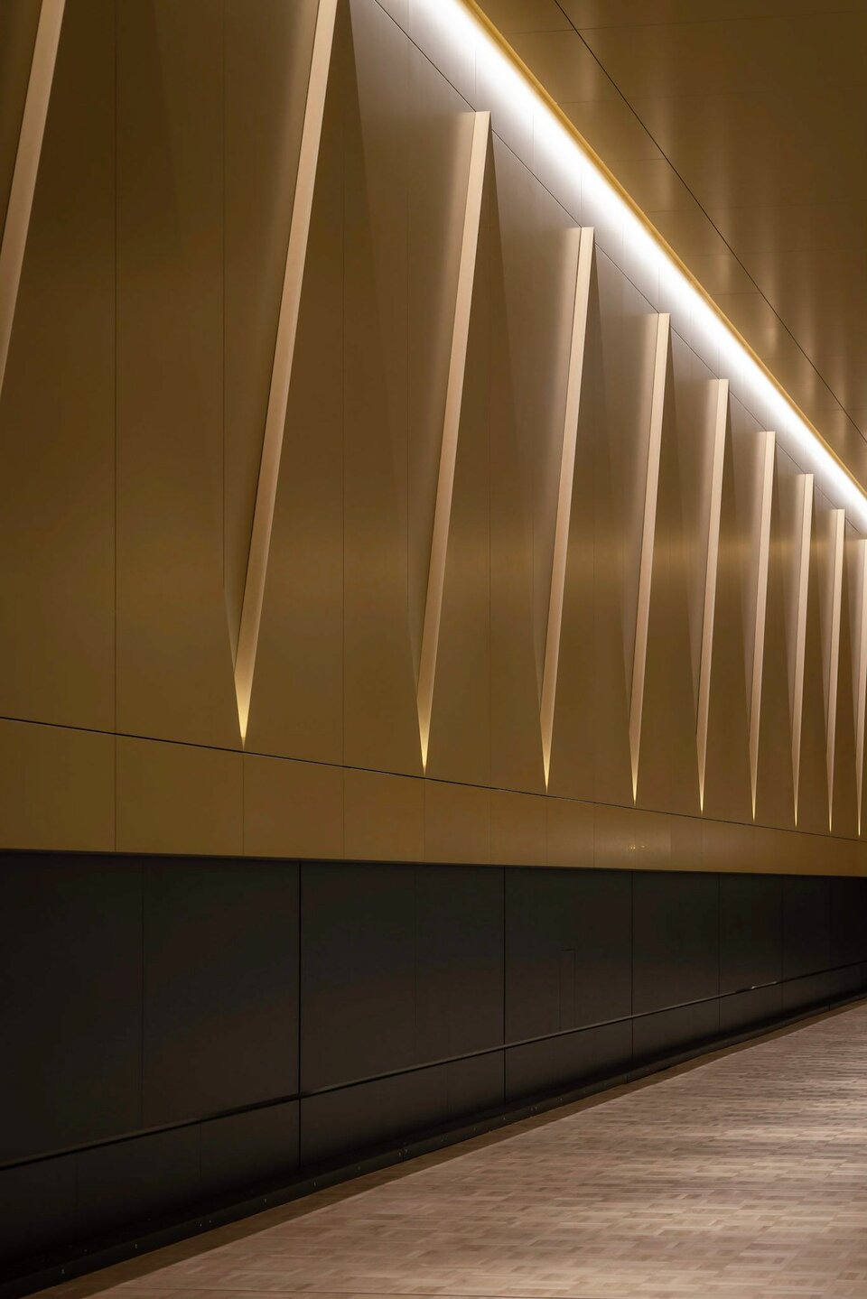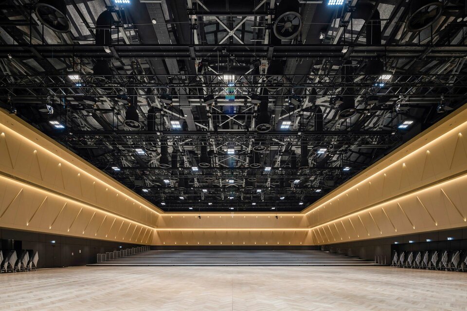 Lindner's contribution to the conversion of the event venue on the banks of the Rhine included wall and ceiling cladding as well as doors. The congress hall is now fitted with flame-retardant acoustic wall cladding with integrated T30 RS doors and integrated folding sliding doors up to a height of 3.30 metres. From a height of 3.30 metres, non-combustible COMPlacq acoustic wall cladding was installed, which is also the visual highlight of the building. The wall cladding in gold and anthracite, made of wood and aluminium, refers to the name of the Rheingoldhalle with diamond-shaped reliefs and golden mosaics. The ten-storey retractable grandstand and the open ceiling area complete the conversion work.