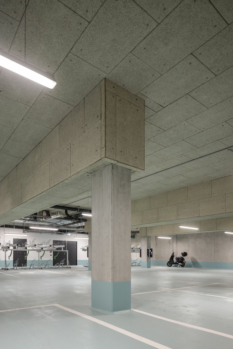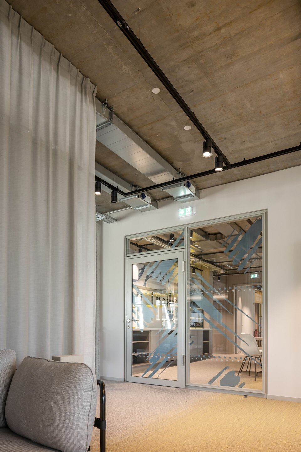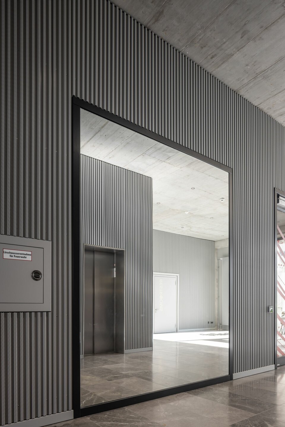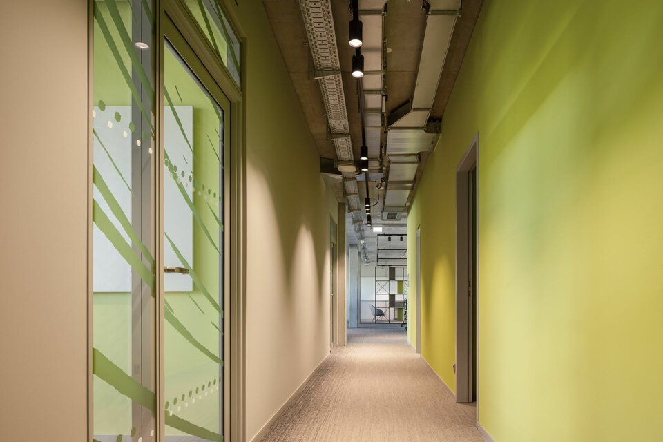 Lindner was involved in all seven floors of the building. The tasks included a wide range of trades, from coating the underground car park to screed, insulation and painting work, signage and much more. In the process, some Lindner products also moved into the interiors: The CAVOPEX hollow floor and NORTEC raised floor were fitted with high-quality floor coverings and installed in almost all areas. For the separation of the individual office rooms, the Lindner Life Contour 126 glass partition was used in combination with high-quality interior doors, some of which were designed with fire protection. Walls and ceilings made of dry lining complete the service package. The highlight of the interior fit-out is the metal wall cladding in lamella construction, which makes the lift vestibules an exciting eye-catcher.