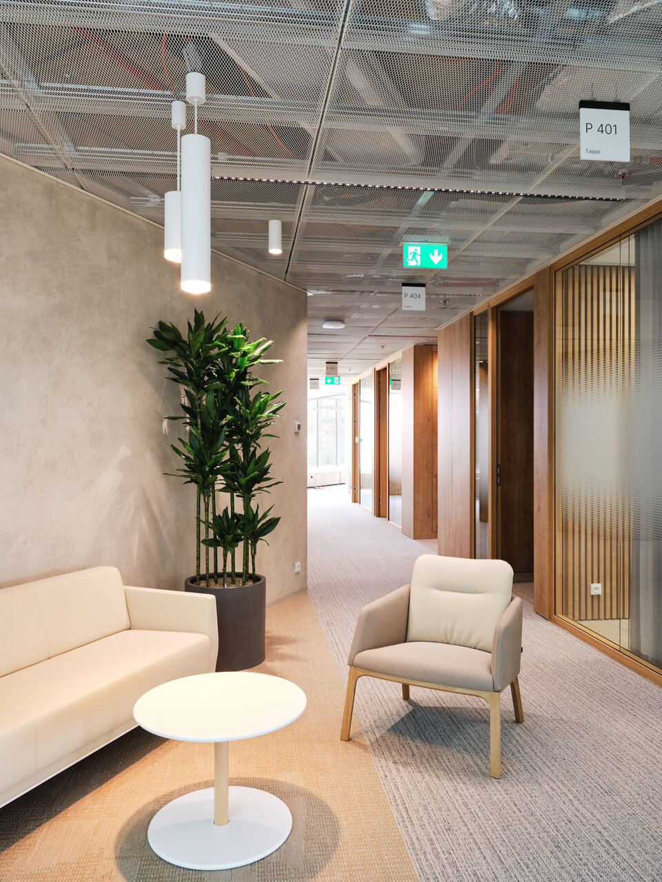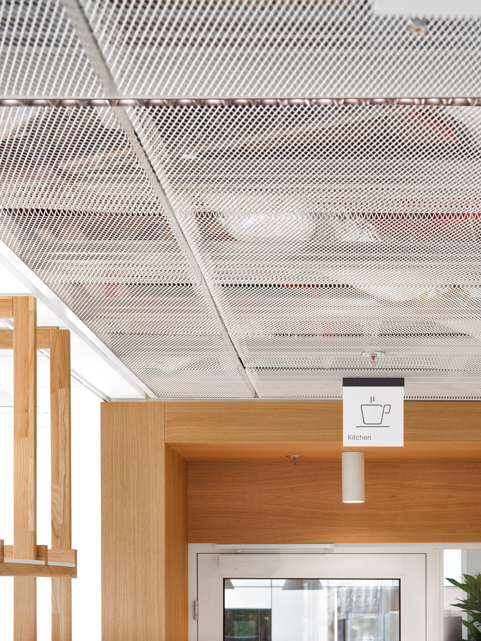 Thanks to its high-quality white finish and the delicate appearance of the expanded metal, the system integrates seamlessly into the building’s overall architectural concept. The combination of natural materials, modern ceiling construction, and thoughtful design creates a harmonious and productive working atmosphere.