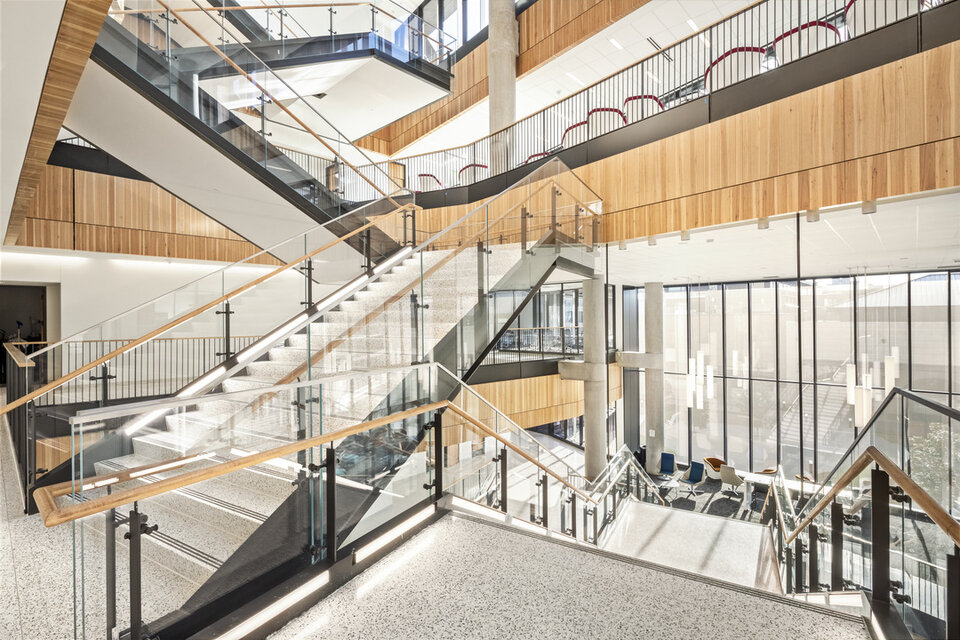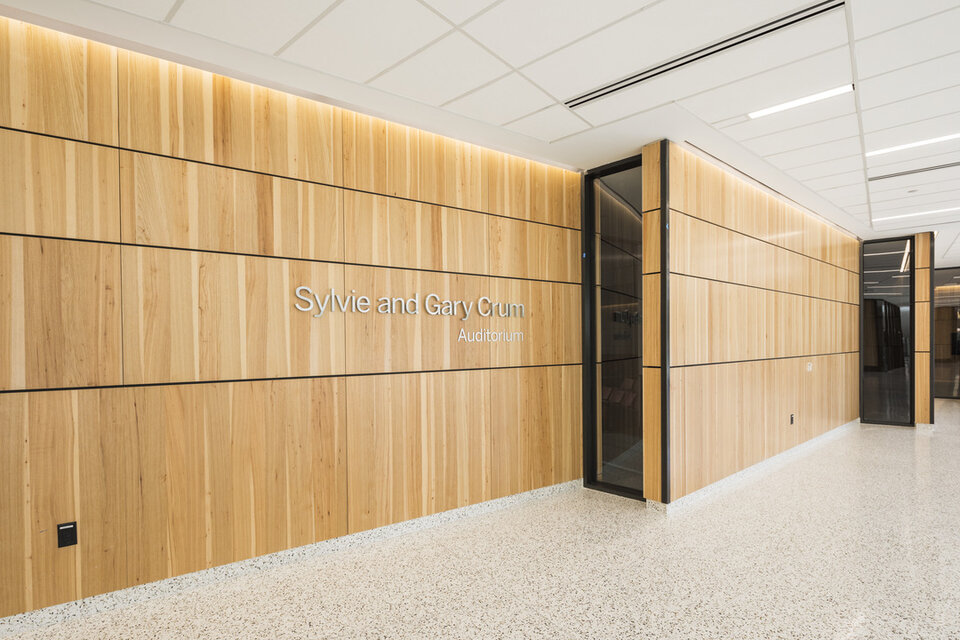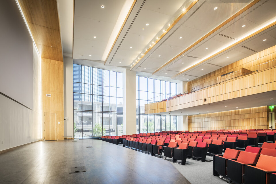 Robert B. Rowling Hall is an addition to Austin Campus at the University of Texas and expands the local teaching and meeting facilities. It houses an open atrium, conference rooms, a meeting space, an auditorium and a café. The building´s architecture promotes the distribution of natural light in combination with the warmth of COMPwood claddings. These real wood veneered aluminium honeycomb panels met the versatile demands for a wide range of applications within the Robert B. Rowling Hall.