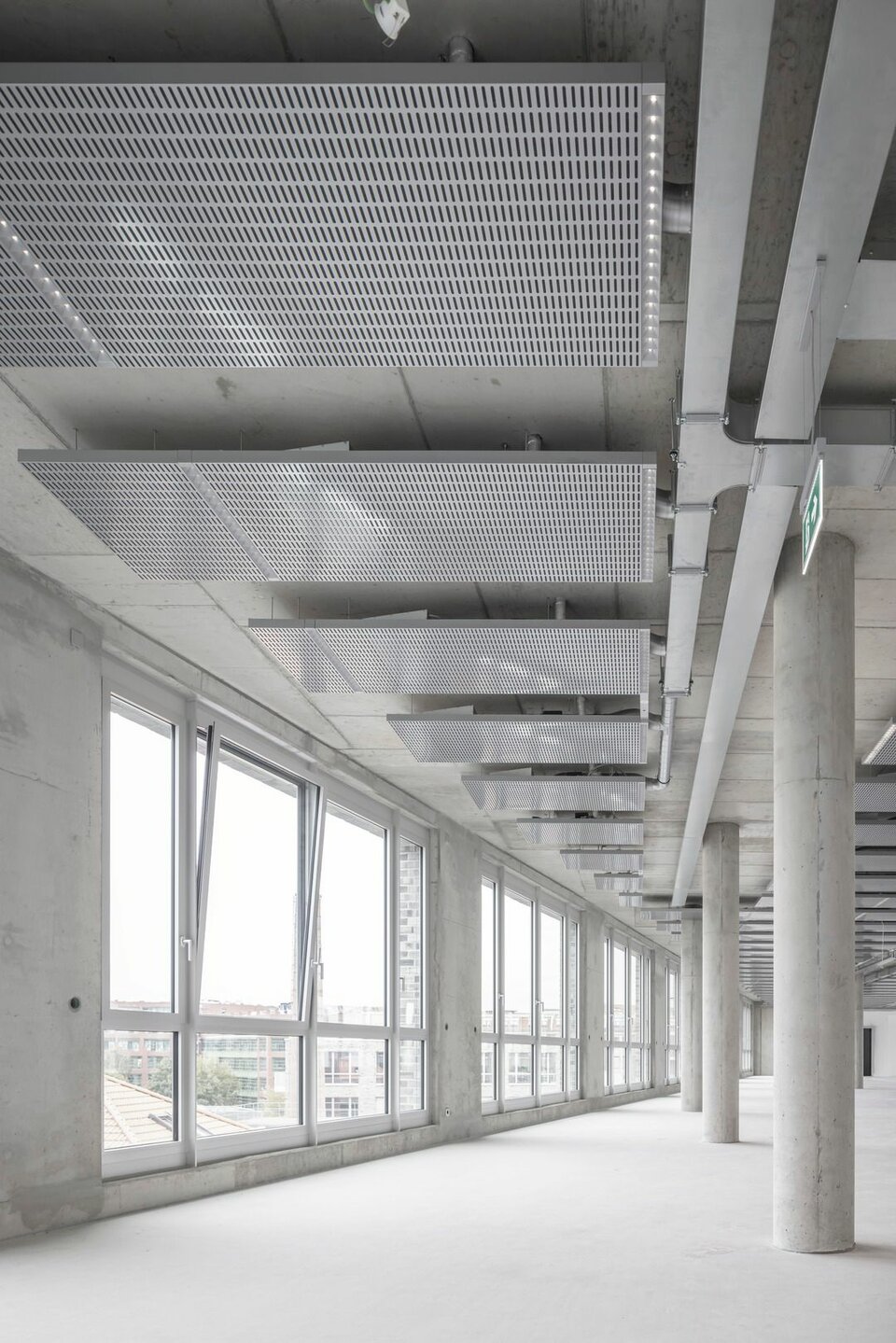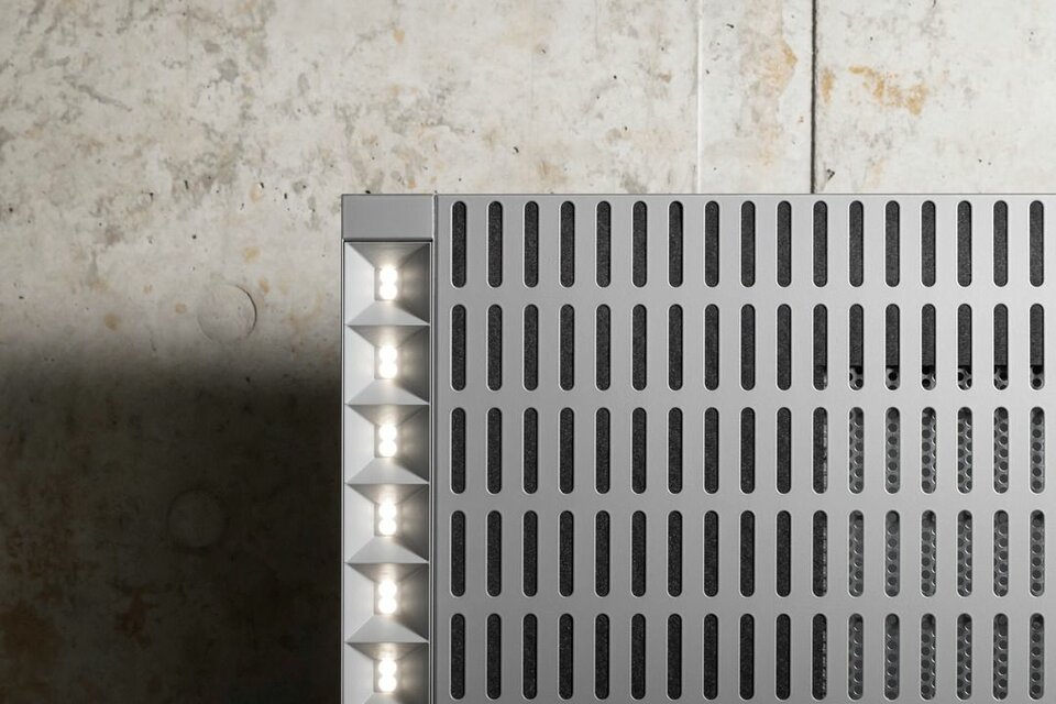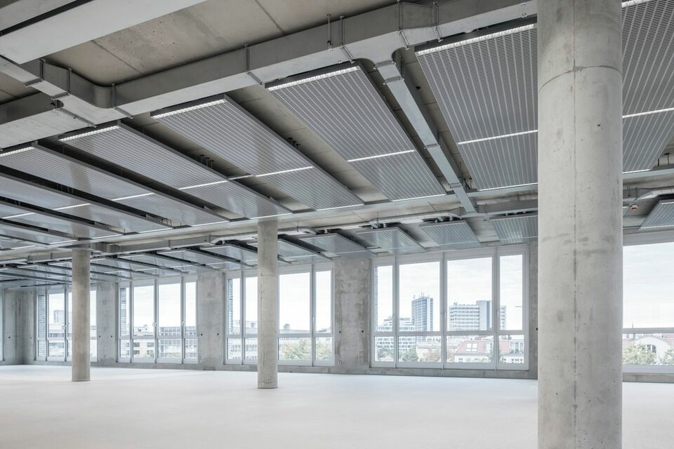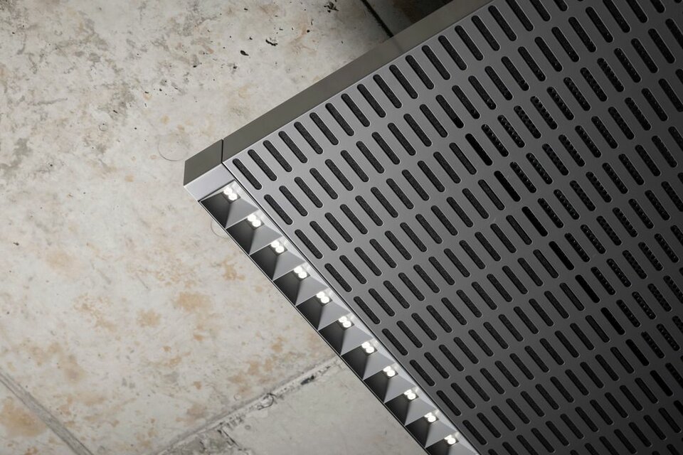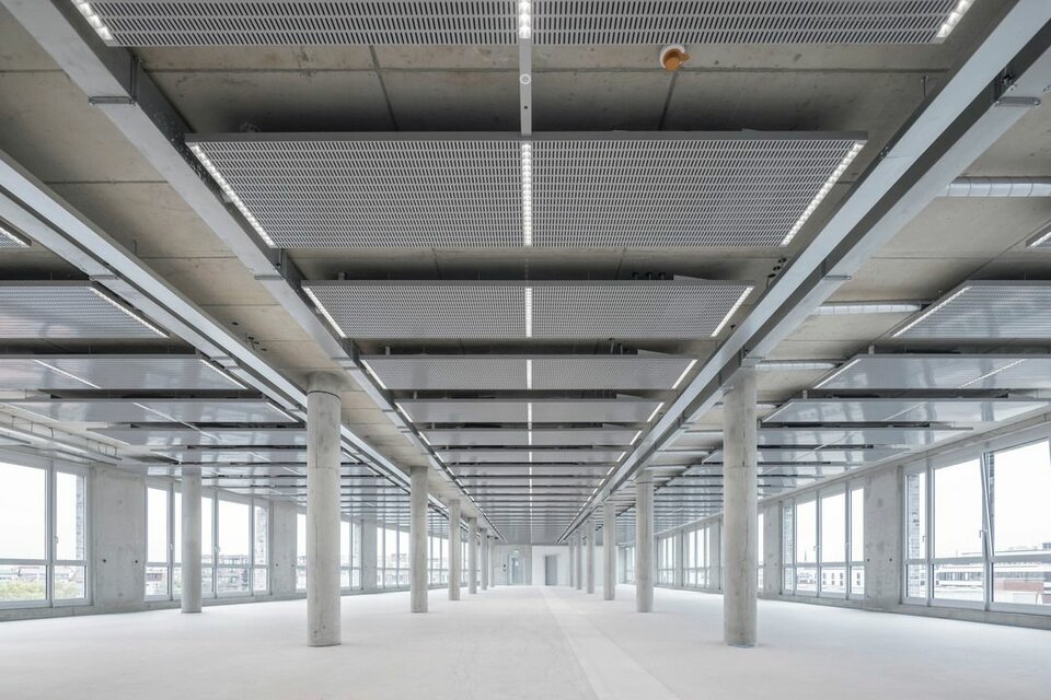 For this purpose, Lindner SE with its ceiling product division and Lindner Luminaires together with LichtKunstLicht AG developed, produced and installed special Plafotherm® DS heated/cooling ceiling sails with integrated LED lighting and energy-saving ventilation systems. Hidden on the back of the ceiling sails, these provide a pleasant supply of fresh air and even air distribution in the room. Aluminium panels with a special perforation were chosen as the surface for the ceiling elements, which fits perfectly into the upscale design concept of the Lanolin factory.