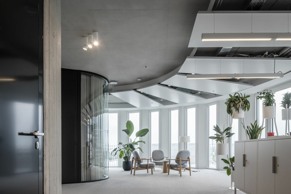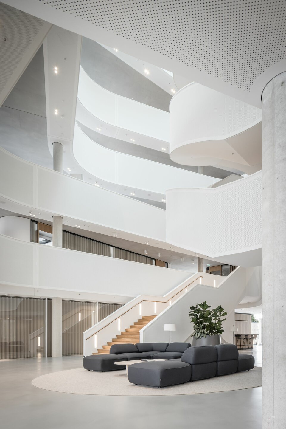 The Lindner Group undertook several key trades in the realisation of Schüco One: in the area of dry construction, modern, flexible solutions were implemented to support the open spatial structures and acoustic requirements. Metal ceiling sails further enhance the atmosphere with excellent sound absorption and appealing design.