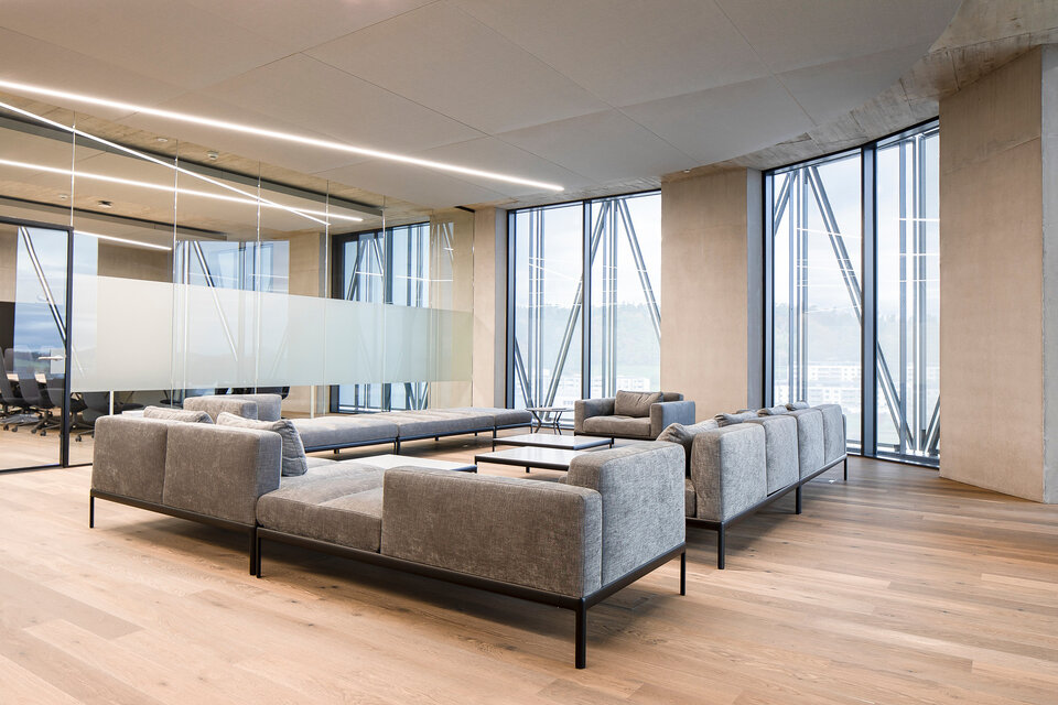 Throughout the building, a series of communal areas placed particularly high demands on room acoustics and thermal comfort. The appointed architects, Itten+Brechbühl, faced a challenge familiar in high-end commercial interior fit-out: finding a technical solution capable of meeting stringent performance requirements without compromising the refined interior aesthetic of each individual space.