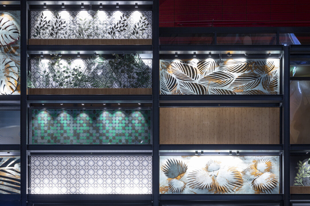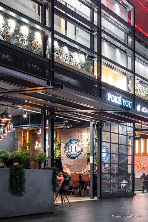 To differentiate the individual restaurant units from each other, a steel structure up to 11 m high with a wide variety of panels was installed. The focus was not only on the exceptional design, but also on the high requirements for fire protection: In the composite, all installed elements are classified as absolutely non-combustible. Lindner contributed 670 m² of panels: FIREwood acoustic panels, COMPprint acoustic panels, COMPart concrete surfaces, COMPart stucco and rust surfaces, expanded metal panels, metal panels and glass facades were installed. Lindner also realised art elements such as a light installation from empty wine bottles and the ArtWall, a 20 m² picture story in pop art style and 3D optics. The greening of the facade with lacquered metal plants and an additional 130 m² of lasered metal and glass panels formed the end of the particularly diverse works.