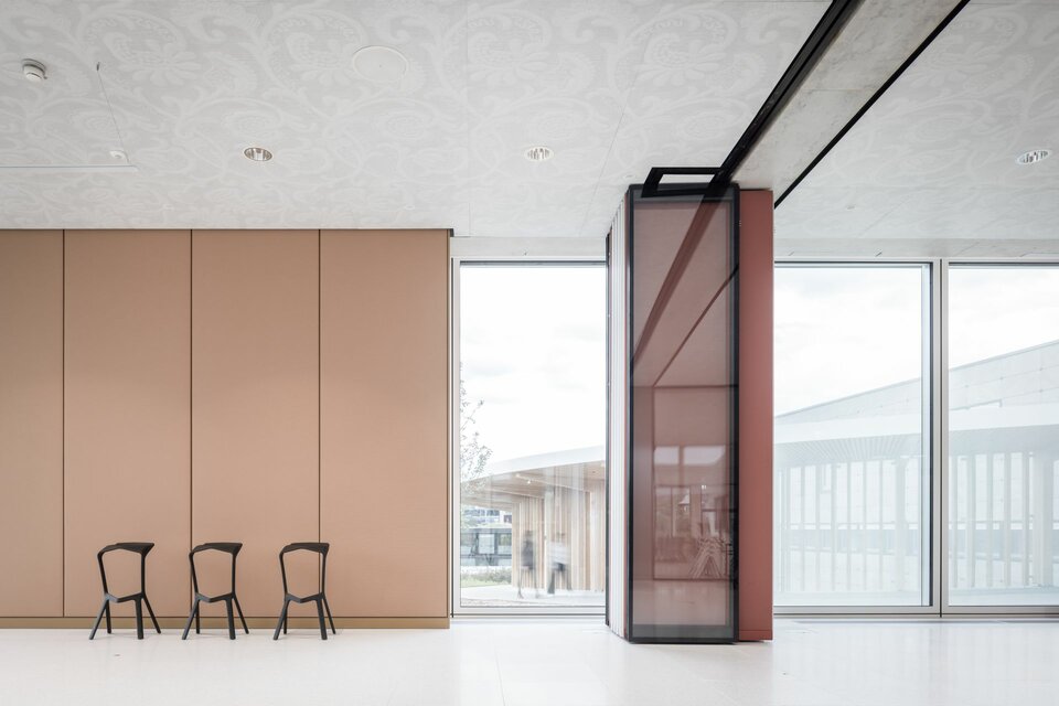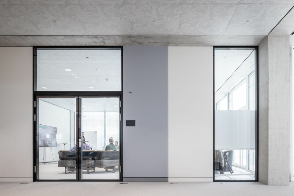 As various studies have shown, our surroundings have a considerable influence on our communication and cooperation – this makes smart interior fit-out indispensable. The tight construction time as well as the high architectural requirements challenged the project team, but in the end, all wishes could be fully implemented. Lindner supplied both foldable mobile partitions and in-house manufactured partition systems: The fall-proof Lindner Life Freeze 137 glass partition encounters the Lindner Logic 100 Timber partition as well as the Lindner Logic 100 Metal and Lindner Logic 100 Metal acoustic partitions. To match the creative and inspiring learning environment, the wooden partitions were covered with colourful, perforated textiles and now impress in red, yellow, green and blue. Furthermore, a uniform look for the mobile glass partitions and the partition systems was achieved by using the same structural glazing – and thus providing a harmonious overall appearance. Another special feature awaits the Lindner door systems: In the case of the GTB 100 glass door, the frame panel was also covered with glass, creating a particularly elegant and filigree look. Lindner also developed, produced and installed a special solution for the modern touch panel of the HSG – the magnetic screen is suspended in the wall joint with a metal holder and can be quickly and easily removed from the wall and reattached to it at any time.