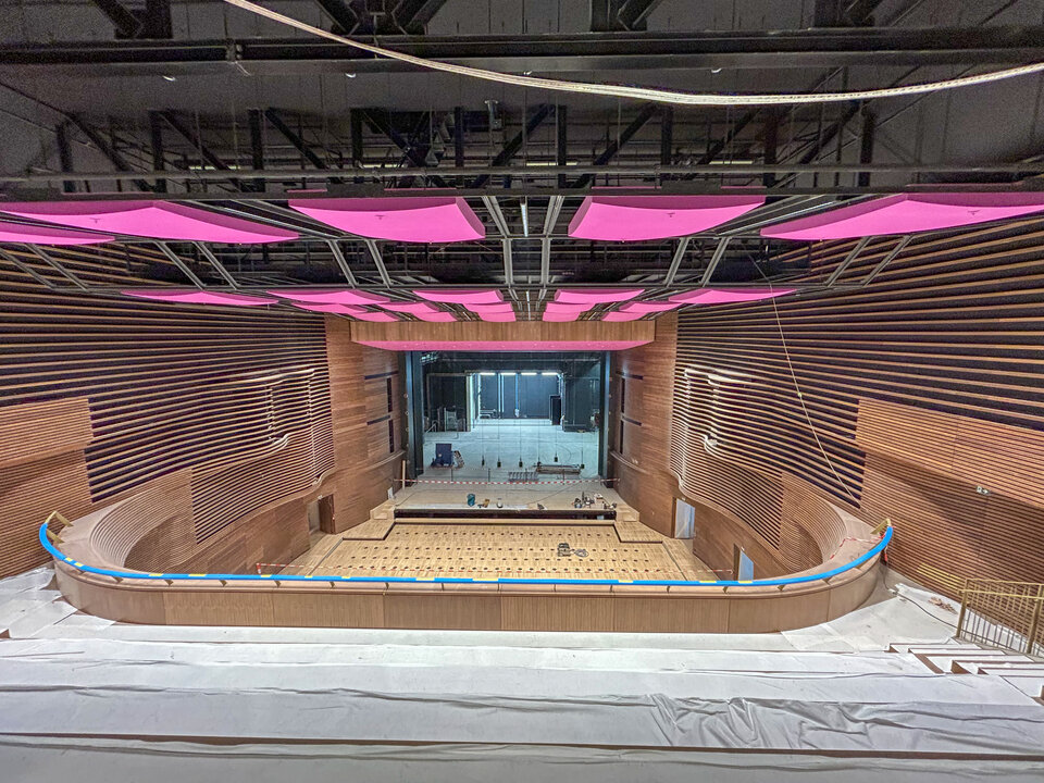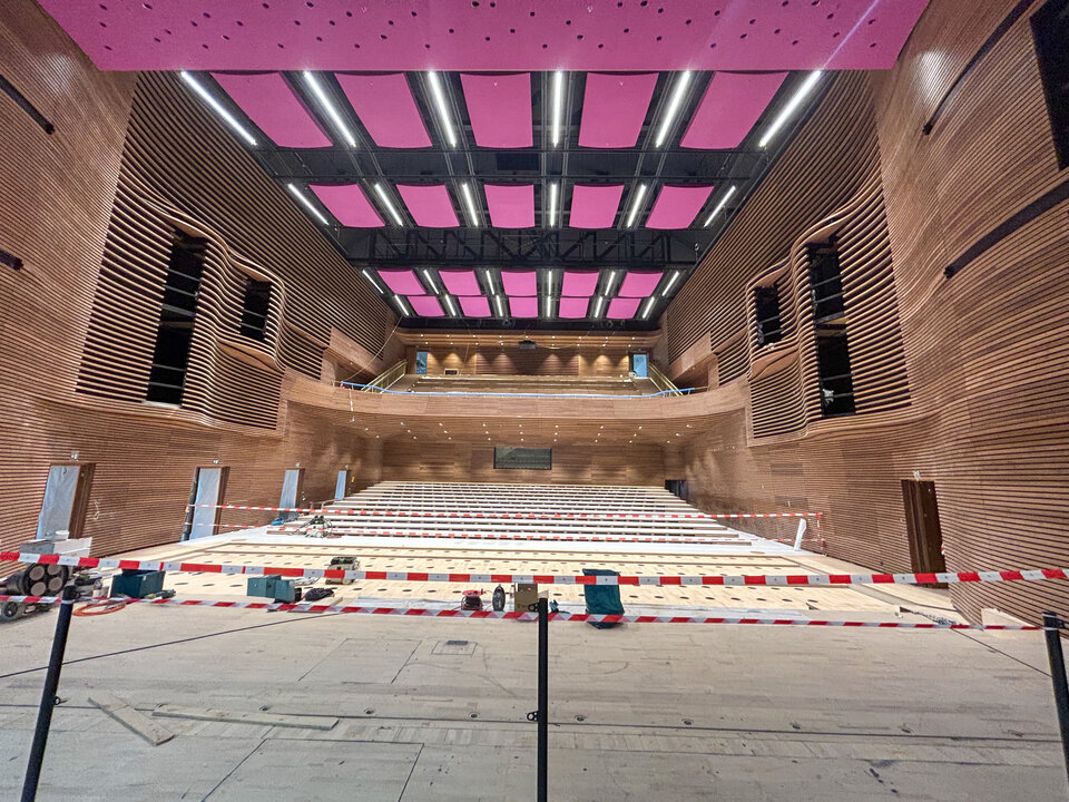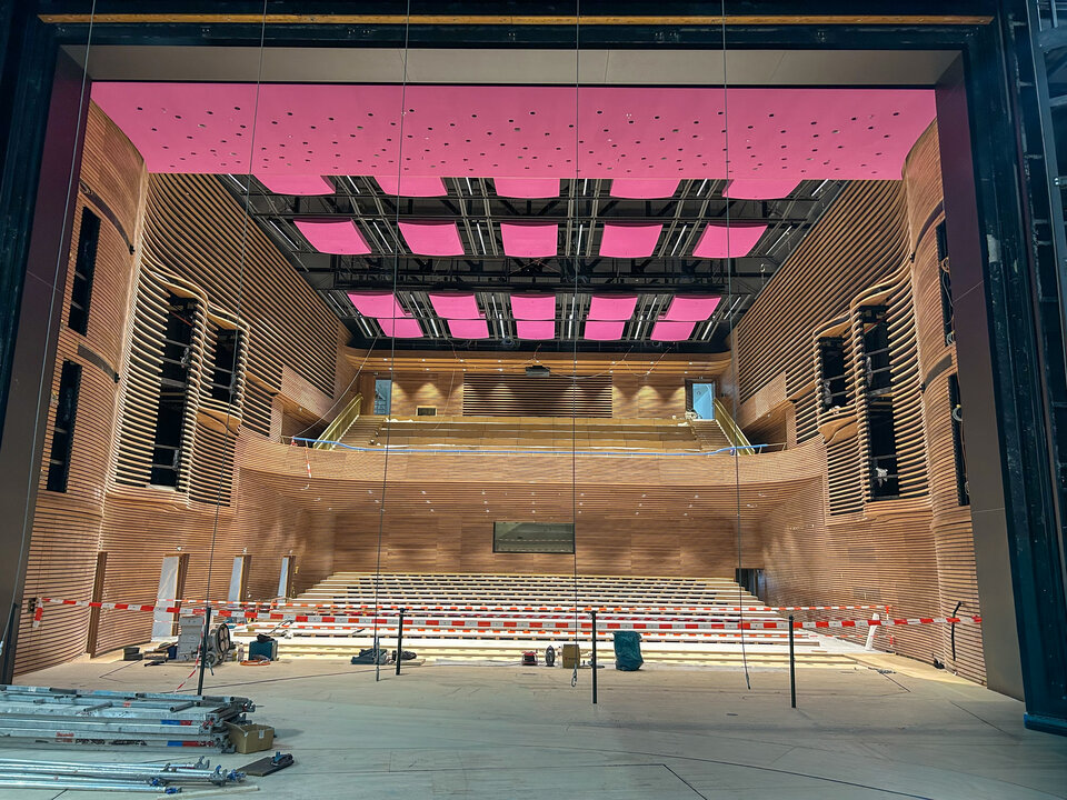 A special highlight of the Grand Hall is the installation of height-adjustable acoustic ceiling panels above the grandstand, each measuring 15 × 5 meters. The construction consists of steel and timber components that were delivered in individual parts, pre-assembled on the floor and lifted into place using chain hoists.