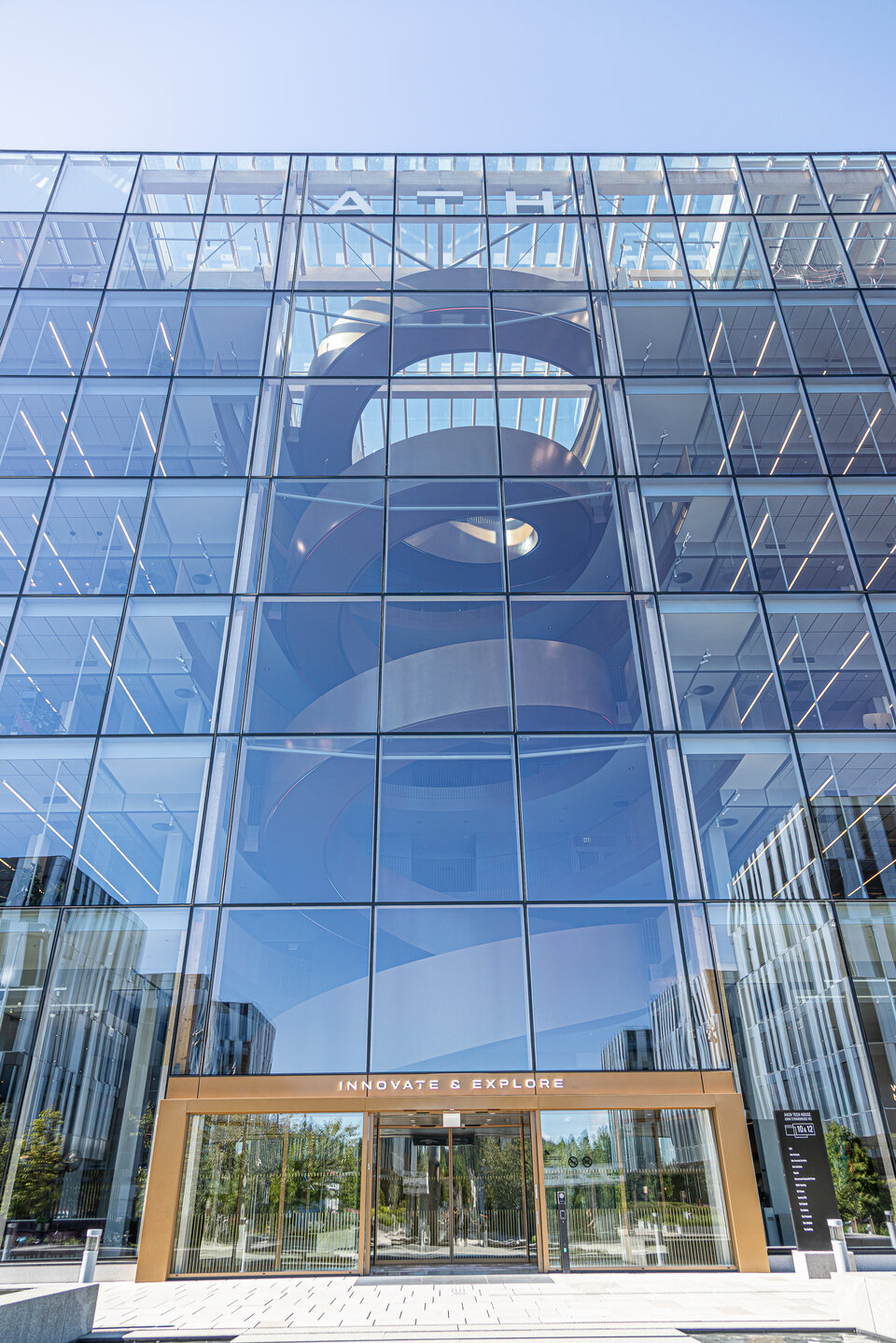 A particular architectural highlight is the fully glazed front facade, which offers views from the piazza onto the central, spiral staircase finished in a polished gold tone. The building is BREEAM certified.