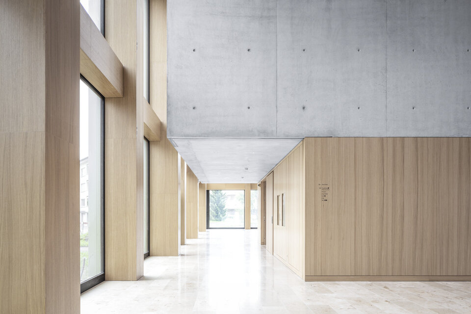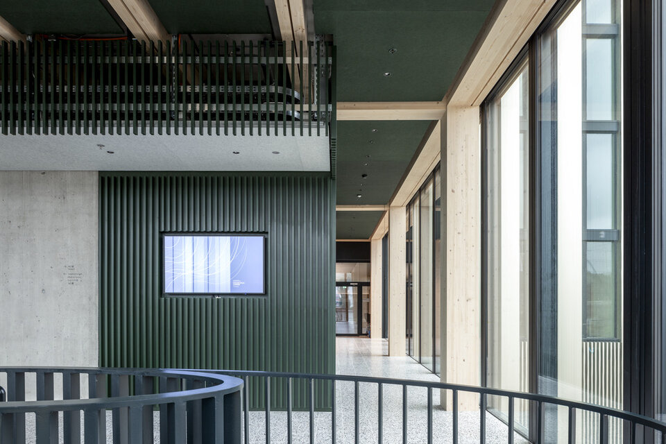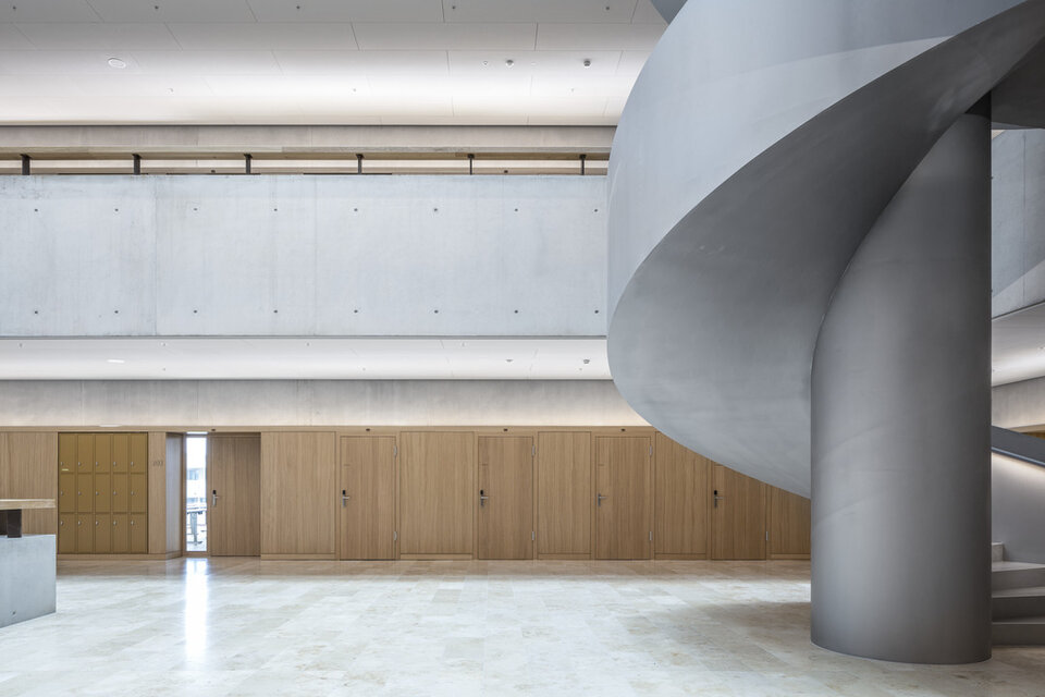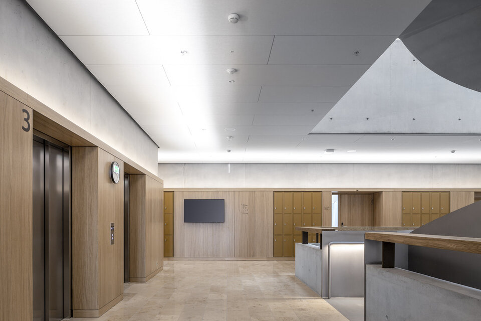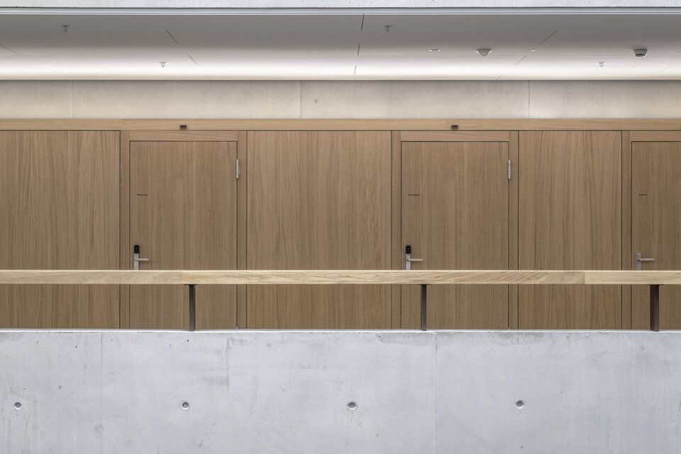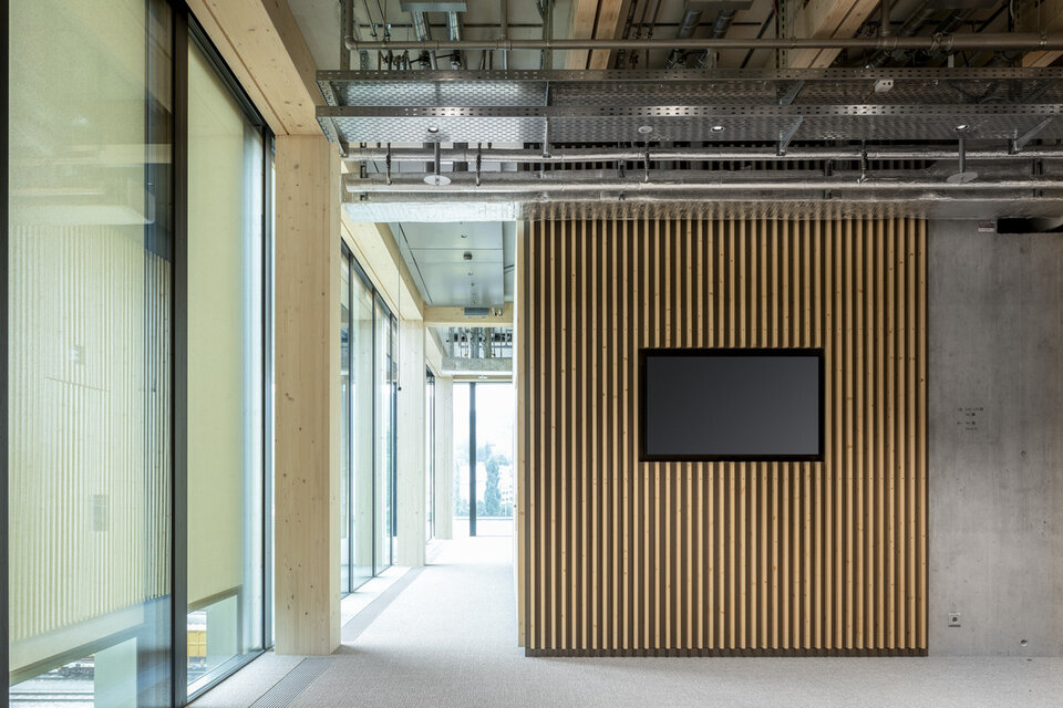 The Swiss branch of Lindner SE, together with the business unit Lindner SE | Interior Fit-out and Furnishings has contributed a variety of interior fit-out services to the university's new campus. In the high-rise building, baffle wall claddings made of solid spruce were created. The scope of services was particularly extensive in the neighboring building, where wall and pillar claddings with real wood veneer in oak up to a height of eight meters and partly with fire protection requirements RF1 (A2) were executed. Numerous reveals for doors and elevators as well as light coves have been worked into the claddings. In addition,various built-in elements have been created, including niches for vending machines, waste sorting, water dispensers, notice boards, brochure holders, fire extinguishers and info screens. In some places, a metal wall covering was chosen. Lindner also provided metal ceilings, both with the system basis as a suspended ceiling and as a grid ceiling.