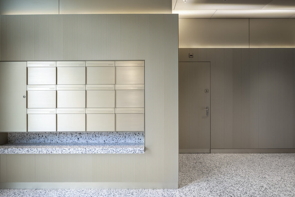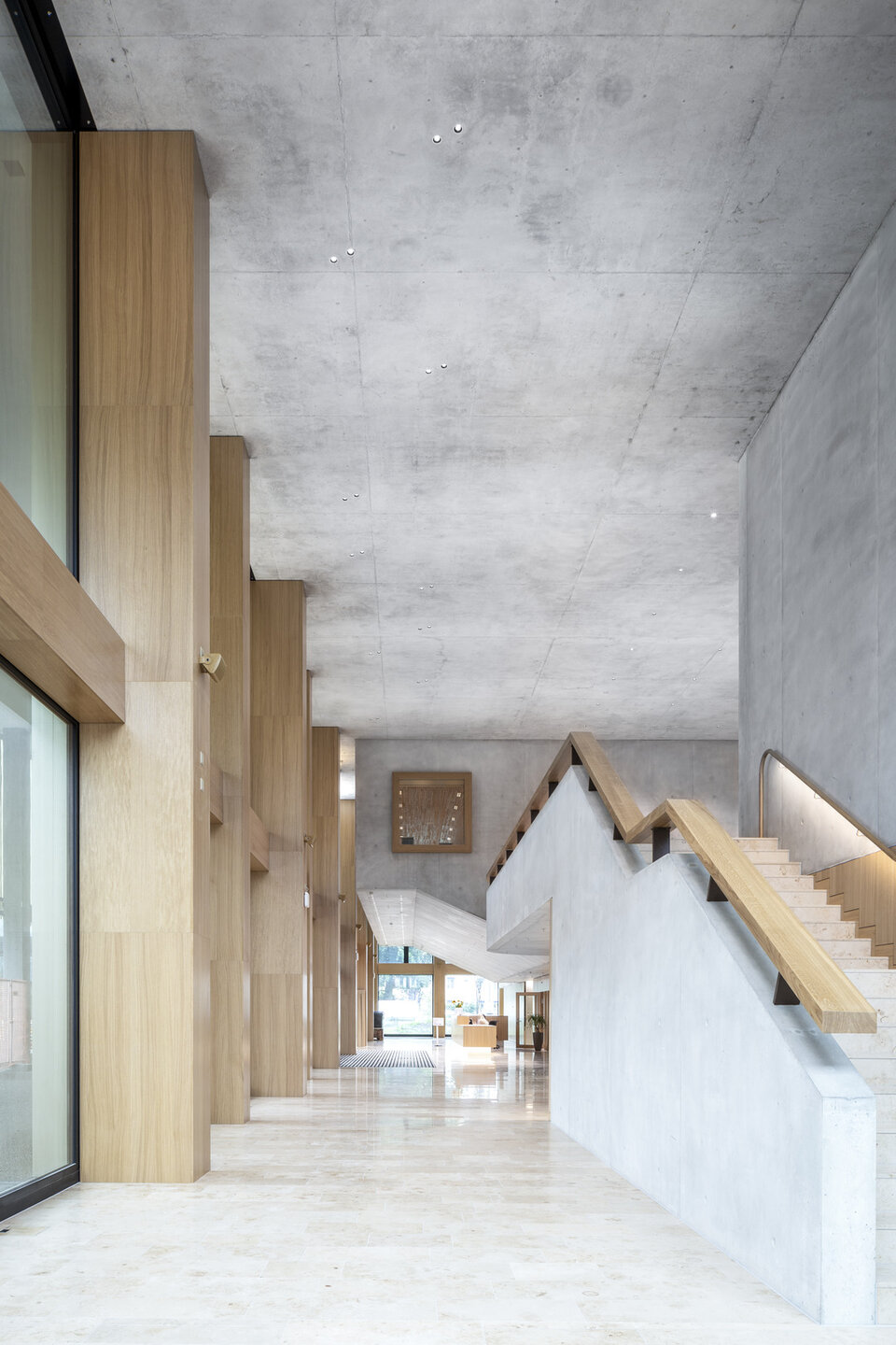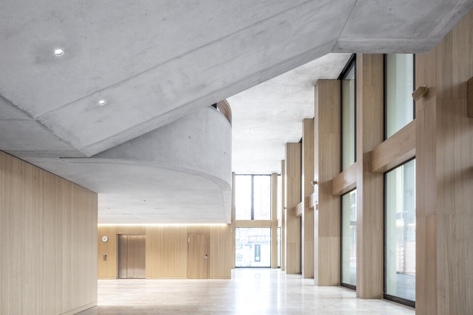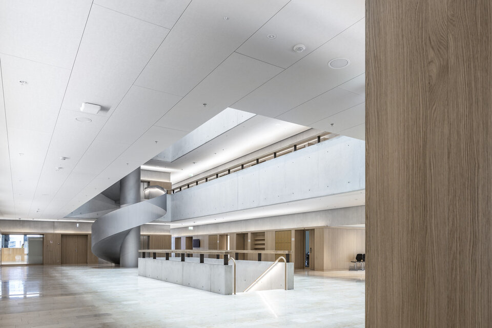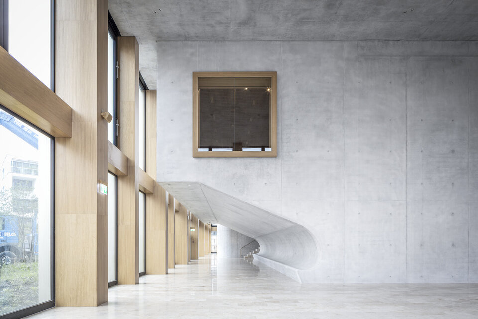 The Swiss branch of Lindner SE, together with the business unit Lindner SE | Interior Fit-out and Furnishings has contributed a variety of interior fit-out services to the university's new campus. In the high-rise building, baffle wall claddings made of solid spruce were created. The scope of services was particularly extensive in the neighboring building, where wall and pillar claddings with real wood veneer in oak up to a height of eight meters and partly with fire protection requirements RF1 (A2) were executed. Numerous reveals for doors and elevators as well as light coves have been worked into the claddings. In addition,various built-in elements have been created, including niches for vending machines, waste sorting, water dispensers, notice boards, brochure holders, fire extinguishers and info screens. In some places, a metal wall covering was chosen. Lindner also provided metal ceilings, both with the system basis as a suspended ceiling and as a grid ceiling.