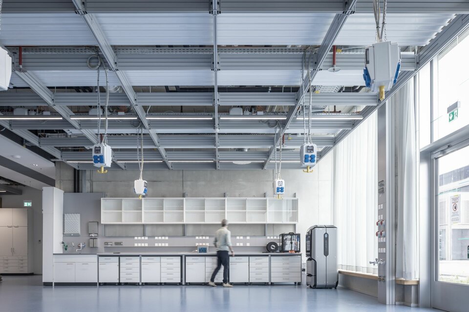 Garching near Munich has become one of the most important centres for natural and technical sciences in Europe in recent years. In addition to the Technical University of Munich, industrial partners have also settled on the campus to promote joint research and put it into practice. A renowned technology company has built its own research building for this purpose: On 13,000 m² of space, state-of-the-art research facilities can be found in variably usable rooms, some of which are up to 5,000 m² in size. This includes an auditorium as well as flexible “workshops” and laboratories, as well as classic office and meeting spaces.