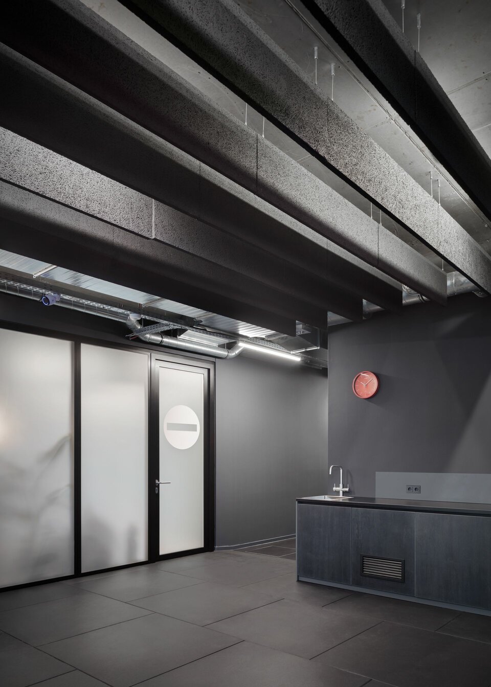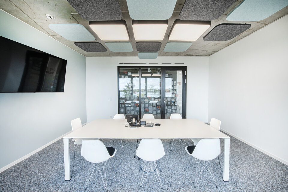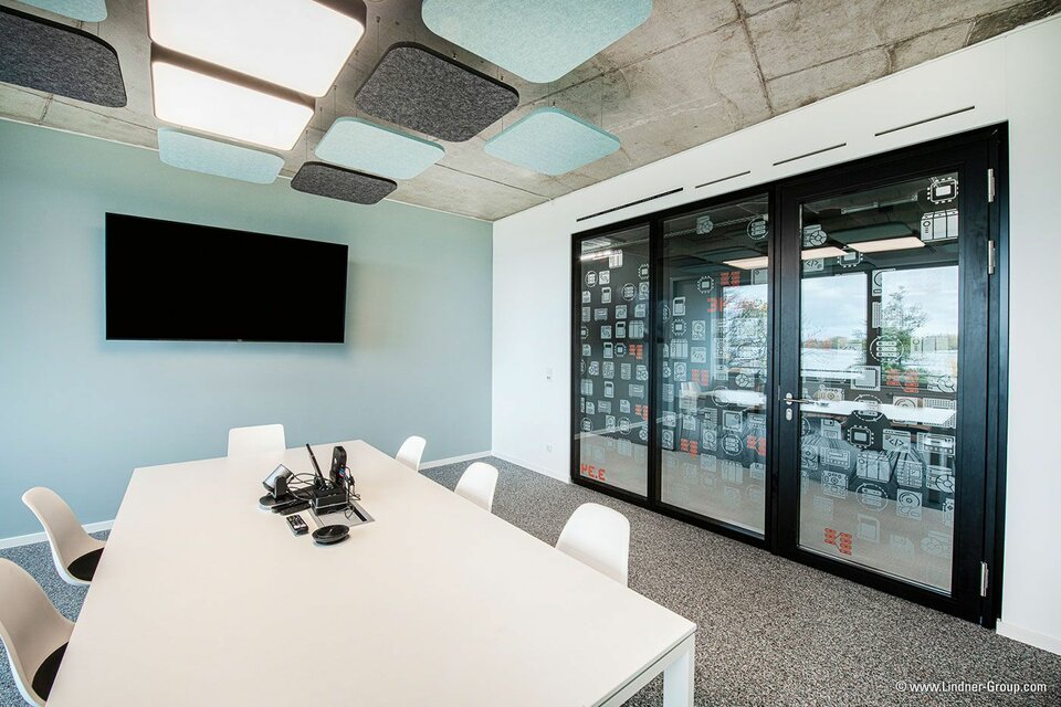 In addition to drywalls, the building now features Lindner glass partitions as room dividers – some of which were fitted with foil. Tubular frame and timber doors also provide access to the meeting rooms and other areas. Lamella ceilings and acoustic baffles were installed as special ceiling elements. Lindner also carried out joinery work, such as the simple kitchenettes, the grandstand that serves as seating during events or meetings, and the washbasins and wall cupboards in the toilets. The contract also included all the ventilation, plumbing, electrical and fire alarm systems. Painting, flooring and tiling completed the interior fit-out.