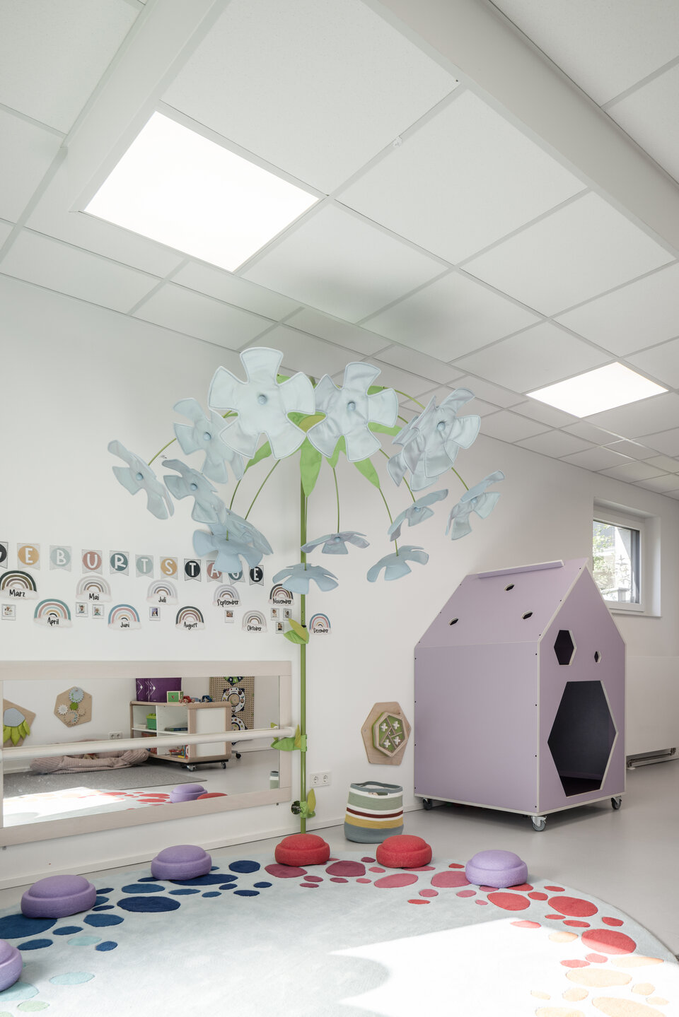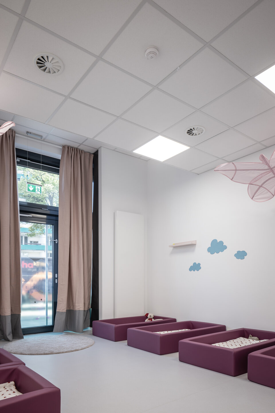 The interior fit-out of the “Lila Haus” was carried out by the Lindner Group, with the aim of creating an environment that is both functional and durable, while also tailored to the specific needs of early childhood care.