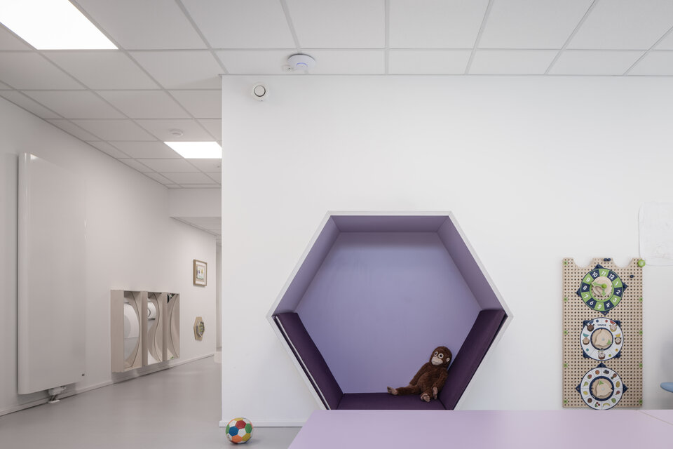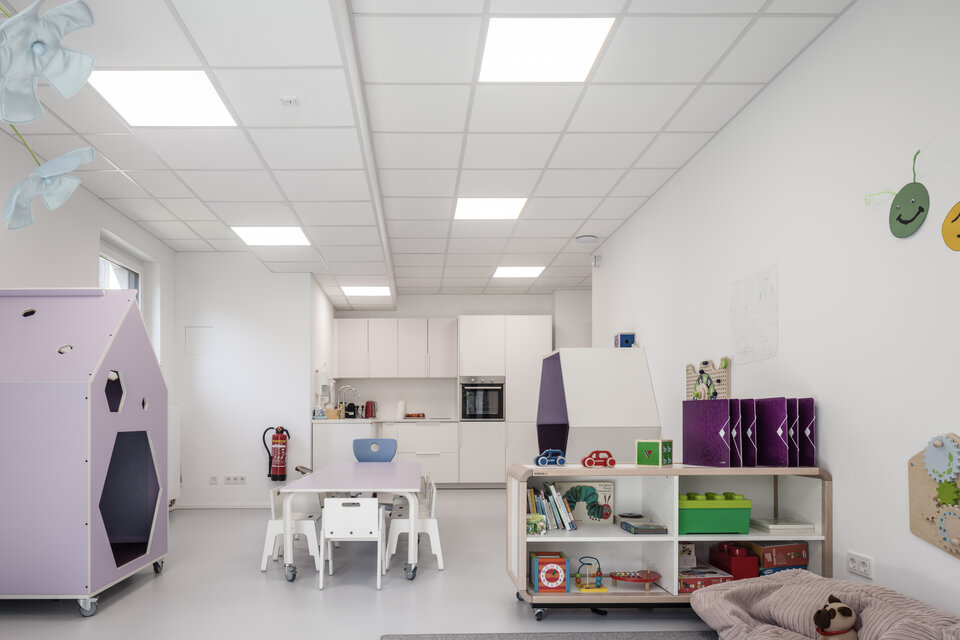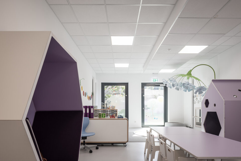 As part of a colour-coded building ensemble within the Living Circle residential quarter, the new “Lila Haus” sets distinctive visual accents. Direct access to Hanielpark offers nature-based experiences despite its central urban location. The room design in soft lavender tones, coordinated furnishings and expansive windows create an open, welcoming atmosphere that offers children space to explore and grow.