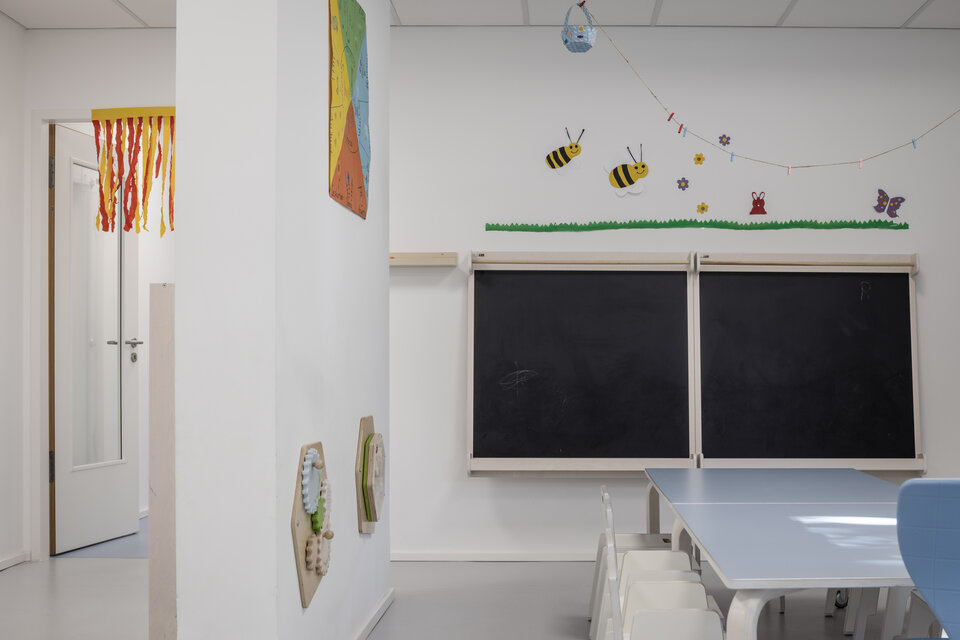 The works included all interior trades: from drywall construction and screed flooring to high-quality floor finishes, tiling, fire protection works and painting. Particular attention was paid to acoustic insulation – a crucial factor in an environment where children need to play, concentrate, and rest without disturbance. Acoustic optimisation was achieved through targeted construction measures, especially across ceilings and wall surfaces.