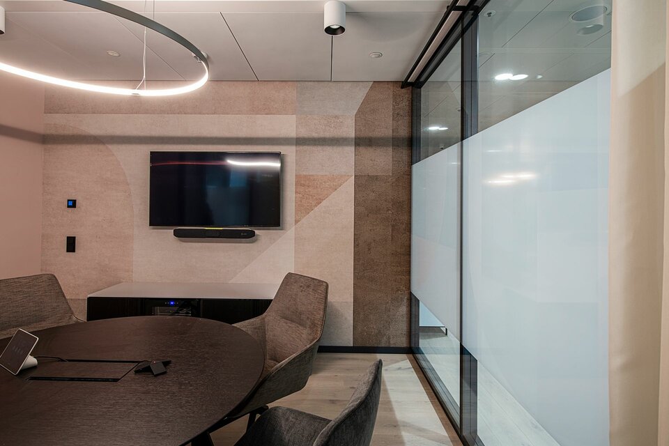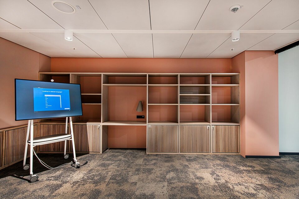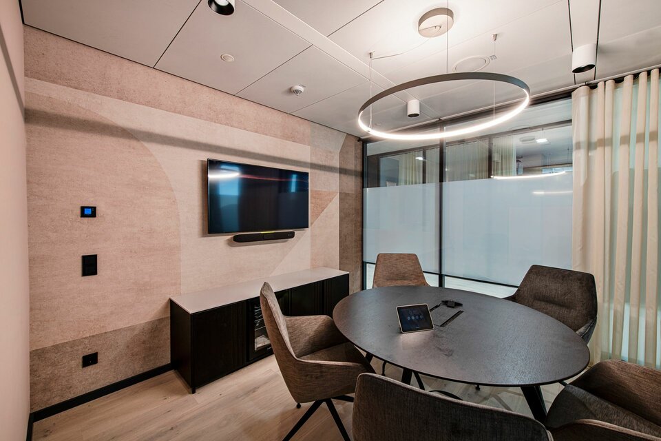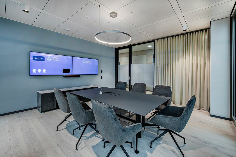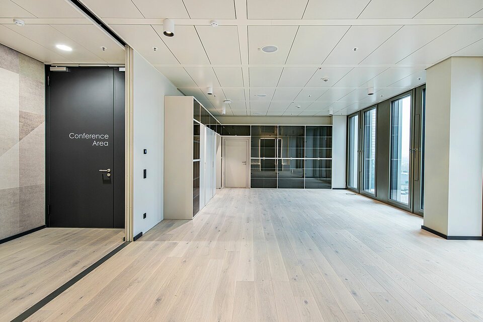 In total, Lindner carried out around 3,100 m2 of tenant fit-out – including the entire building services, planning and the necessary conversion work for the ventilation, plumbing, sprinkler, electrical as well as MSR technology in the existing building. The floors were adapted to the individual requirements and wishes of the tenants: Thus, a lawyer's office was given a modern and sophisticated design – implemented with a special colour scheme and eye-catching wallpaper. The entire area was fitted out by Lindner with heated/chilled ceilings, parquet flooring, purpose-built joinery and reception desks. Additional partition wall systems, door elements and luminaires from the company's own lighting factory complete the modern work and meeting rooms on the two floors above the roofs of Frankfurt.