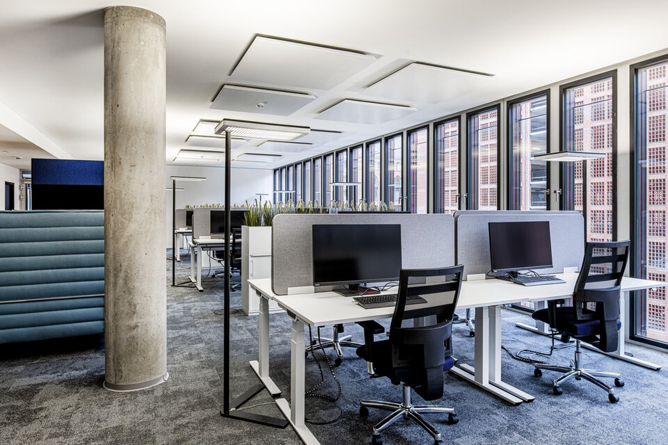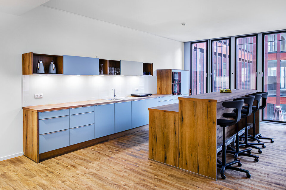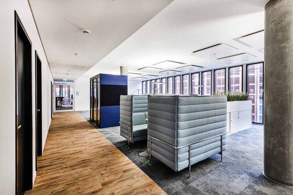 The SKAI is a gigantic office building at Hamburg's Sandtorpark, which fits perfectly into the historic Speicherstadt with its dark red façade. The office space within the building has been leased to various companies – including the Prodware Group, an innovative company in the field of Microsoft technologies and digital transformation. The office worlds are just as modern and future-oriented as the technology company: Cosy meeting corners, elegant conference rooms and contemporary workplaces line the rental spaces.