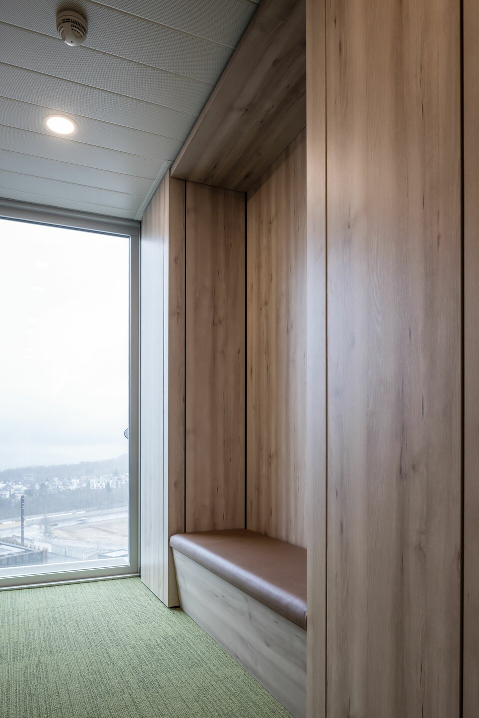 The acoustic requirements were met not least by the micro-perforated Logic 100 Timber-Acoustic panels with their sound-absorbing properties. The structured design of the office floors is rounded off by integrated seating niches in the walls in the corridor areas. Despite tight deadlines and logistical challenges, Lindner's excellent performance qualified it for the follow-up contract to refurbish the Tour A twin tower.