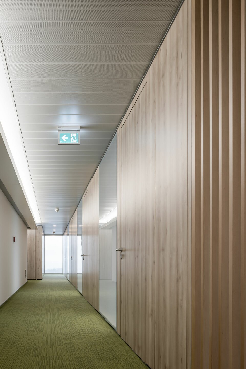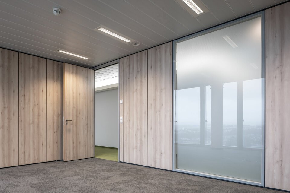 As part of a redesign, Lindner was involved in the extension of five office floors. Individual and group offices as well as various meeting rooms are now arranged around the central building core. The separation of space was achieved using Lindner system partitions in two versions: Life 137 Freeze glass elements with internal privacy film provide natural light sources in the corridors. As a warm contrast, Logic 100 Timber system partitions were chosen in Scandinavian beech and matching object doors with the same decorative surface.