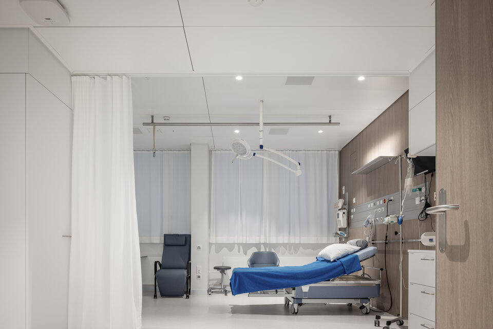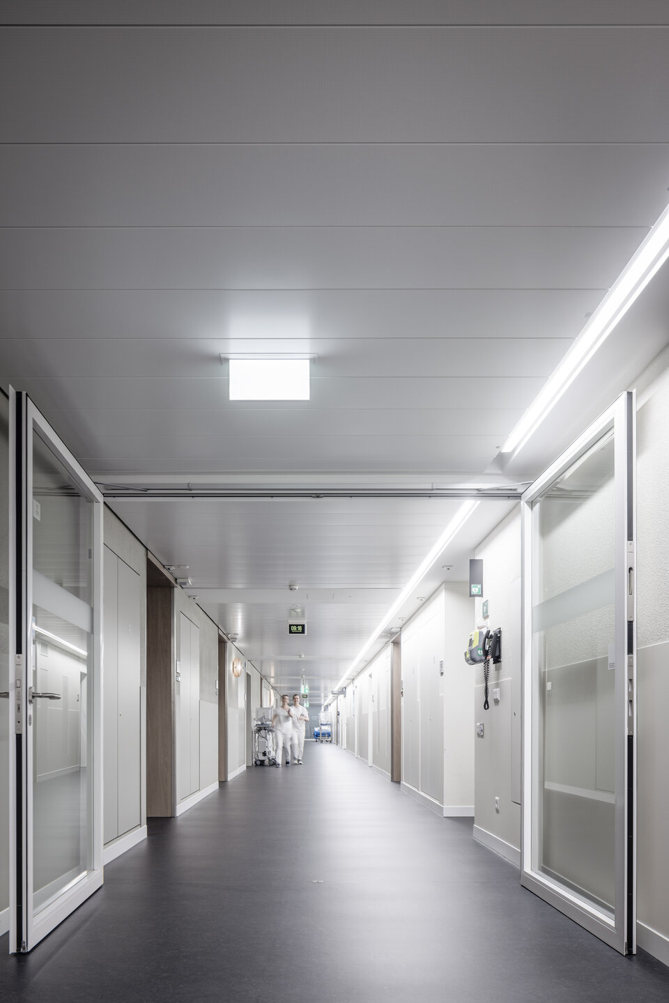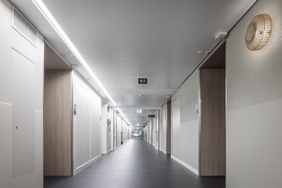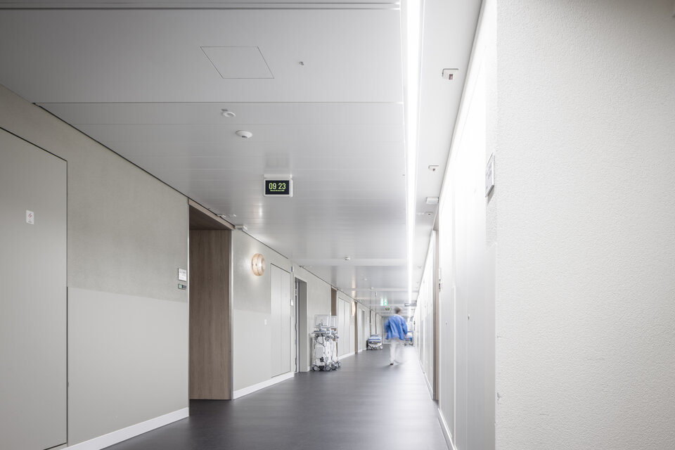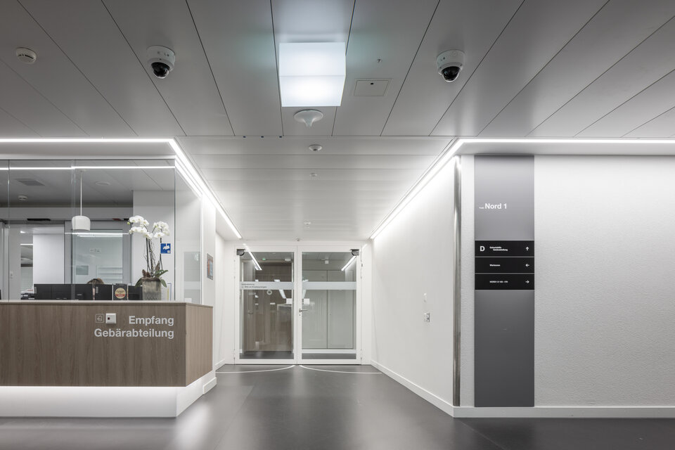 Finished in an elegant white tone, the ceilings blend seamlessly into the architectural concept and complement the warm wooden elements in the corridors and birthing rooms.