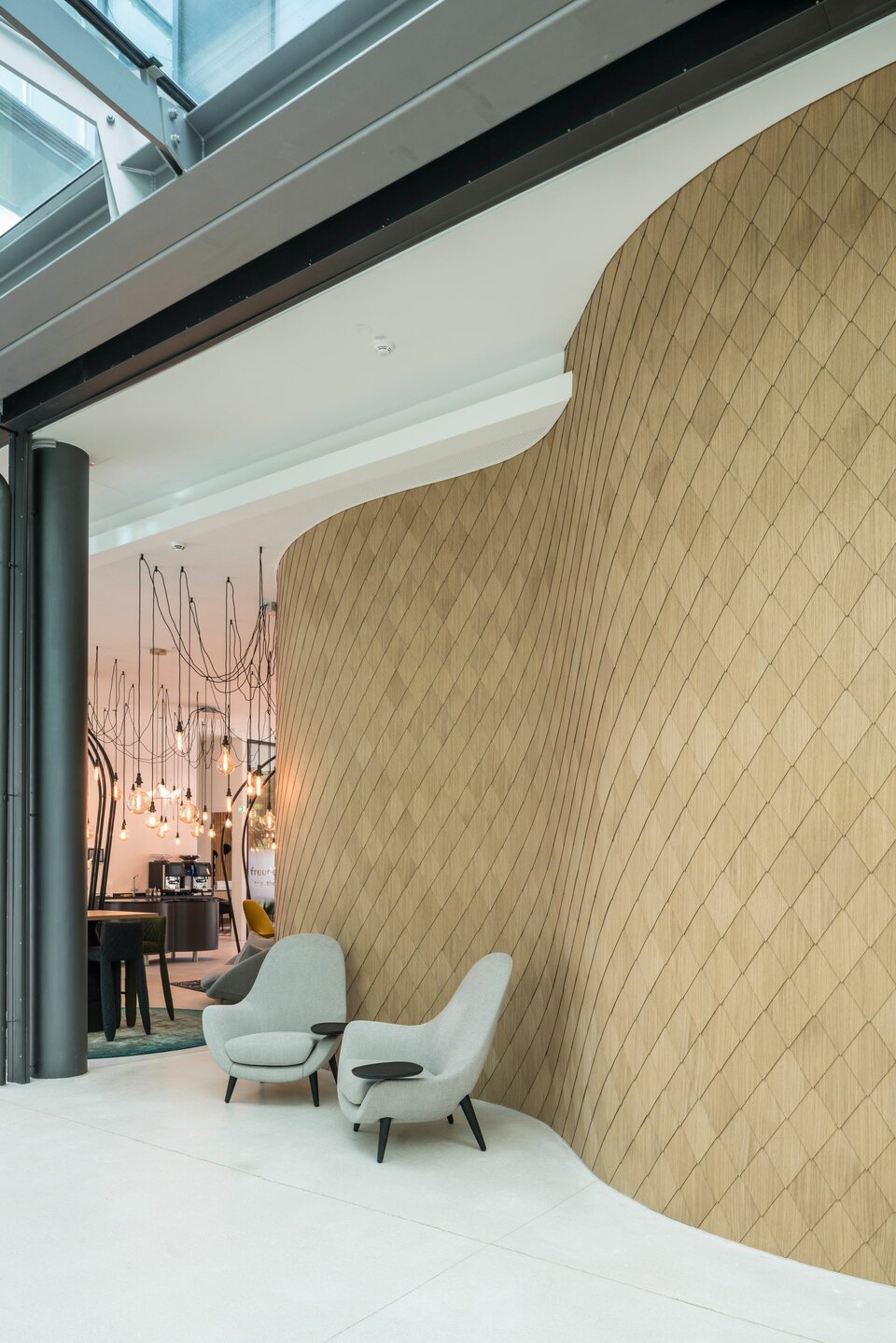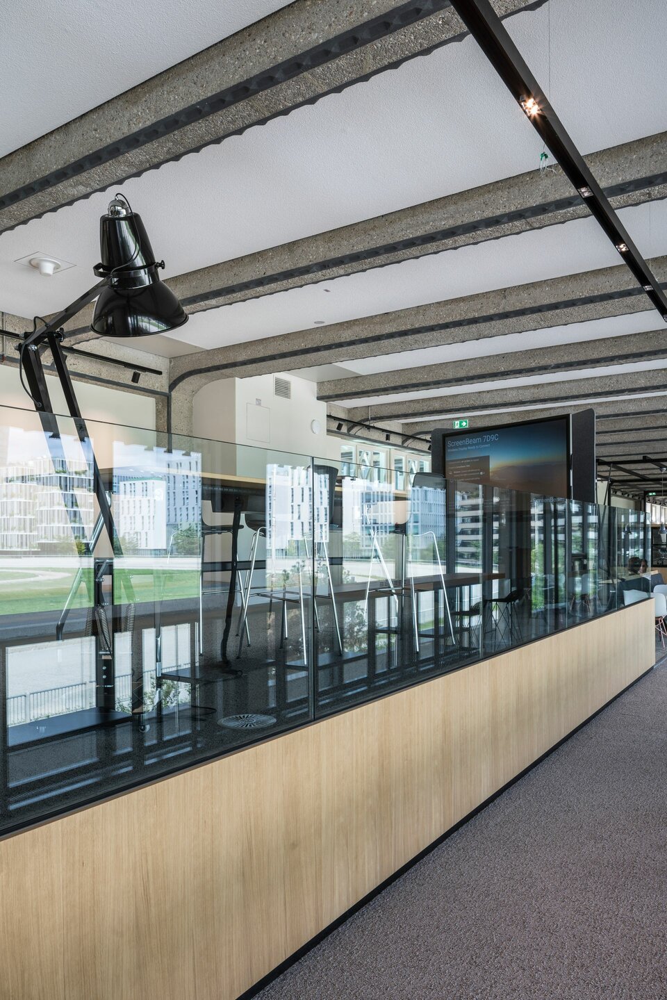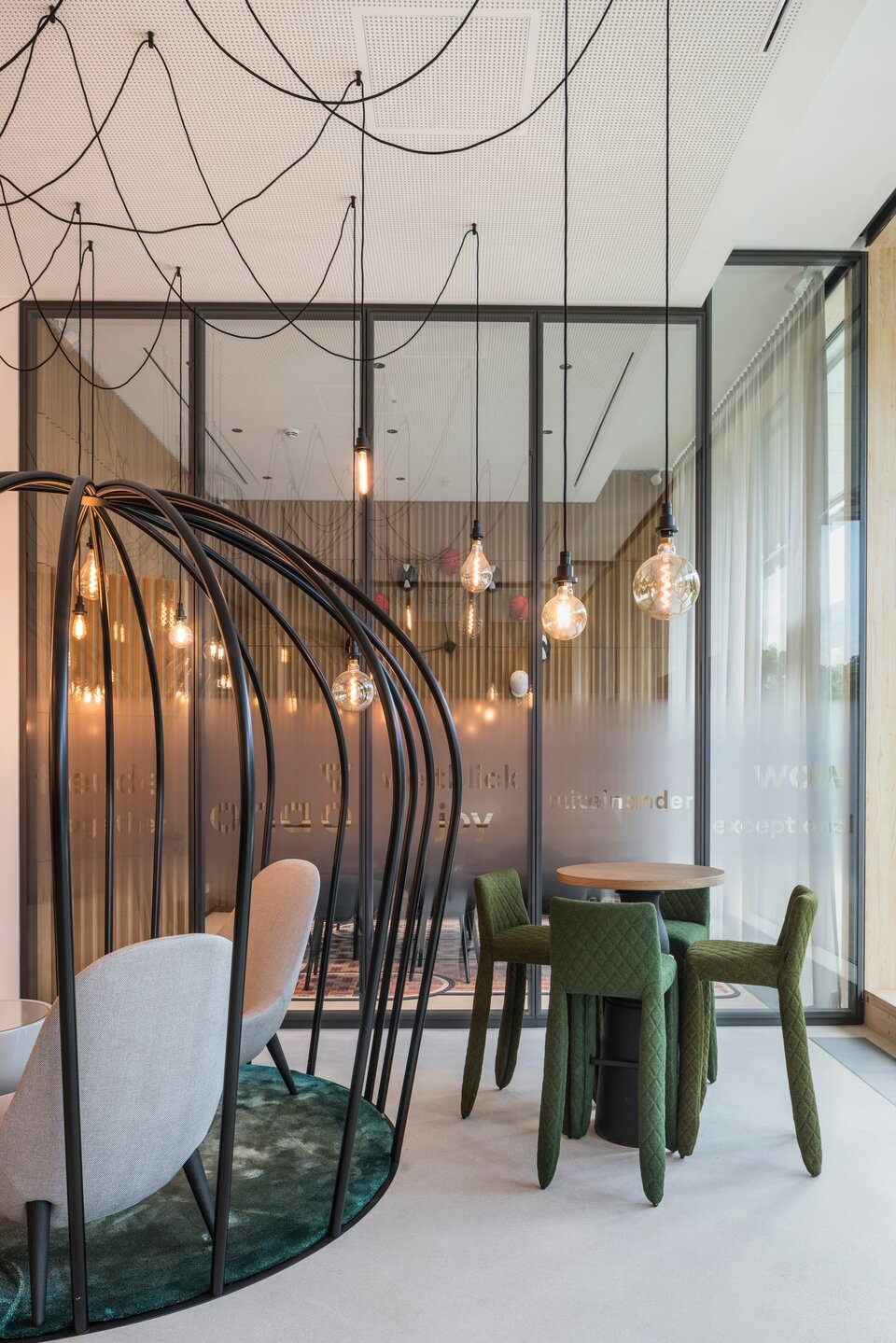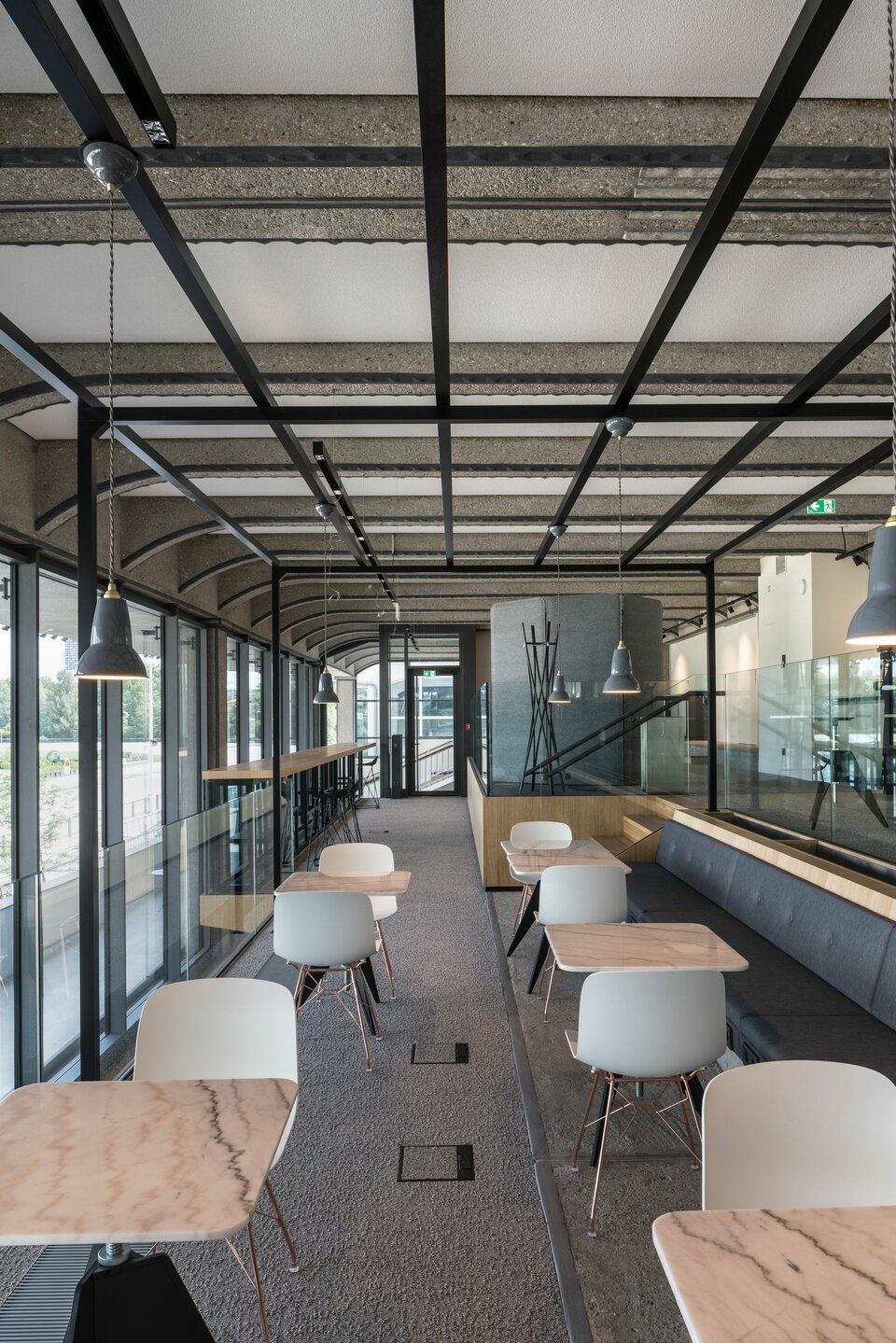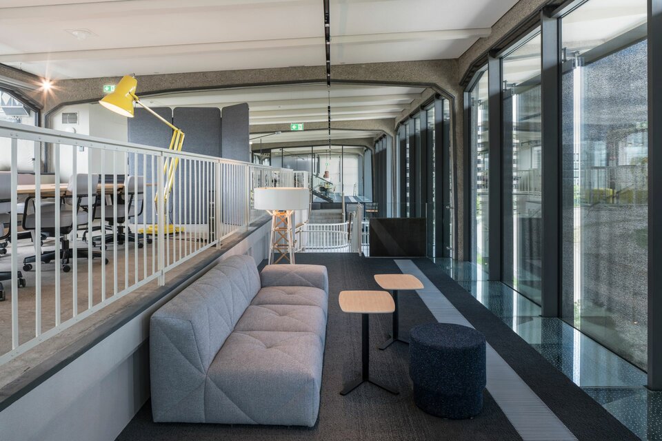 The Viertel Zwei urban quarter on the outskirts of the Grüner Prater in Vienna comprises numerous office units delevoped by Value One and JPAN. For this purpose, the original buildings at the Vienna race track were completely renovated and extended by a new building. The highlight and at the same time the biggest challenge was the conversion of the complete spectator stand into an open office with a step concept. Numerous seating areas and bar tables along the large glass front of the former grandstand provide enough space for meetings and creative work.