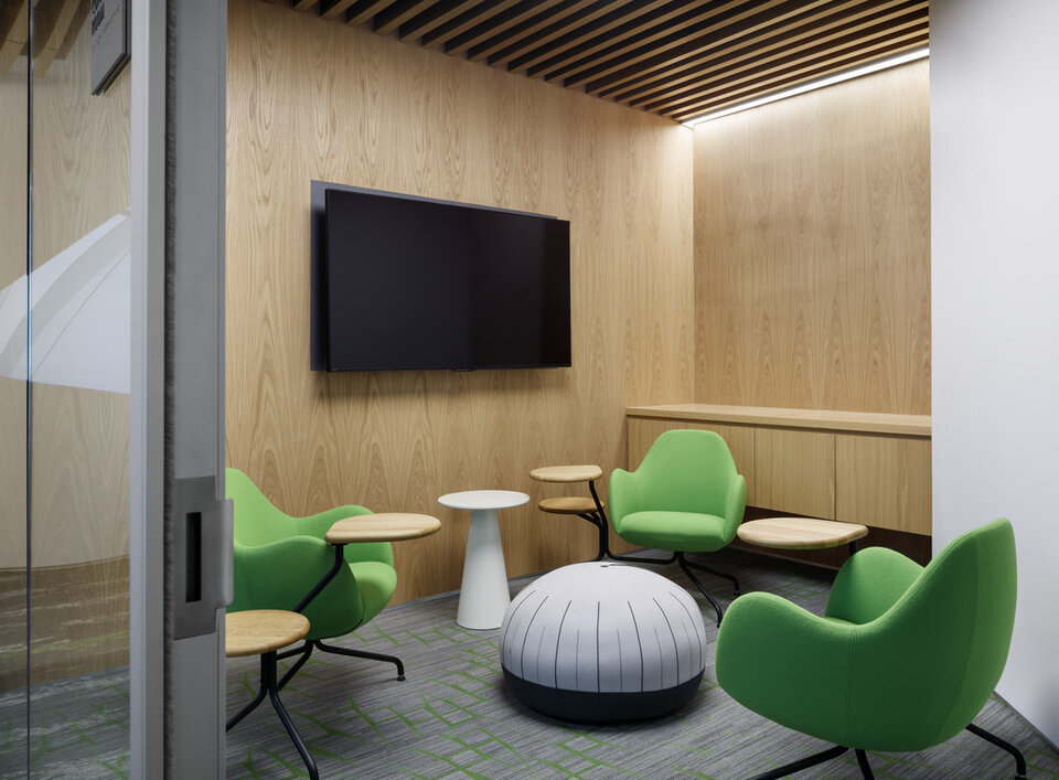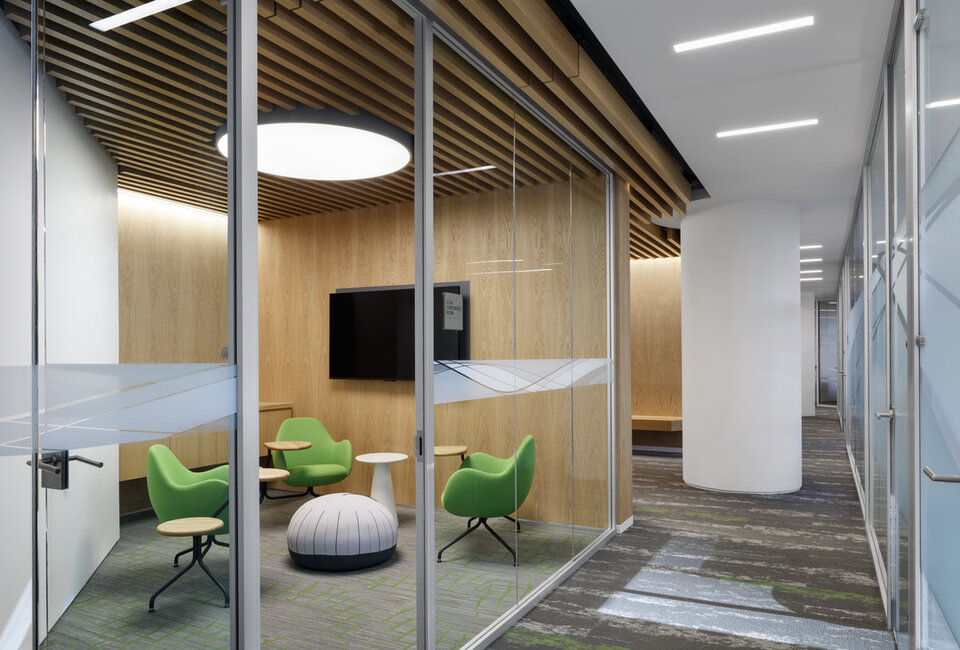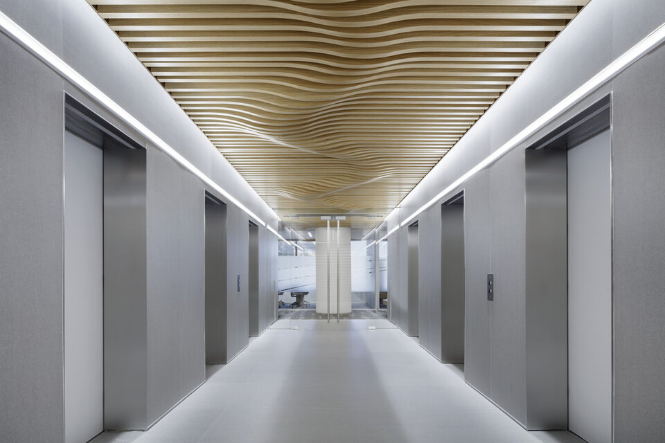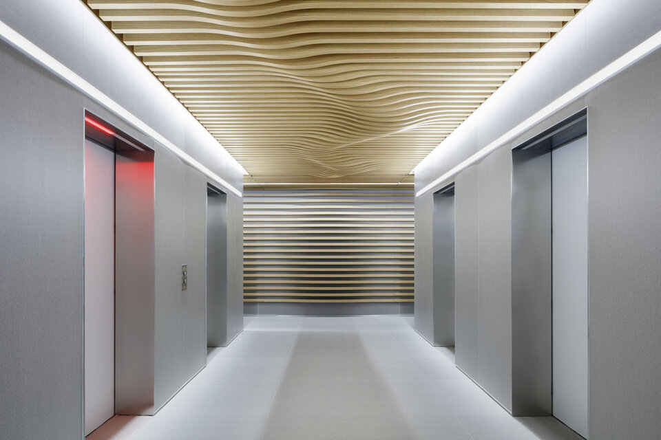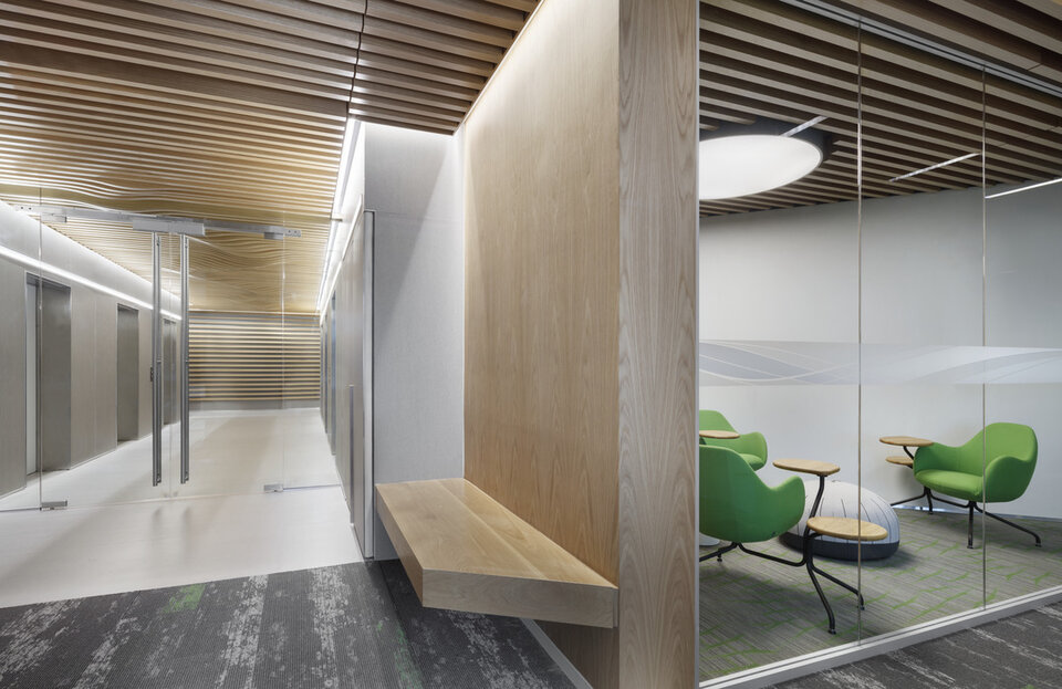 Lindner Curved baffle ceiling with real wood veneer complimented the new image of inter-departmental synergies at Wells Fargo Tyson's Corner, created a unique room atmosphere and improved acoustics.