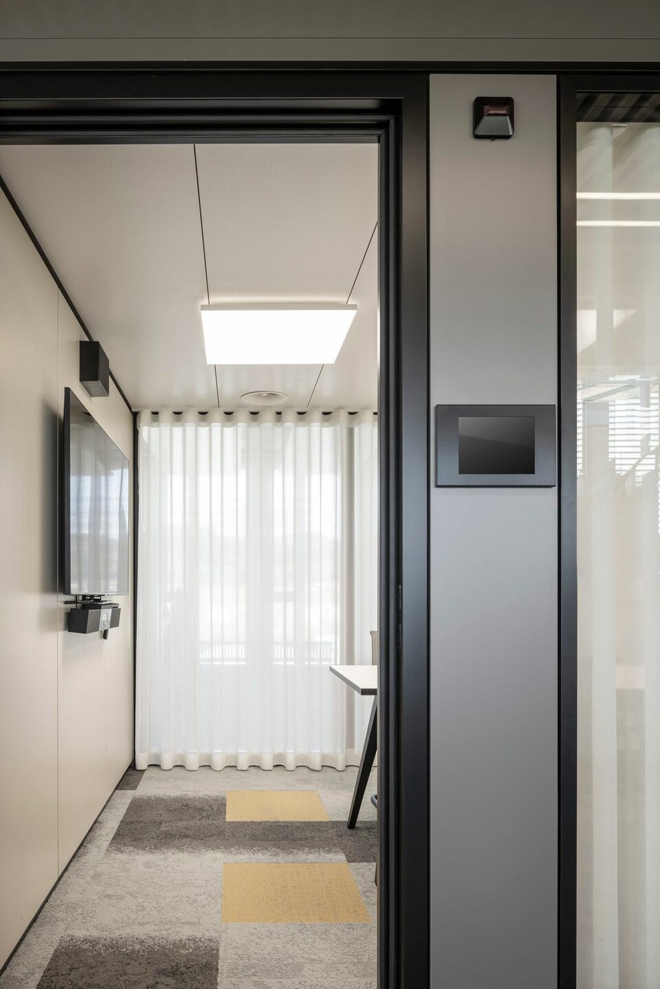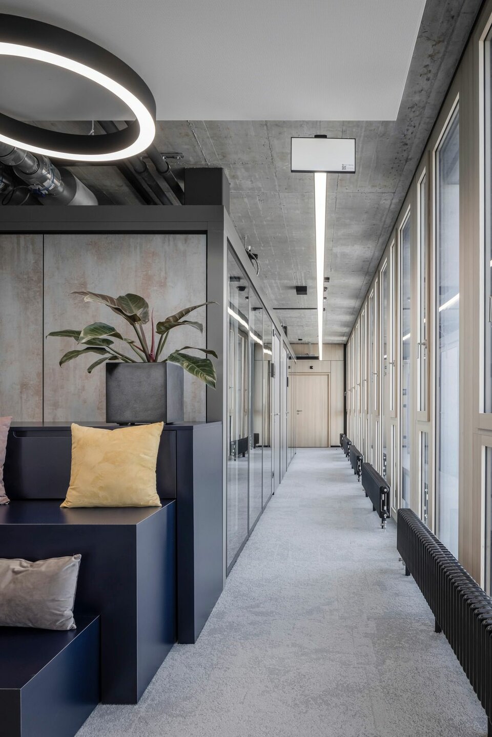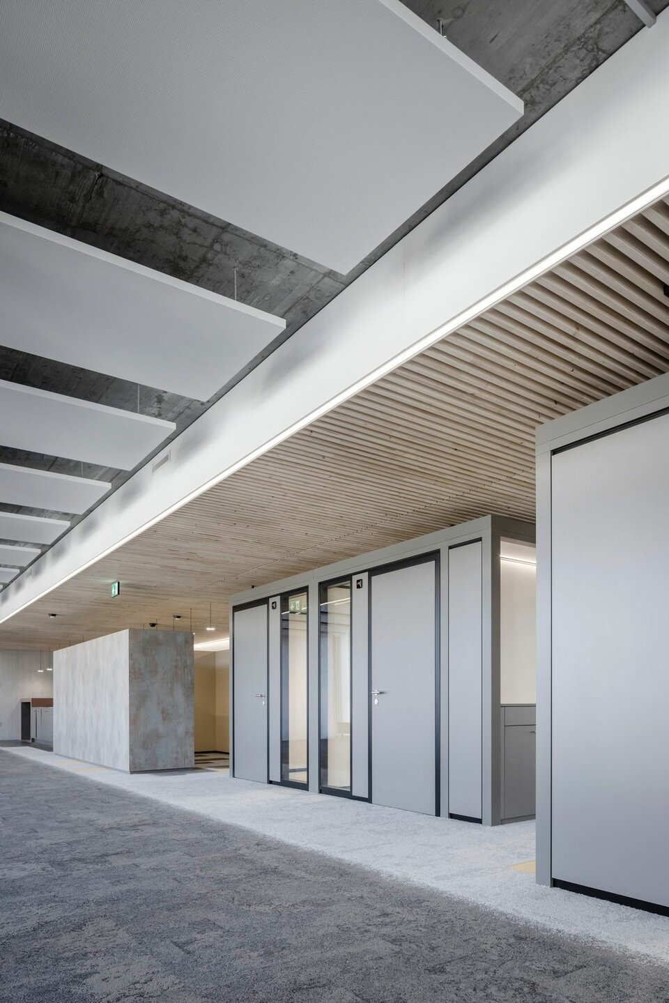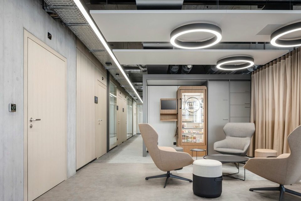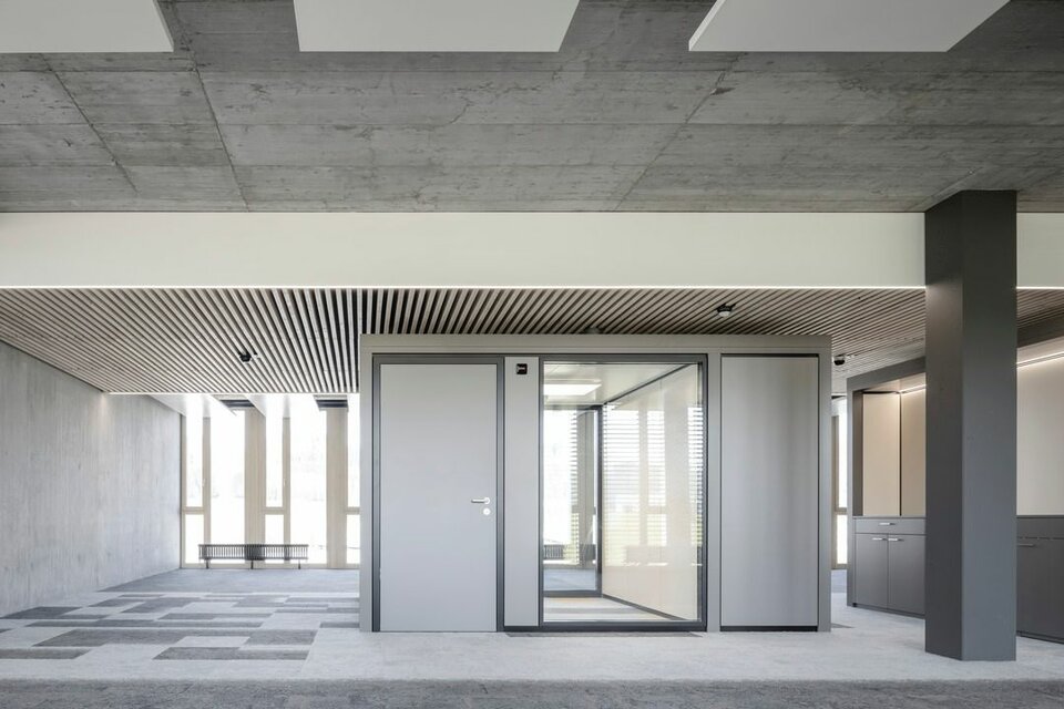 Lindner realised the fit-out for Zürich Versicherungs-Gesellschaft AG with partition wall, door and room-in-room systems: the full panel partition system Lindner Logic Timber – cladded with perforated real wood silver fir veneer – ensures good acoustics. It is complemented by Lindner Life Stereo 125 glass partitions framed by powder-coated aluminium profiles in black and by profiles veneered with real wood – also in silver fir. The glass partition wall system is Cradle to Cradle® Silver certified and thus takes account of the sustainability concept. Wooden door elements veneered with silver fir and supplemented by wooden block frames provide access to the different areas and round off the clear visual impression. A total of 18 identical Lindner Cubes offer additional space for meetings or concentrated work – including heated/chilled ceilings, optimal lighting and acoustics as well as copying areas at the front of the outer wall.