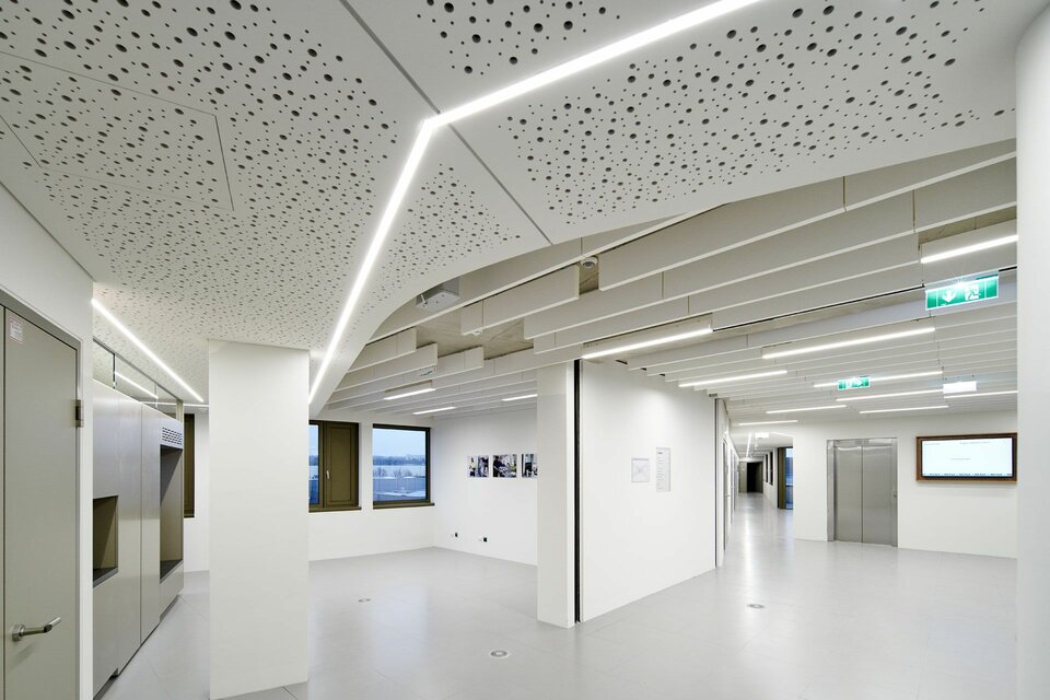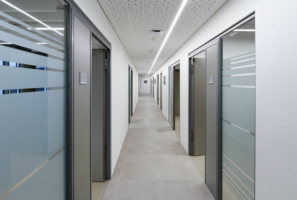 On behalf of the family Handler, Lindner GmbH, as the general contractor for the interior work, was not only responsible for the dry construction, but also supplied and installed double and hollow floor systems with various top coverings. On the ground floor, for example, a heavy-duty floor with Italian stone application was chosen; real wood parquet or linoleum can also be found in the various rooms, while in the sanitary rooms the floor systems were used in hydro design. In order to improve the acoustics of the office areas, Lindner installed 2,500 baffle ceilings. Individual offices were separated by Life pure glass partitions including matching doors.