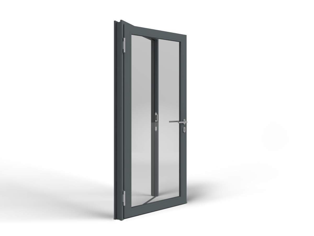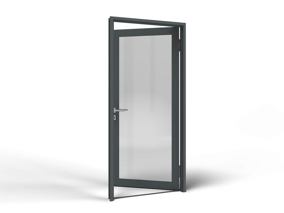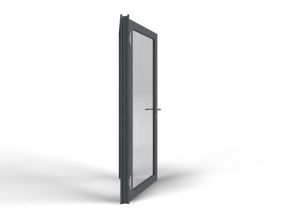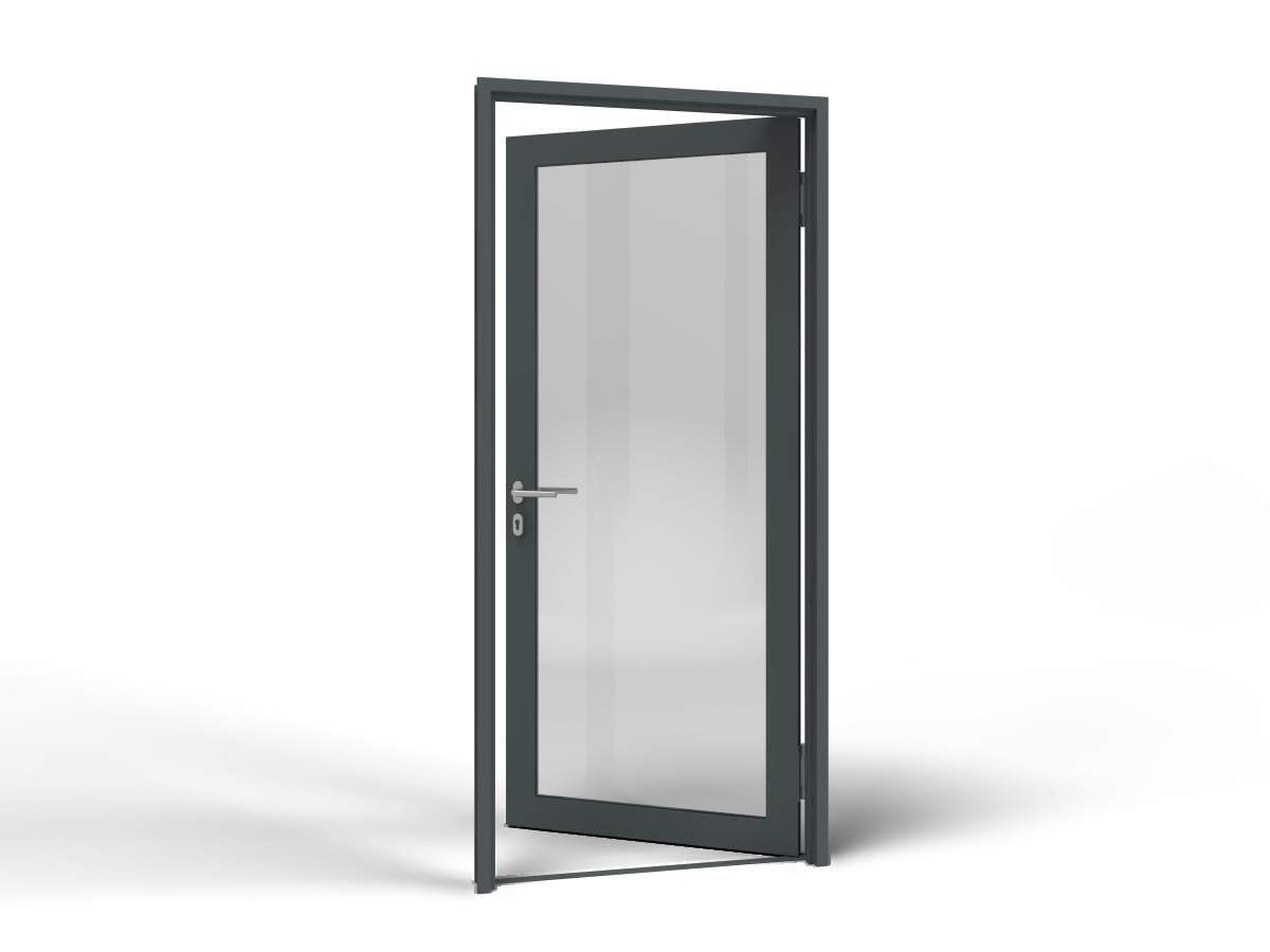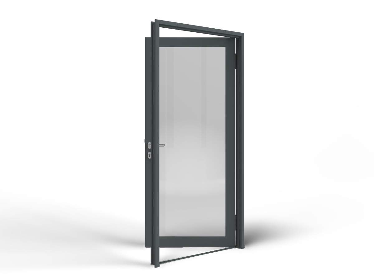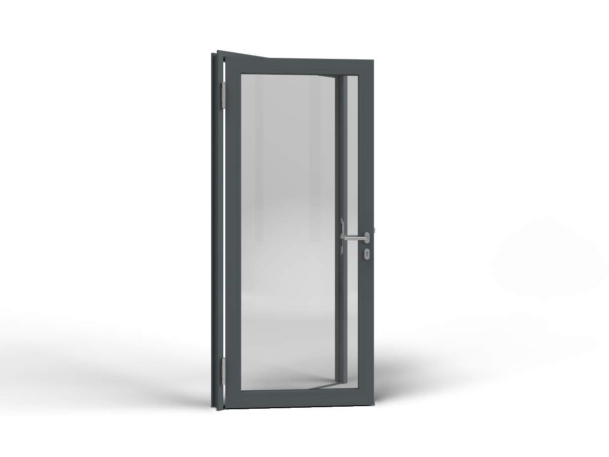 Elle combine un panneau vitré en verre de sécurité avec un cadre en aluminium assemblé en onglet. Cette porte est disponible en double vitrage, à la fois en version à un ou deux vantaux, pour répondre à vos besoins spécifiques.