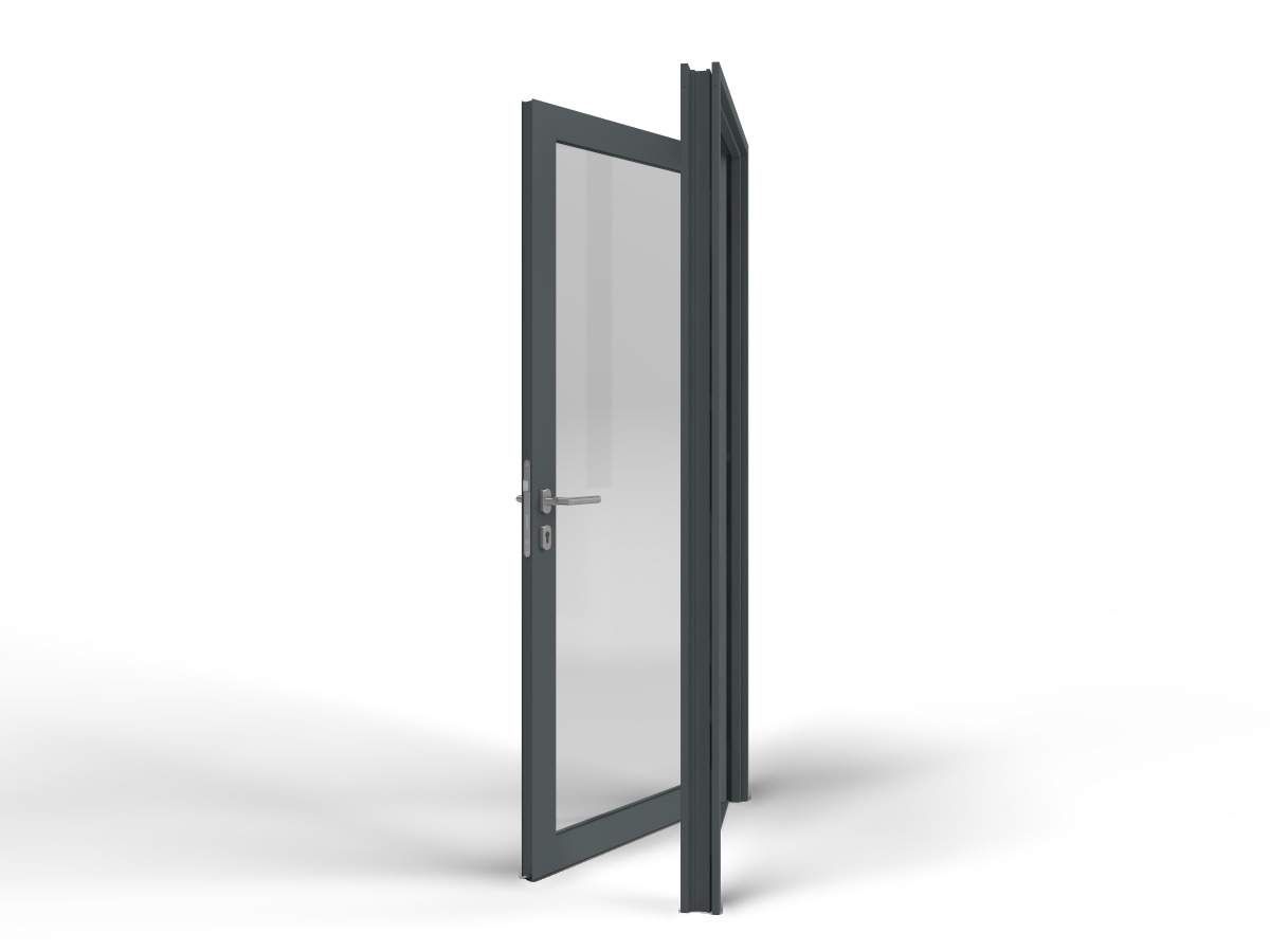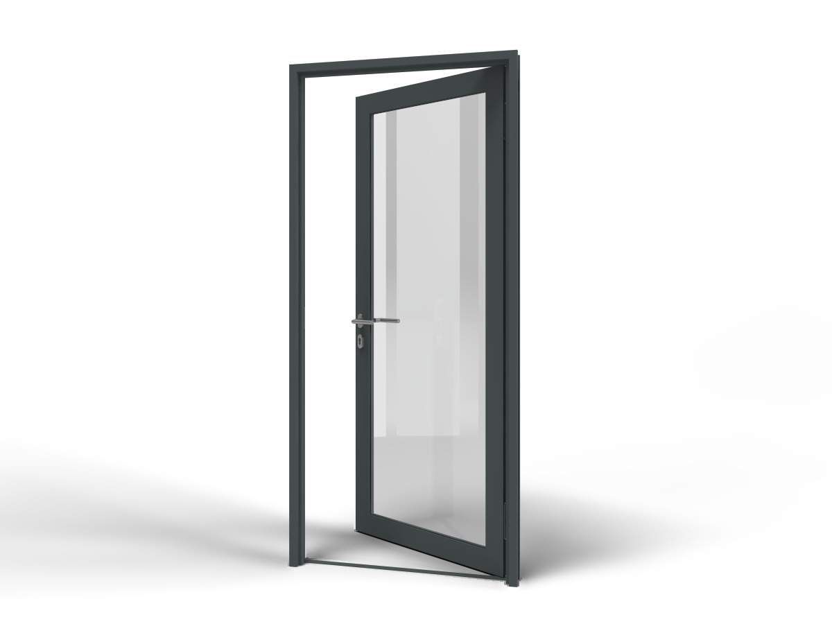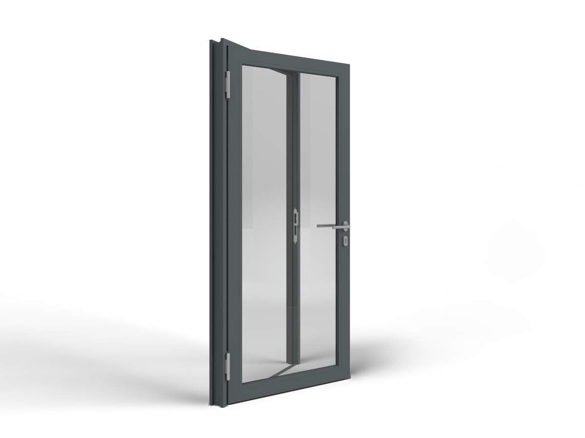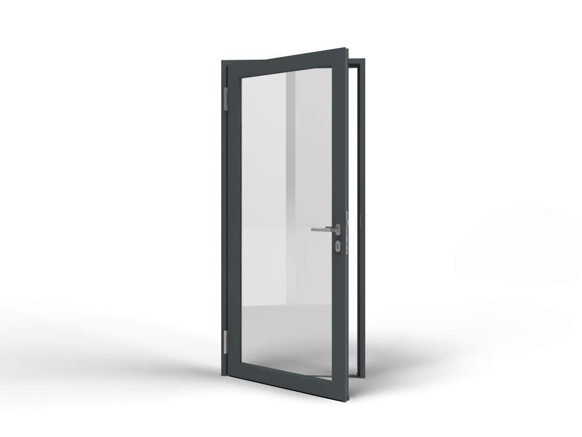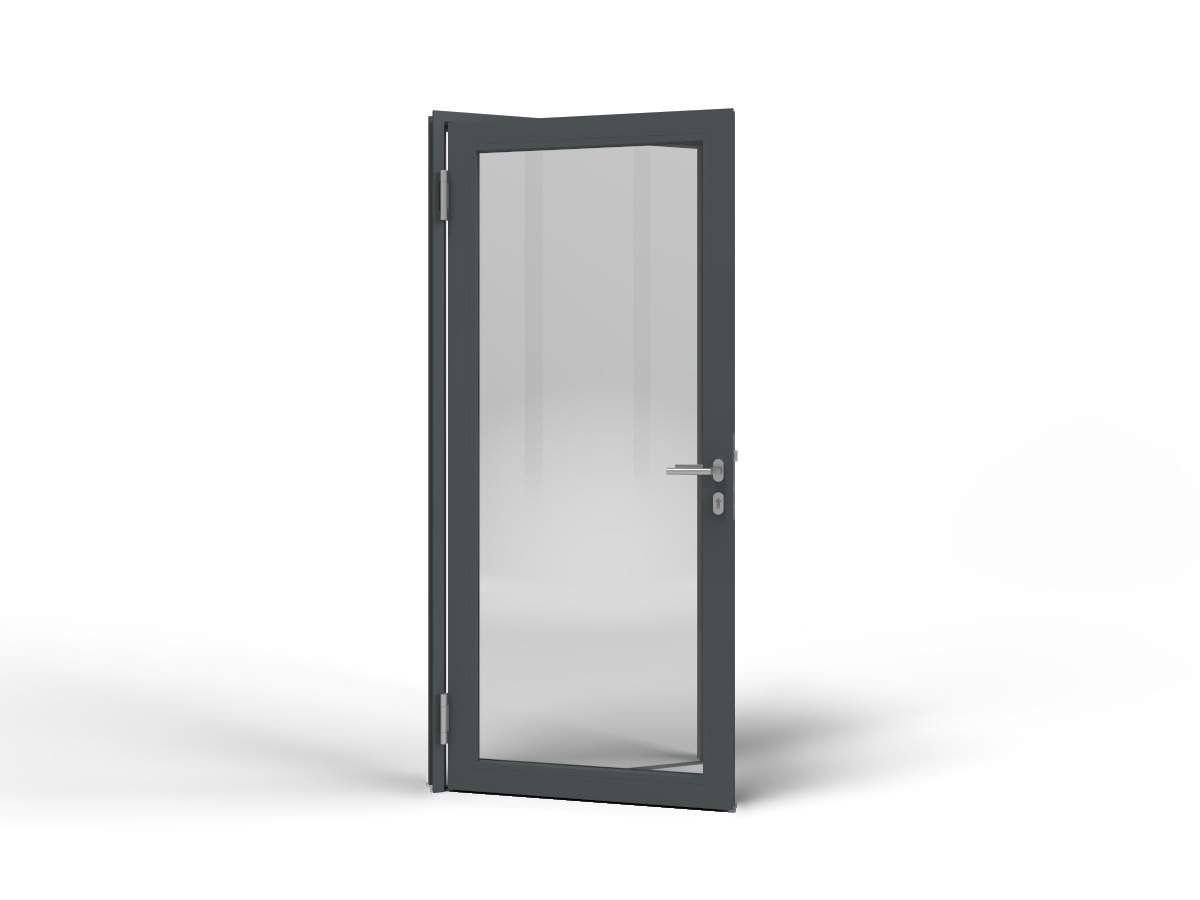 Elle combine un panneau vitré en verre de sécurité avec un cadre en aluminium assemblé en onglet. Cette porte est disponible en double vitrage, à la fois en version à un ou deux vantaux, pour répondre à vos besoins spécifiques.
