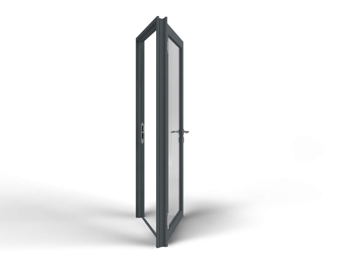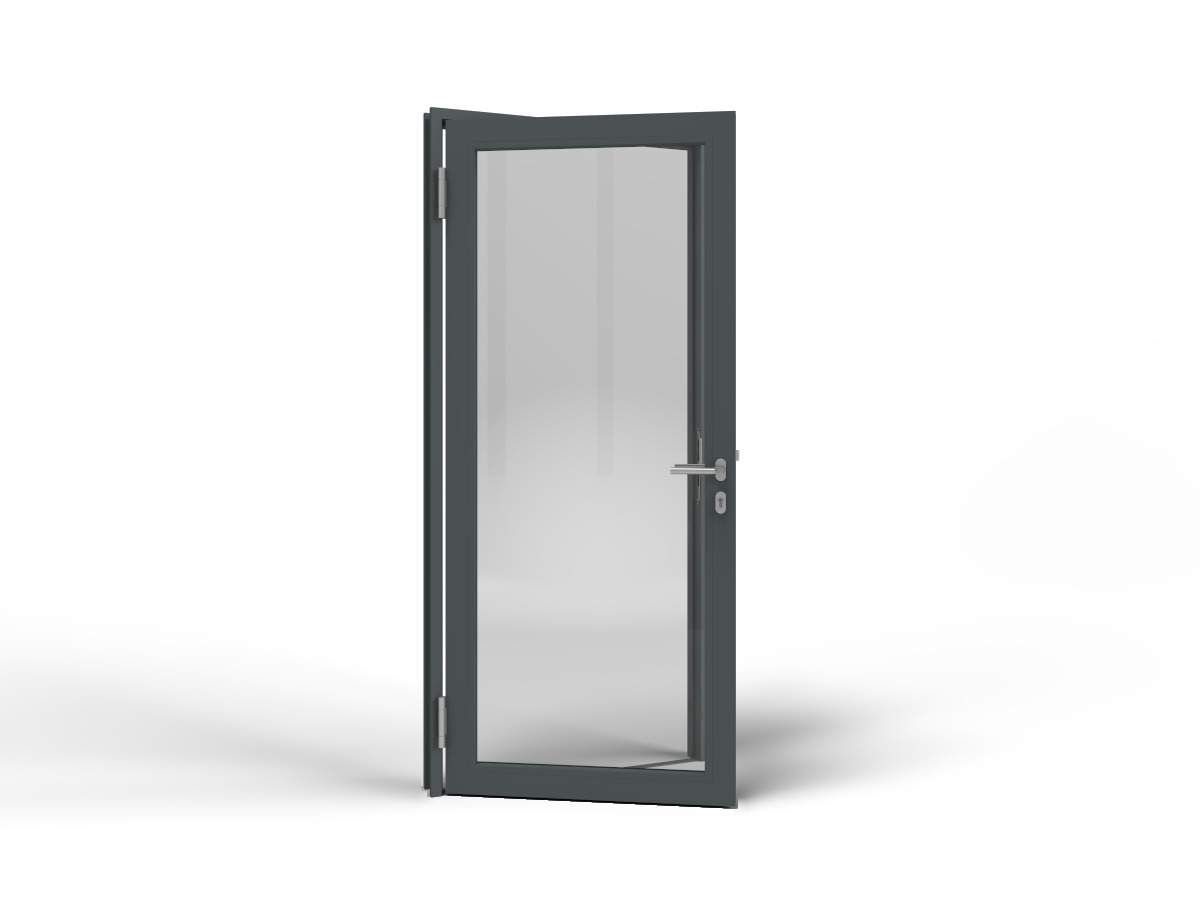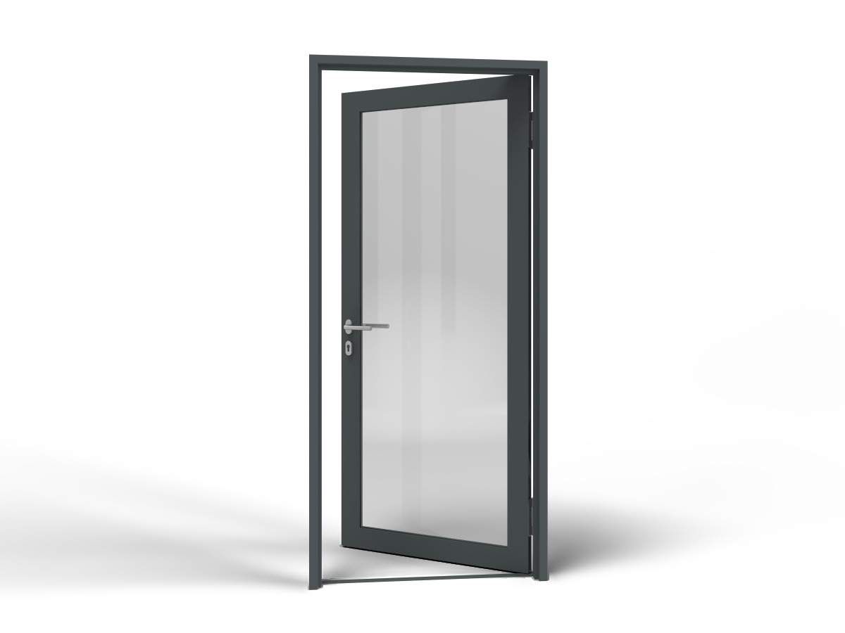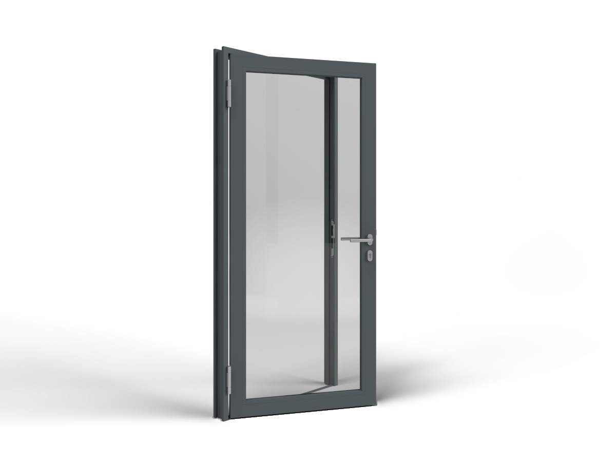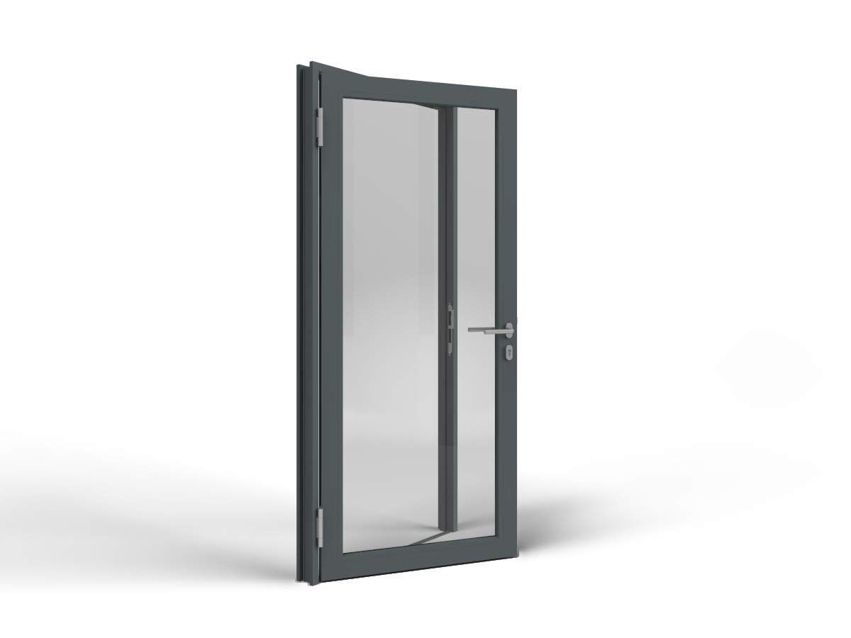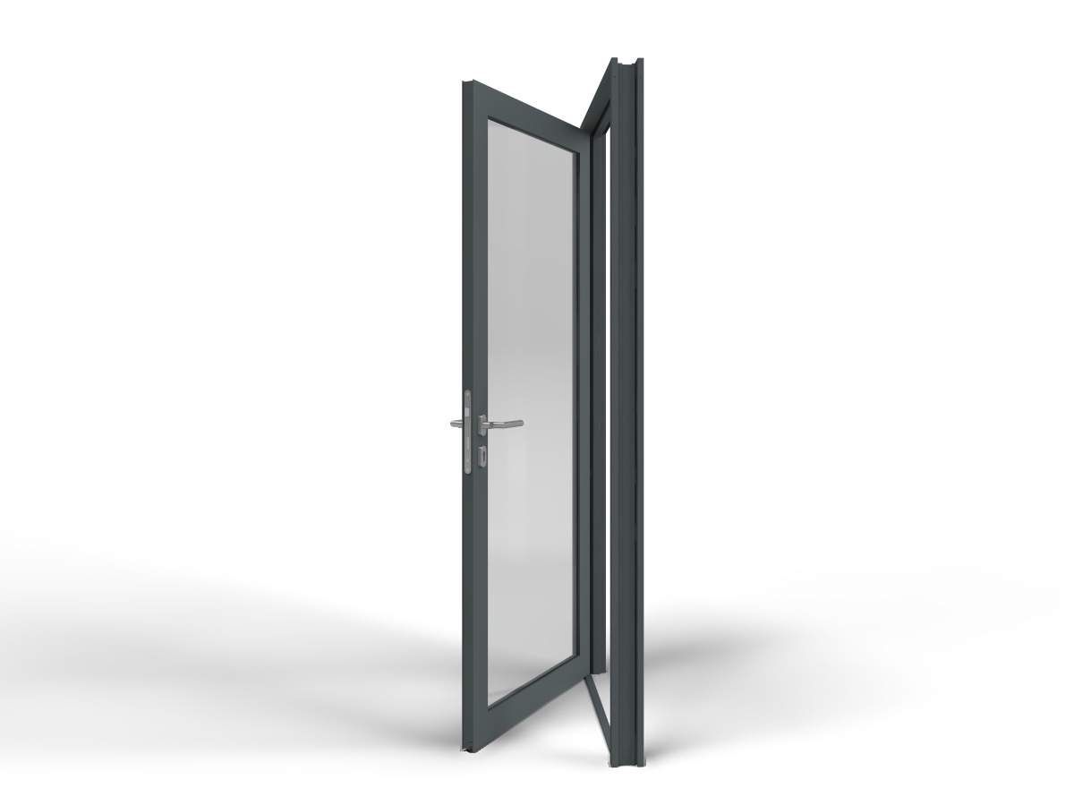 Elle combine un panneau vitré en verre de sécurité avec un cadre en aluminium assemblé en onglet. Cette porte est disponible en double vitrage, à la fois en version à un ou deux vantaux, pour répondre à vos besoins spécifiques.