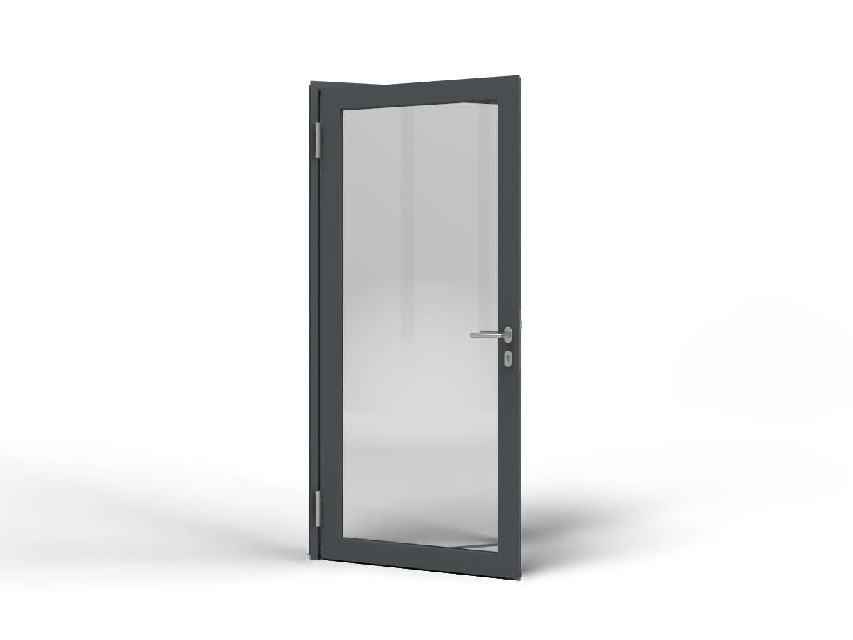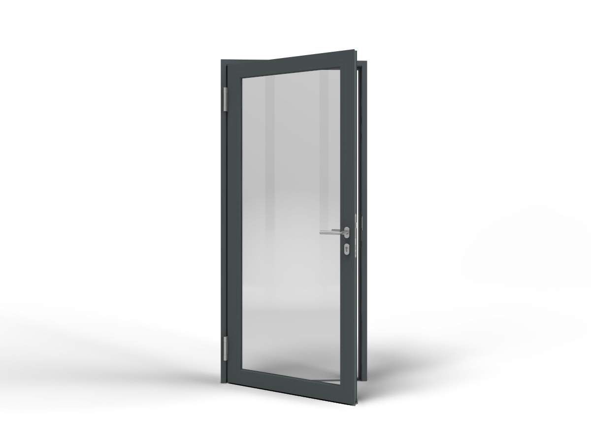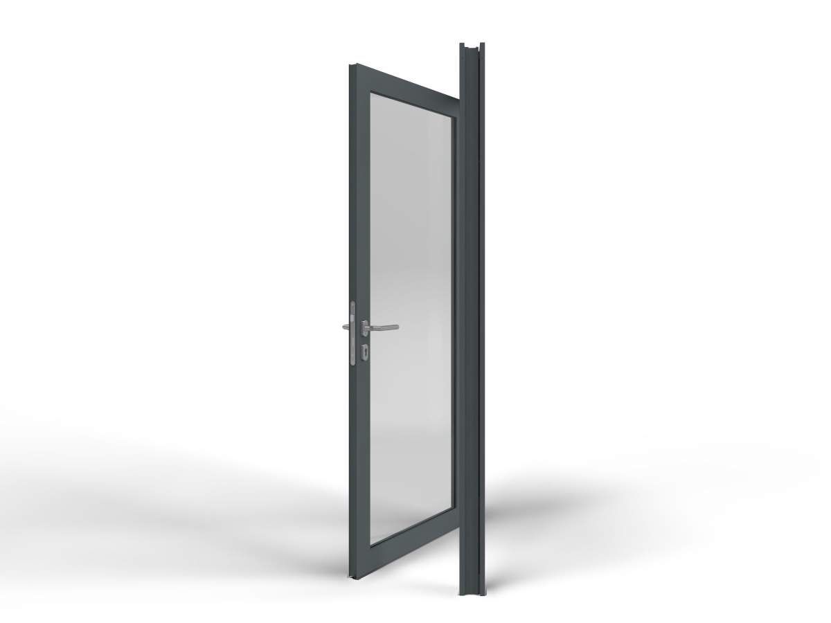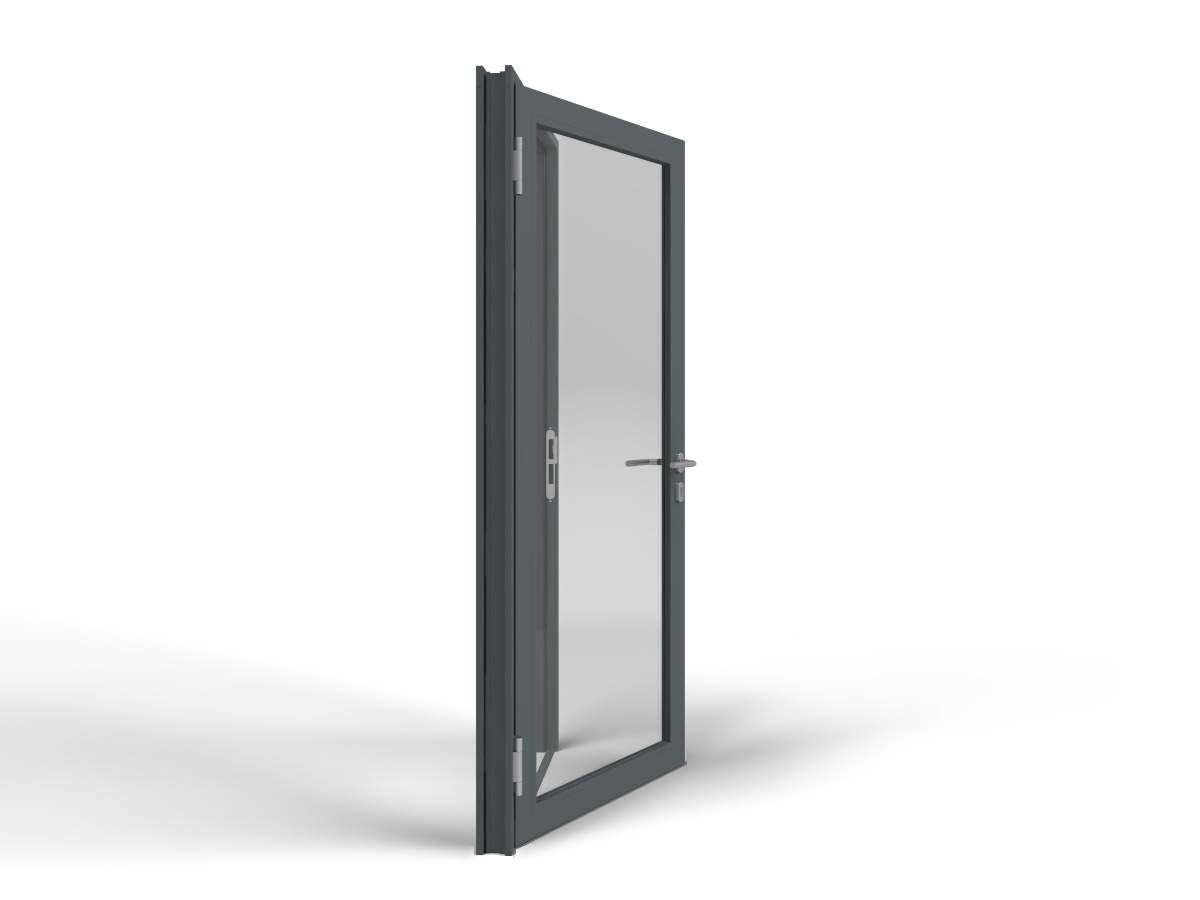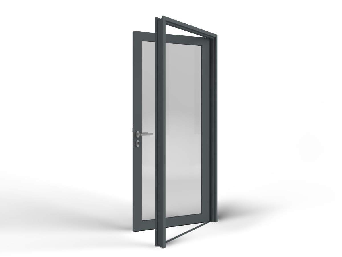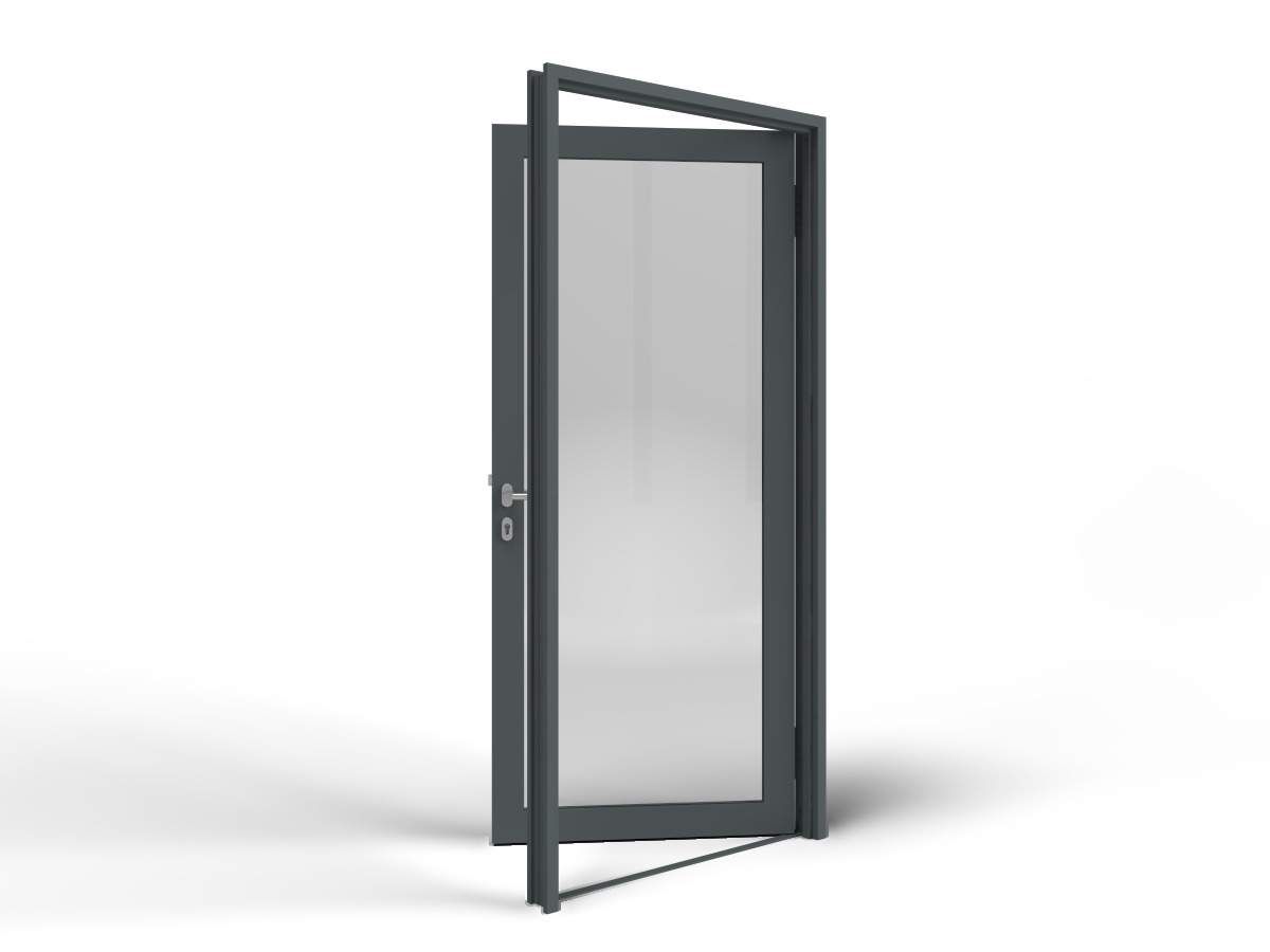 Elle combine un panneau vitré en verre de sécurité avec un cadre en aluminium assemblé en onglet. Cette porte est disponible en double vitrage, à la fois en version à un ou deux vantaux, pour répondre à vos besoins spécifiques.