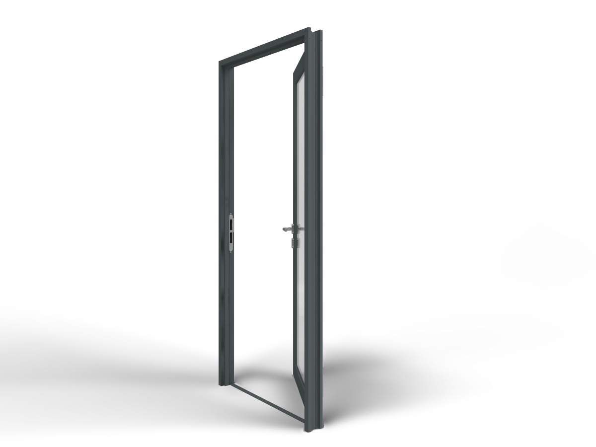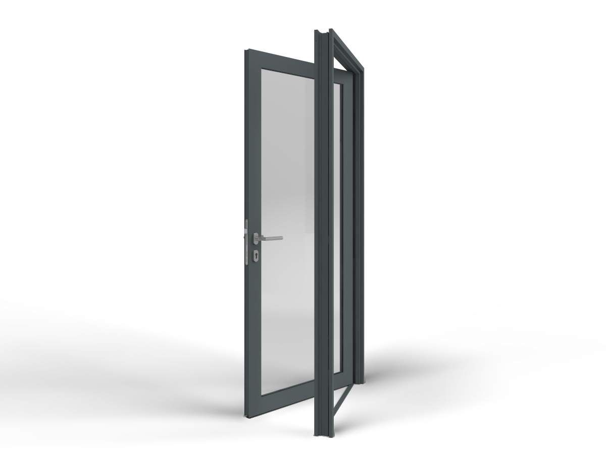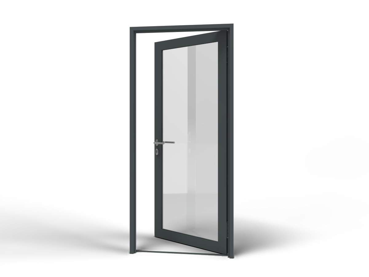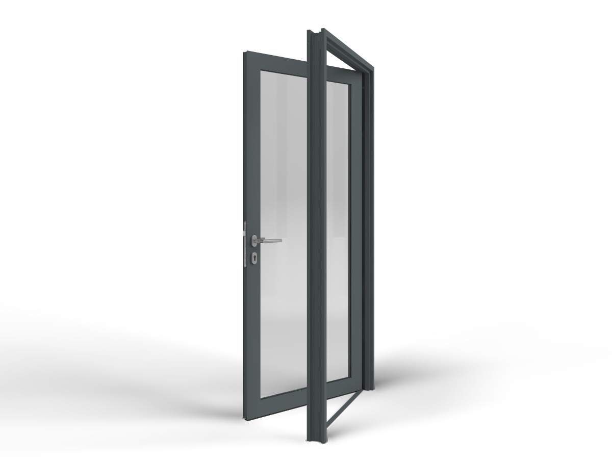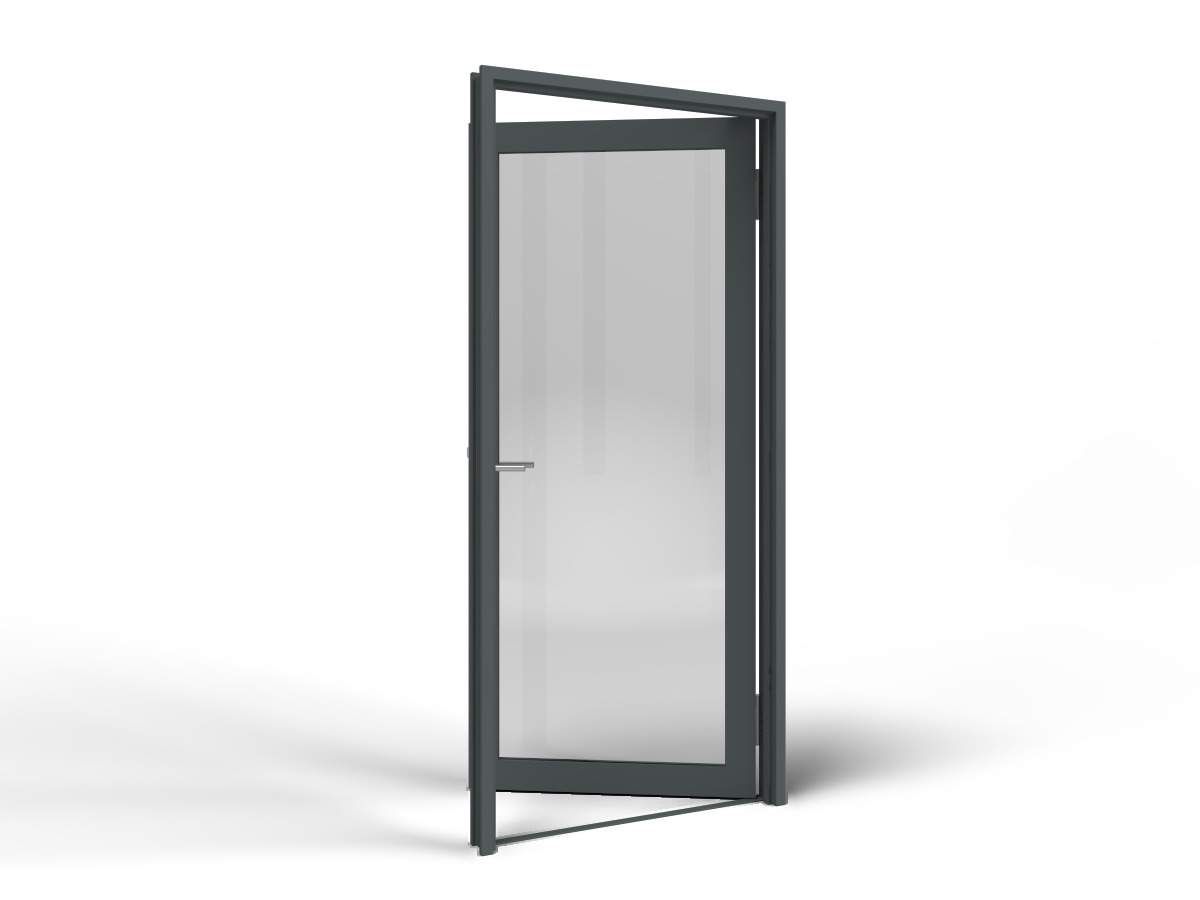 Elle combine un panneau vitré en verre de sécurité avec un cadre en aluminium assemblé en onglet. Cette porte est disponible en double vitrage, à la fois en version à un ou deux vantaux, pour répondre à vos besoins spécifiques.