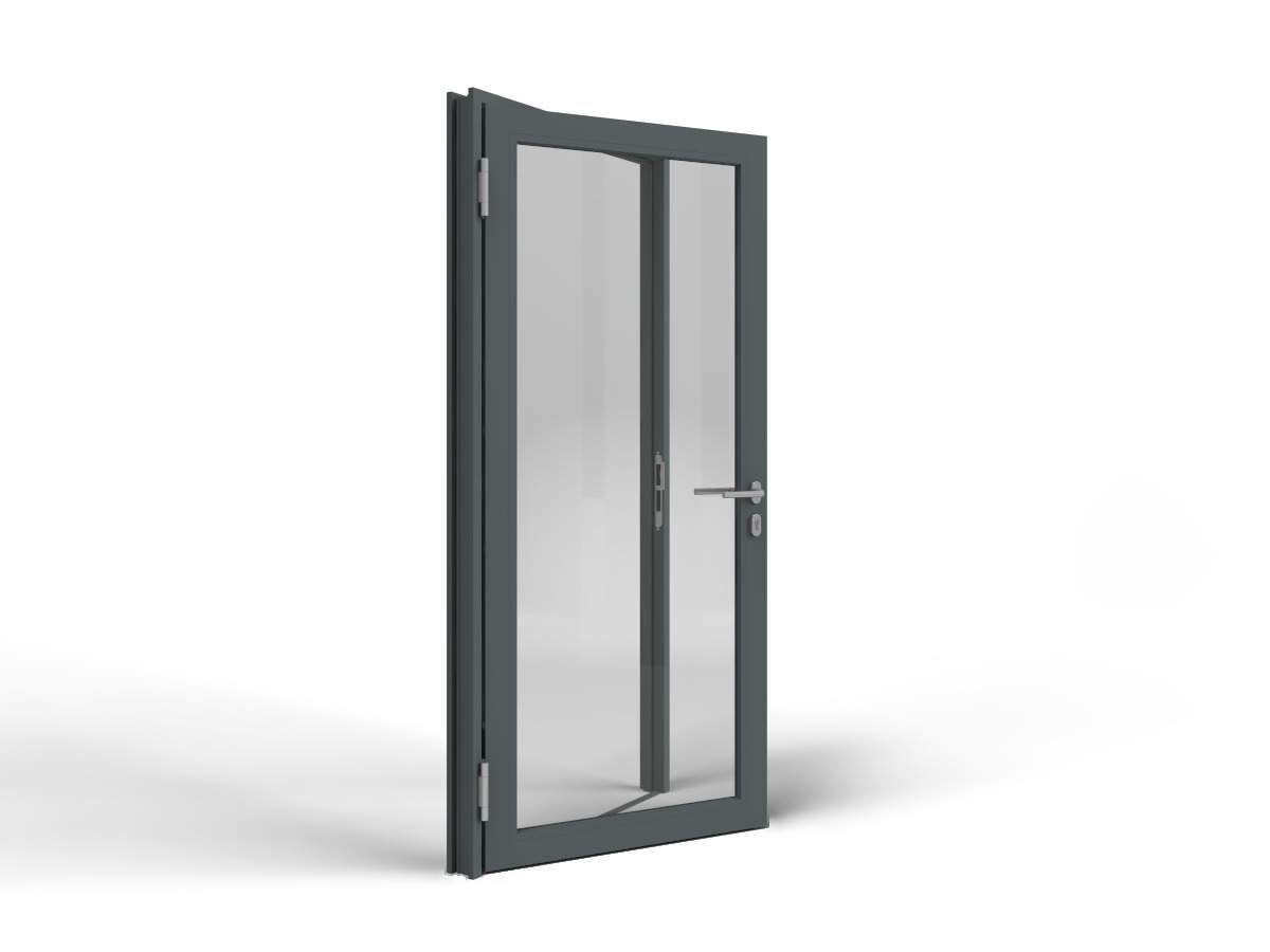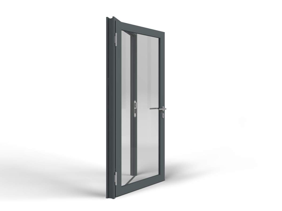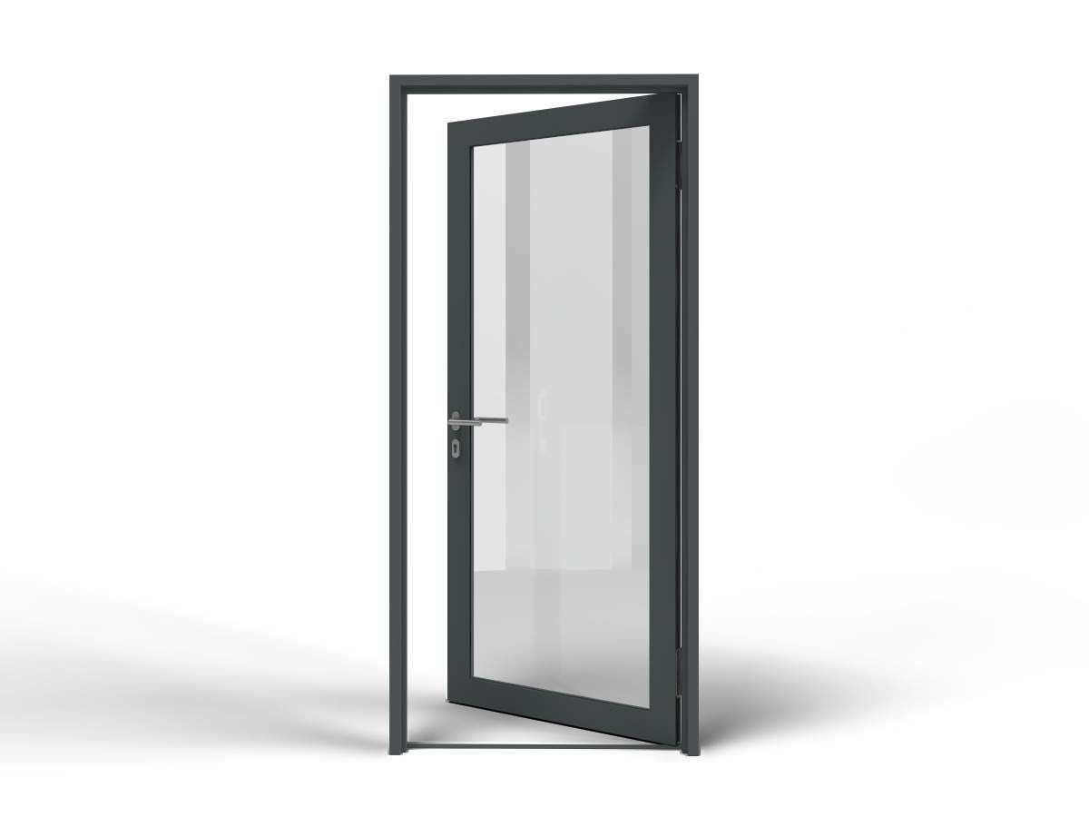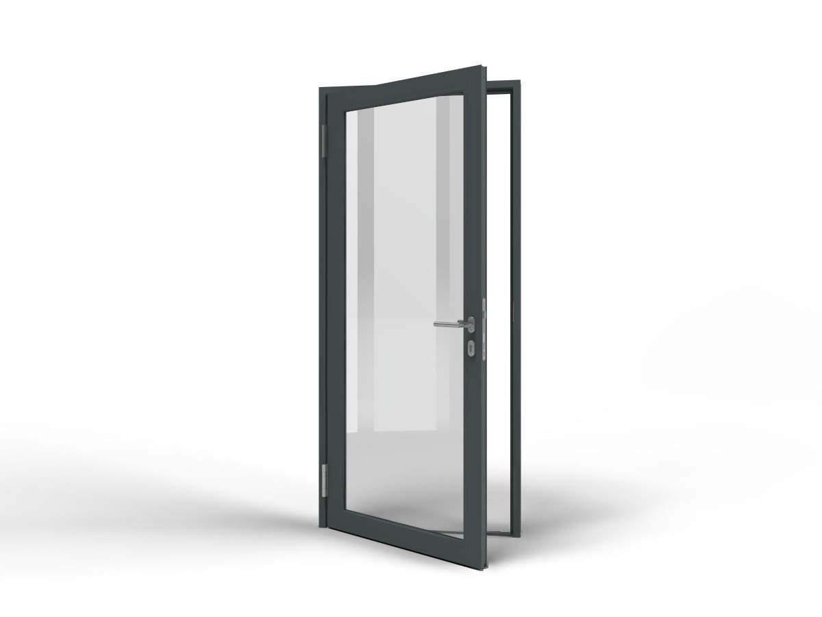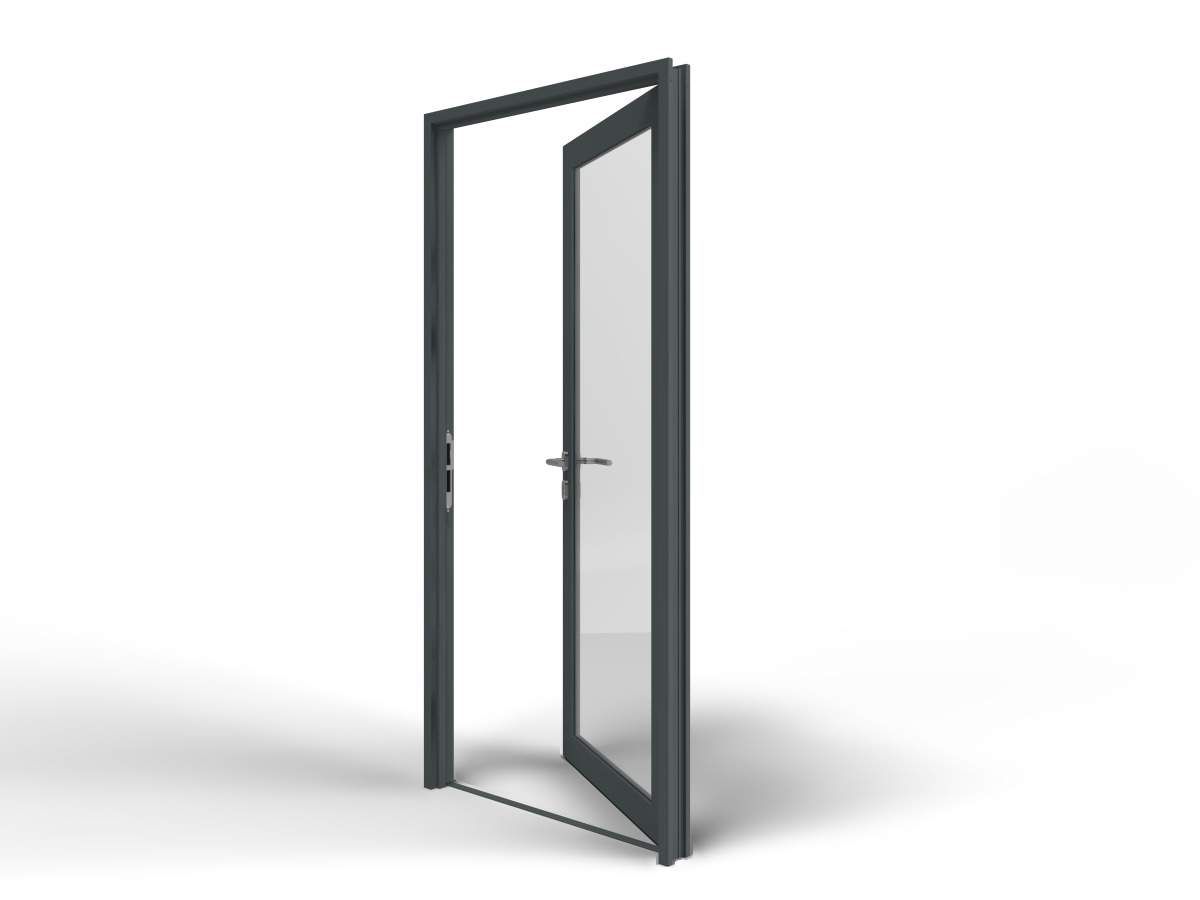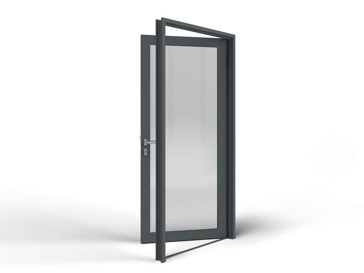 Elle combine un panneau vitré en verre de sécurité avec un cadre en aluminium assemblé en onglet. Cette porte est disponible en double vitrage, à la fois en version à un ou deux vantaux, pour répondre à vos besoins spécifiques.